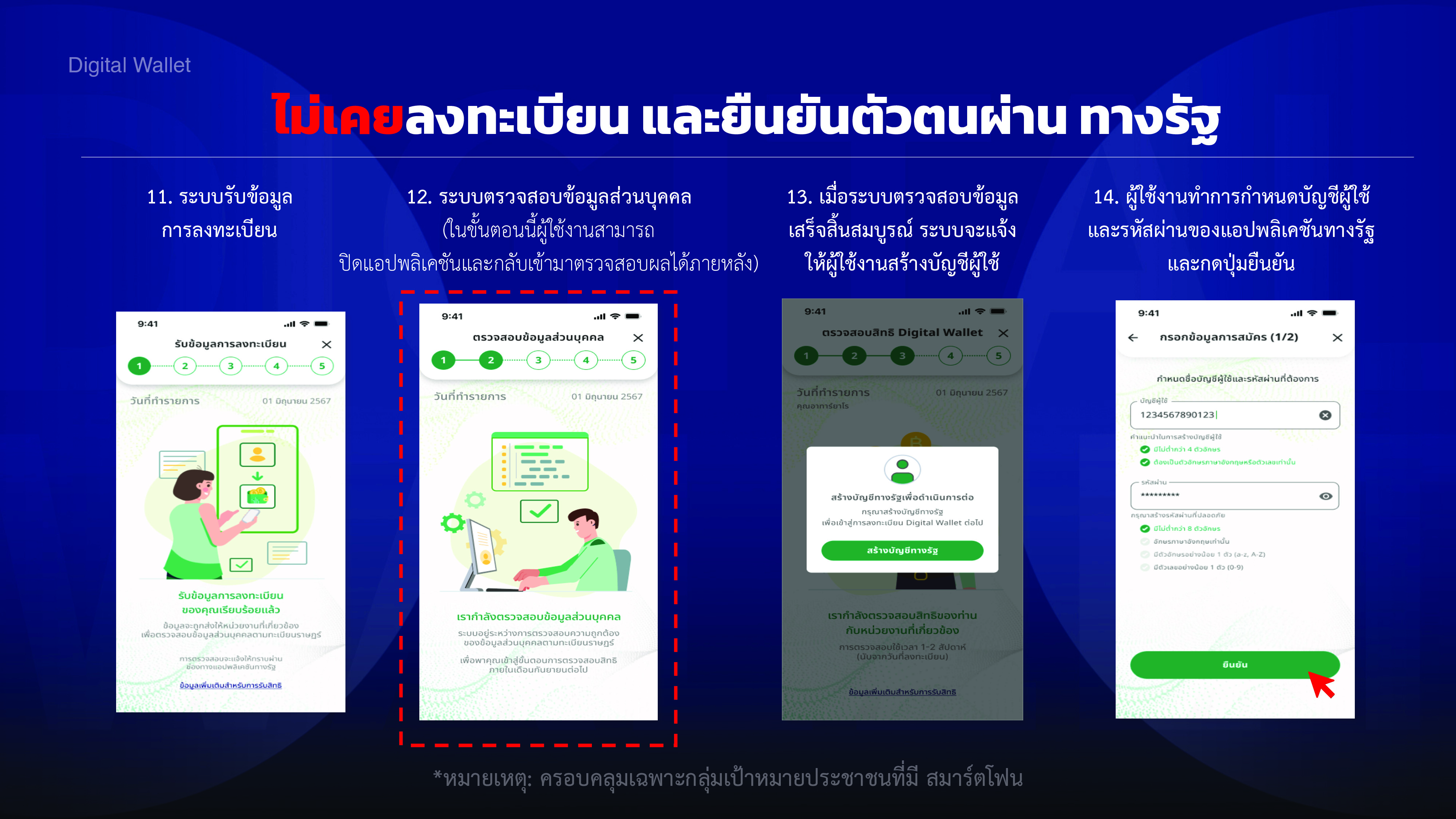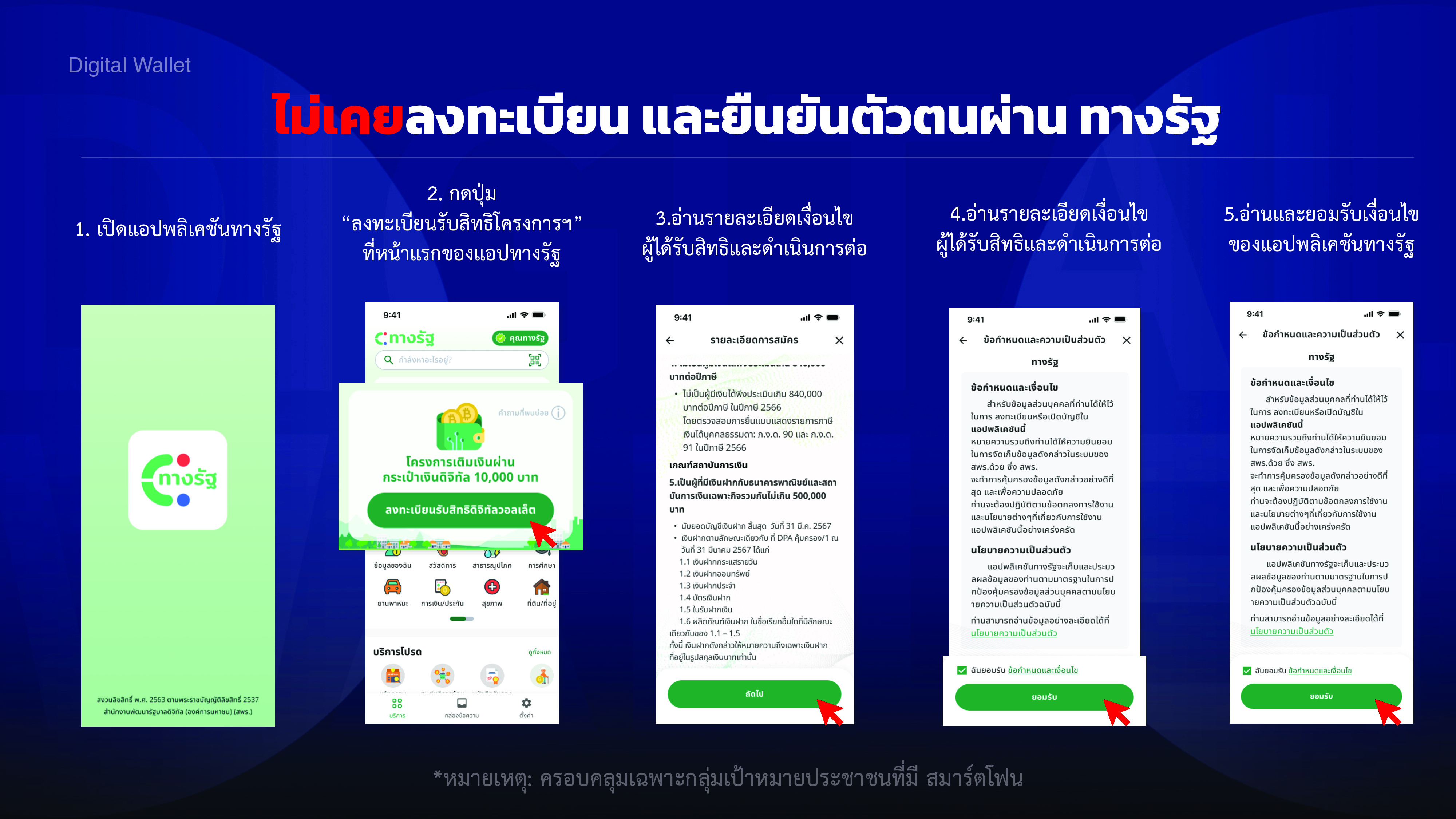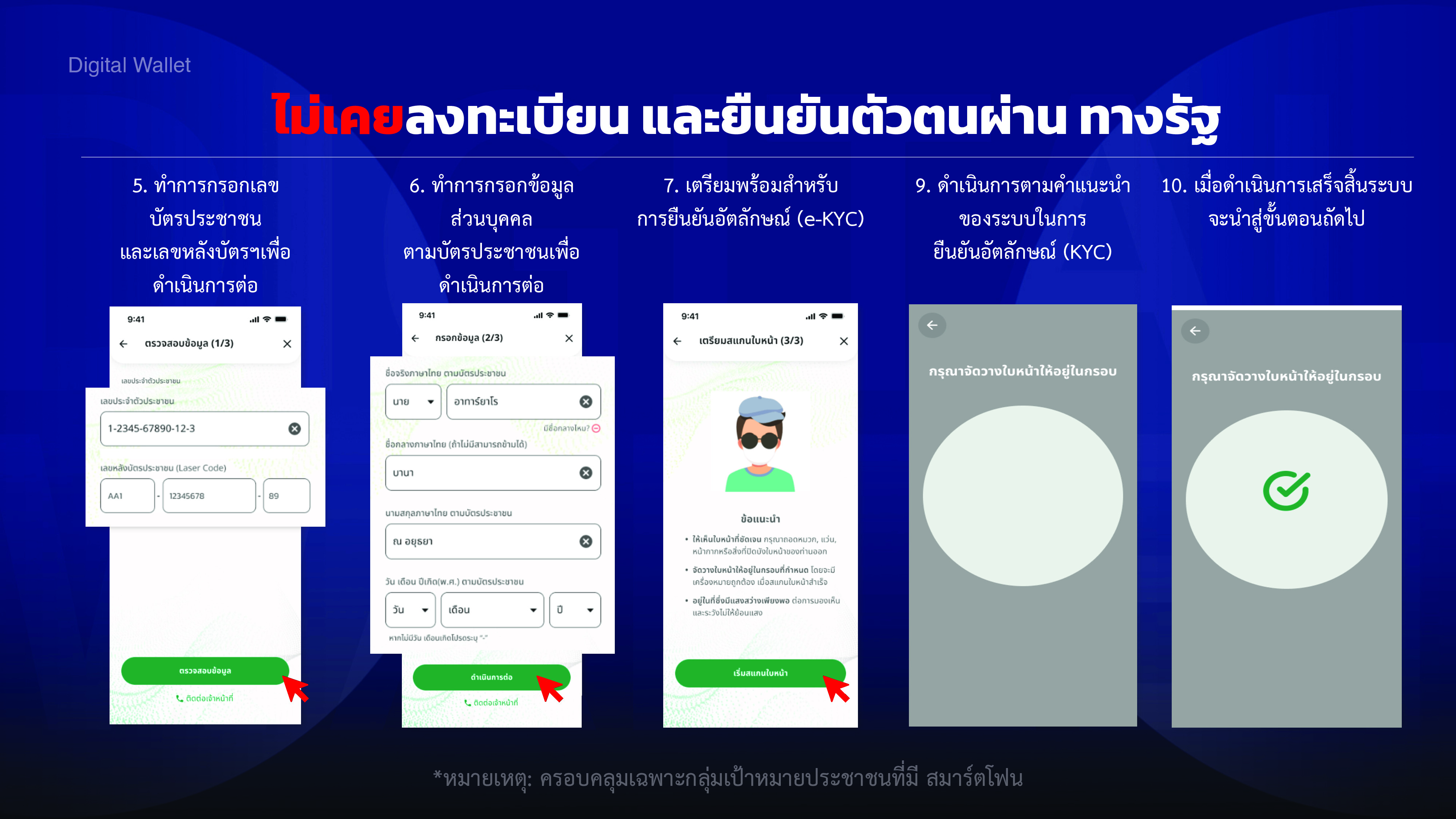 2.2 การลงทะเบียนประชาชนกลุ่มที่ไม่มีสมาร์ตโฟน ขณะนี้อยู่ระหว่างเตรียมการให้เข้าร่วมโครงการฯ ได้ในระยะต่อไป โดยจะให้มีการลงทะเบียนและยืนยันตัวตนผ่านช่องทางที่กำหนด (ระหว่างวันที่16 กันยายน – 15 ตุลาคม 2567) ซึ่งจะต้องมีการตรวจสอบคุณสมบัติ สถานะบุคคล และที่อยู่ตามทะเบียนบ้าน เช่นเดียวกับกลุ่มผู้มีสมาร์ตโฟน สำหรับส่วนของการใช้จ่ายนั้นอยู่ระหว่างการพิจารณาให้ใช้สิทธิผ่านบัตรประจำตัวประชาชน แต่การใช้สิทธิซื้อสินค้าจากร้านค้าจะทำได้ในวงแคบกว่าการใช้สิทธิของประชาชนกลุ่มที่มีสมาร์ตโฟน ดังนั้น การลงทะเบียนผ่านสมาร์ตโฟนจะสามารถใช้งานได้สะดวกกว่า จึงแนะนำให้พยายามลงทะเบียนผ่านทางสมาร์ตโฟนก่อนเป็นอันดับแรก