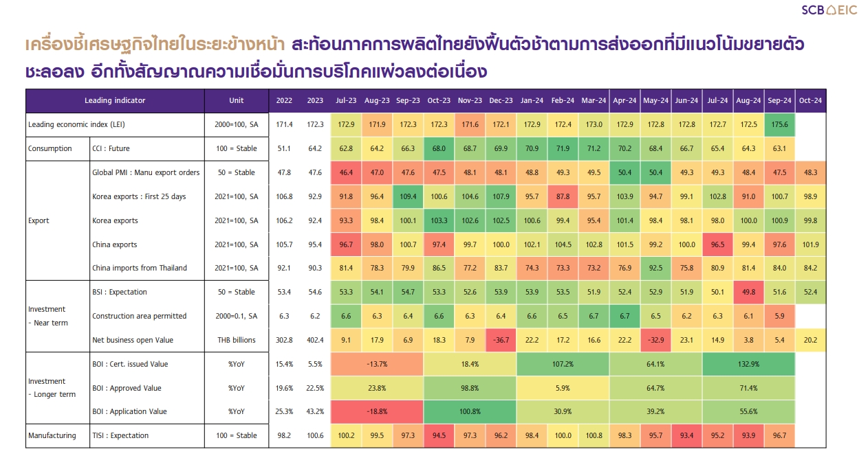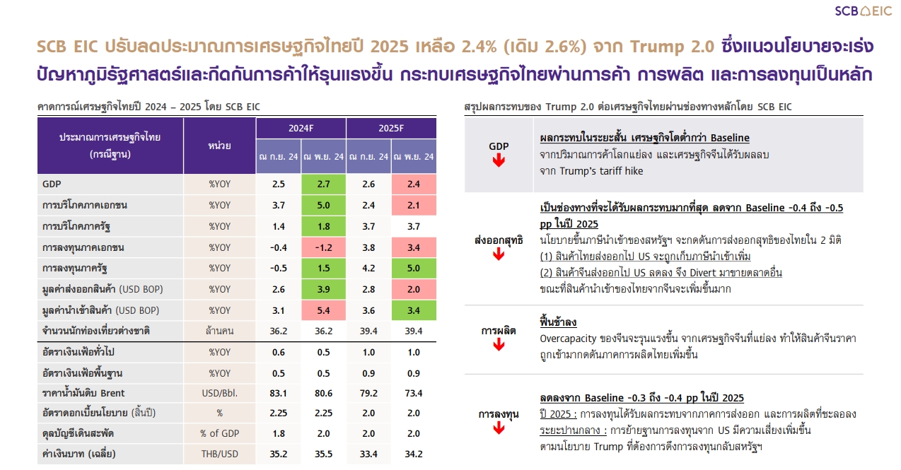 อย่างไรก็ดี SCB EIC ปรับมุมมองเศรษฐกิจไทยปี 2025 ลดลงเหลือ 2.4% (เดิม 2.6%) จากผลกระทบนโยบาย Trump 2.0 ซึ่งแนวนโยบายจะเร่งให้เกิดปัญหาภูมิรัฐศาสตร์และทำให้เกิดการกีดกันการค้าที่รุนแรงขึ้น ส่งผลกระทบผ่านการค้า การผลิต และการลงทุนเป็นหลัก โดยนโยบายกีดกันการค้าของ Trump 2.0 จะทำให้ไทยมีแนวโน้มนำเข้าสินค้าจีนและขาดดุลการค้ากับจีนมากขึ้น นอกจากนี้ ยังต้องจับตาประเด็น Unfair trade กับสหรัฐฯ เพราะไทยมีแนวโน้มเกินดุลการค้ากับสหรัฐฯ มากขึ้นต่อเนื่อง และอาจเข้าข่ายเกณฑ์ด้านอื่นอีกด้วย สำหรับการลงทุนภาคเอกชนไทยในระยะข้างหน้าจะมีความเสี่ยงด้านต่ำเพิ่มขึ้นจากความไม่แน่นอนของนโยบายการค้าของ Trump 2.0 ซึ่งจะทำให้ธุรกิจที่ต้องการย้ายฐานการผลิตจากจีนชะลอแผนการลงทุนเพื่อรอความชัดเจนของนโยบาย Trump ที่อาจขยายนโยบายกีดกันการค้าไปกลุ่มประเทศอื่น ๆ ด้วย และอัตราภาษีนำเข้าที่จะเก็บเพิ่มยังมีความไม่แน่นอนสูง ทั้งนี้เศรษฐกิจไทยจะมีนโยบายการคลังที่คาดว่าจะทยอยออกมากระตุ้นเศรษฐกิจและช่วยบรรเทาผลกระทบจาก Trump 2.0 ได้บางส่วนในปีหน้า