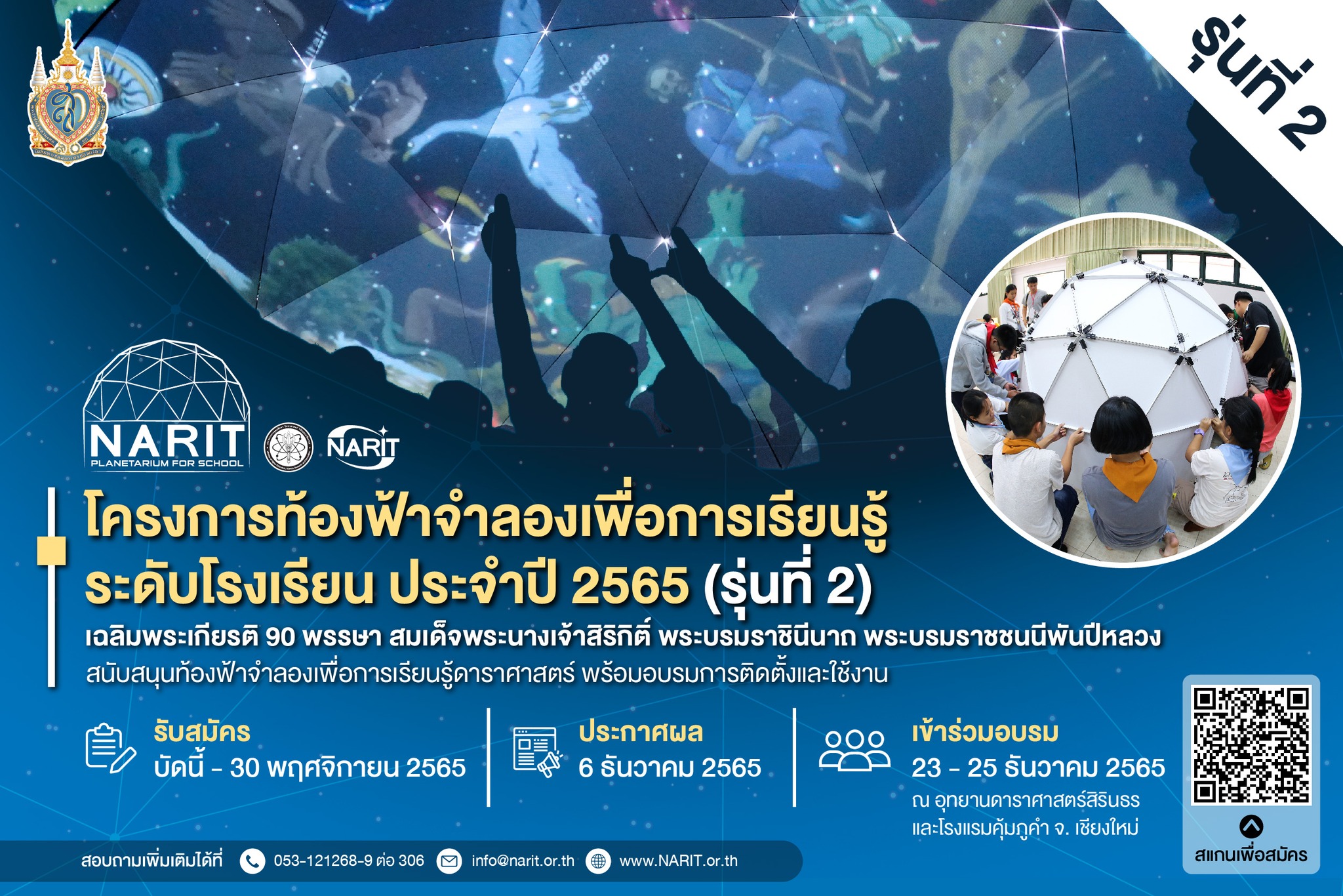 สถาบันวิจัยดาราศาสตร์แห่งชาติ (องค์การมหาชน) (สดร.) กระทรวงการอุดมศึกษา วิทยาศาสตร์ วิจัยและนวัตกรรม (อว.) เดินหน้าโครงการท้องฟ้าจำลองเพื่อการเรียนรู้ระดับโรงเรียน ประจำปี 2565 รุ่นที่ 2 มอบชุดท้องฟ้าจำลอง DIY ระดับโรงเรียนอีก 50 ชุด เฉลิมพระเกียรติสมเด็จพระนางเจ้าสิริกิติ์ พระบรมราชินีนาถ พระบรมราชชนนีพันปีหลวง เนื่องในโอกาสมหามงคลเฉลิมพระชนมพรรษา 90 พรรษา เชิญชวนโรงเรียนที่สนใจสมัครเข้าร่วมโครงการได้ตั้งแต่บัดนี้ – 30 พฤศจิกายน 2565