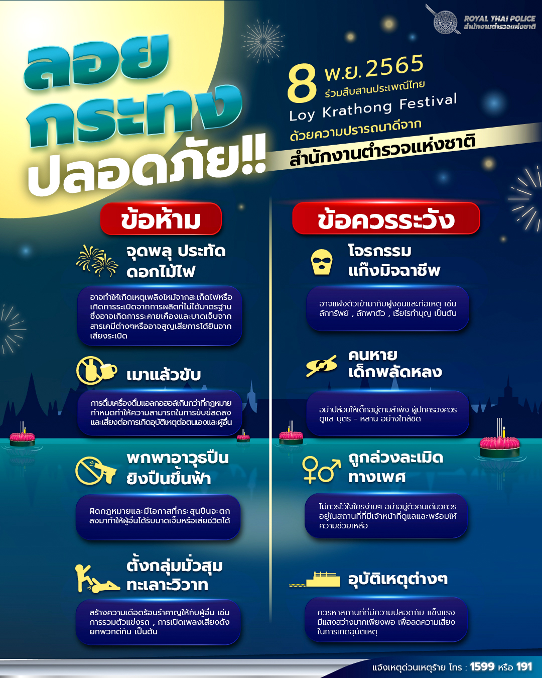 ผบ.ตร.ได้กล่าวถึงความพร้อมในการดูแลความเรียบร้อยในช่วงเทศกาลลอยกระทง ว่า “ได้สั่งการให้ทุกหน่วย ทุกพื้นที่ ที่มีการจัดงานประเพณีลอยกระทง เพิ่มความเข้มดูแลความปลอดภัยในชีวิตและทรัพย์สินของประชาชน และนักท่องเที่ยว โดยใช้กำลังเจ้าหน้าที่ตำรวจพื้นที่ ตำรวจท่องเที่ยว และตำรวจน้ำ กว่า 20,000 นาย ดูแลรักษาความปลอดภัยงานลอยกระทง