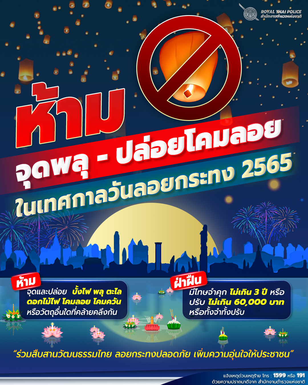 ผบ.ตร. กล่าวต่อว่า ขอความร่วมมือประชาชนเล่นลอยกระทงแบบสร้างสรรค์ สืบสานประเพณีไทย สร้างวัฒนธรรมที่ดีของคนไทยสู่สายตานักท่องเที่ย เตือนการเล่นดอกไม้เพลิง พลุ ประทัด โคมลอย หรือวัตถุอื่นใดที่คล้ายคลึงกันขึ้นไปสู่อากาศ จะมีความผิดตามคำสั่ง หน.คสช. ที่ 27/59 มีโทษจำคุกไม่เกิน 3 ปี หรือปรับไม่เกิน 60,000 บาท หรือทั้งจำทั้งปรับ และต้องชดใช้ค่าเสียหายในทางแพ่งอีกด้วย รวมทั้งการยิงปืนขึ้นฟ้าโดยไม่มีเหตุอันควร การดื่มเครื่องดื่มแอลกอฮอล์บนทาง ในขณะขับขี่ หรือโดยสาร ที่นำมาซึ่งความสูญเสียทุกปี ผู้กระทำต้องรับโทษทางอาญา