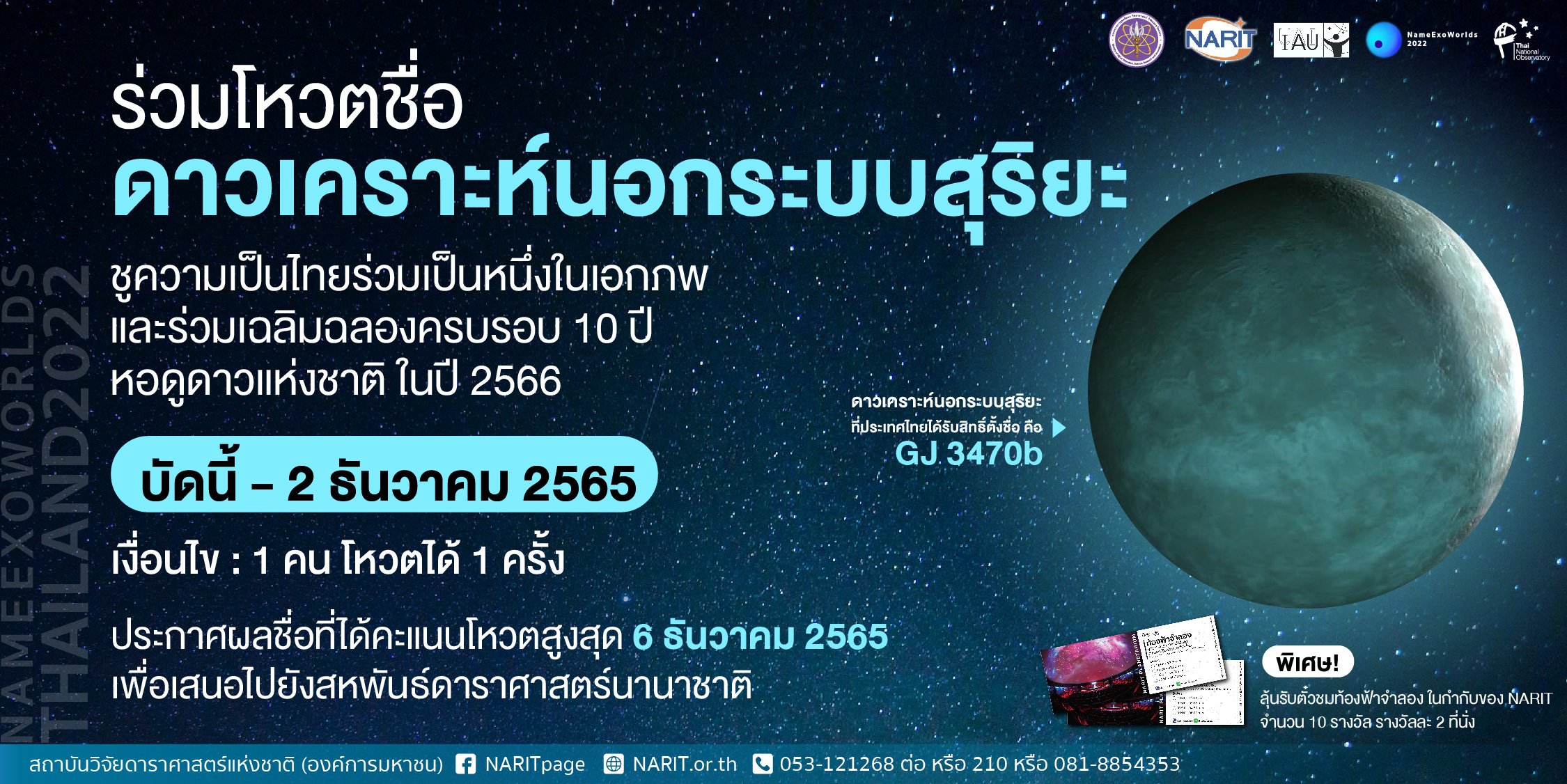 จึงขอเชิญชวนประชาชนร่วมโหวตชื่อไทยให้ดาวเคราะห์นอกระบบสุริยะ เพื่อเสนอไปยังสหพันธ์ดาราศาสตร์นานาชาติเห็นชอบ และประกาศใช้อย่างเป็นทางการต่อไป ร่วมโหวตชื่อได้ที่ https://bit.ly/NameExoWorldTH2022-Vote พร้อมลุ้นรับตั๋วชมท้องฟ้าจำลองในกำกับของสถาบันวิจัยดาราศาสตร์แห่งชาติ (องค์การมหาชน) จำนวน 10 รางวัล รางวัลละ 2 ที่นั่ง ตั้งแต่บัดนี้ – 2 ธันวาคม 2565
