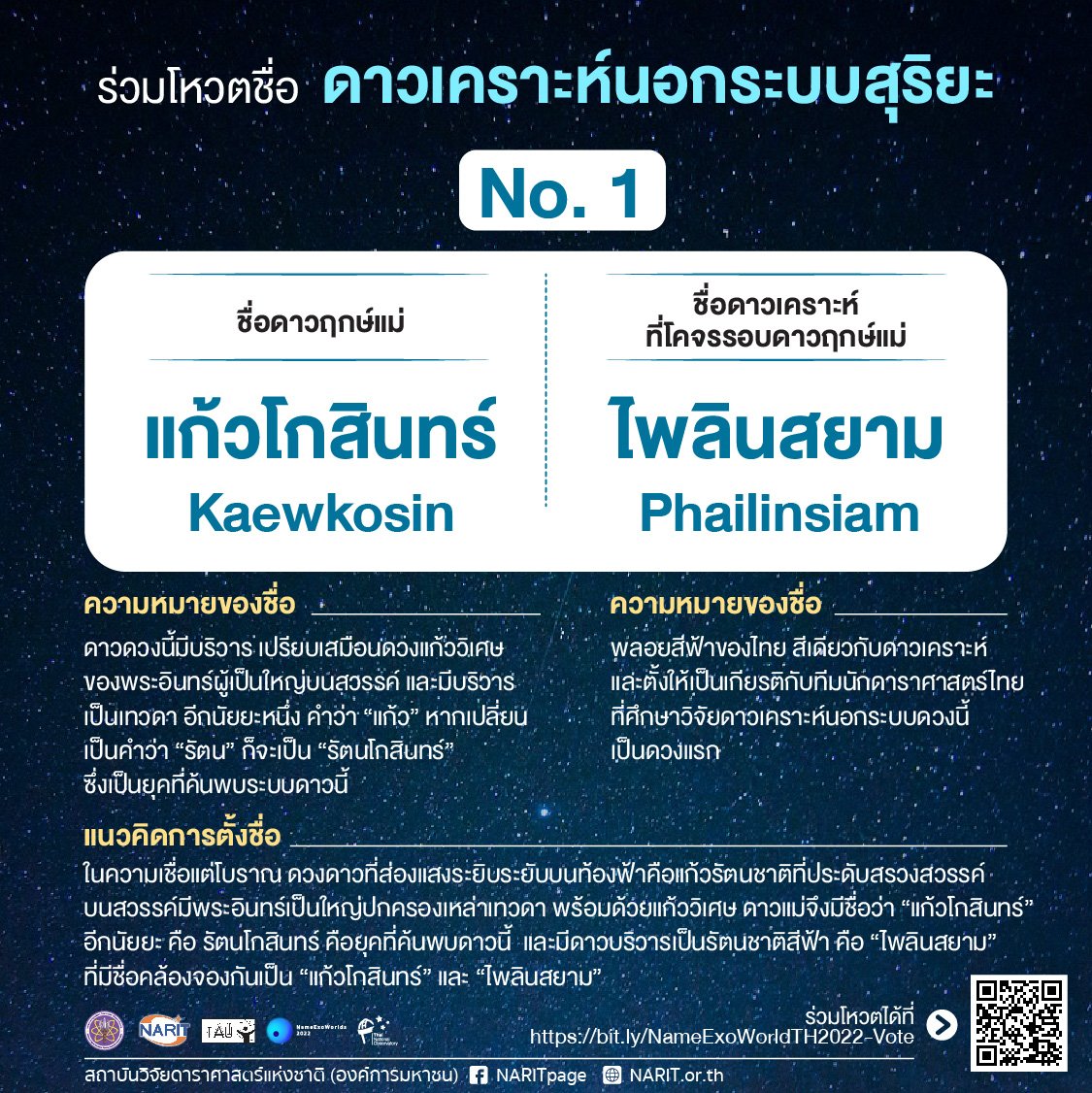 ร่วมเสนอชื่อไทยกว่า 340 ชื่อ จากนั้นคณะกรรมการผู้ทรงคุณวุฒิได้พิจารณาคัดเลือกคู่ชื่อดาวฤกษ์แม่ – ดาวเคราะห์นอกระบบสุริยะ ที่มีคุณสมบัติครบถ้วนตามเกณฑ์ที่กำหนด จำนวน 2 ชื่อ เพื่อให้ประชาชนไทย