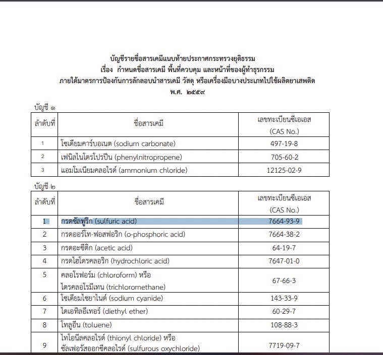 นอกจากนี้ เนื่องจากกรดซัลฟิวริกเป็นสารเคมีที่ถูกนำมาใช้ในกระบวนการผลิตเมทแอมเฟตามีน (ยาบ้า) และไอซ์ โดยเป็นตัวทำปฏิกิริยา ดังนั้น เพื่อป้องกันการนำไปใช้ที่ผิดวัตถุประสงค์ กรดซัลฟิวริกจึงถูกควบคุมตามประกาศกระทรวงยุติธรรม เรื่อง กำหนดชื่อสารเคมี พื้นที่ควบคุม และหน้าที่ของผู้ทำธุรกรรม ภายใต้มาตรการป้องกันการลักลอบนำสารเคมี วัสดุ หรือเครื่องมือบางประเภทไปใช้ผลิตยาเสพติด พ.ศ. 2559 เพื่อป้องกันไม่ให้นำไปใช้เป็นสารเคมีในขบวนการลักลอบผลิตยาเสพติด” เลขาธิการ ป.ป.ส. กล่าวให้ข้อมูล