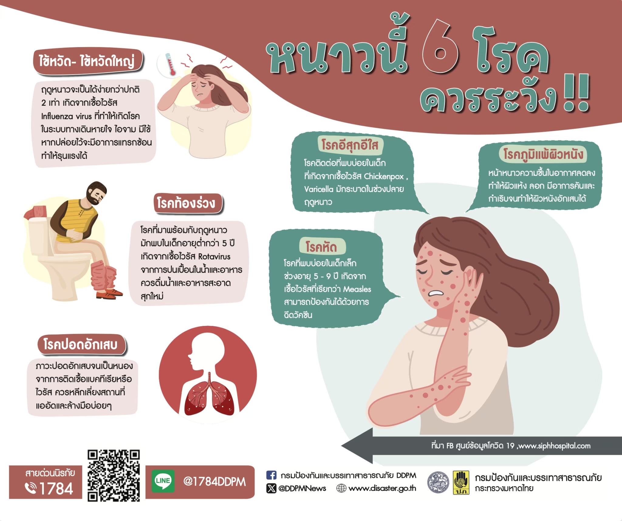 กรมป้องกันและบรรเทาสาธารณภัย (ปภ.) เผยว่า ในระยะนี้หลายพื้นที่มีสภาพอากาศแปรปรวนจากการเปลี่ยนผ่านเข้าสู่ฤดูหนาว ทั้งฝนตก อากาศร้อน และอากาศเย็น อีกทั้งบางพื้นที่ต้องประสบน้ำท่วมขังและสภาพอากาศหนาวเย็น ทำให้เจ็บป่วยจากสภาพร่างกายปรับตัวไม่ทัน เพื่อความปลอดภัย กรมป้องกันและบรรเทาสาธารณภัย ขอแนะวิธีรับมือดูแลสุขภาพในช่วงอากาศเปลี่ยนแปลง…เข้าสู่หน้าหนาว ดังนี้ เนื่องจากสภาพอากาศหนาวเย็นลง ทำให้ภูมิต้านทานลดต่ำลง เสี่ยงต่อโรคที่มากับฤดูหนาวและการแพร่กระจายของเชื้อโรคในอากาศ อาทิ ไข้หวัด ไข้หวัดใหญ่ ปอดบวม อุจจาระร่วง โรคหัด และไข้สุกใส