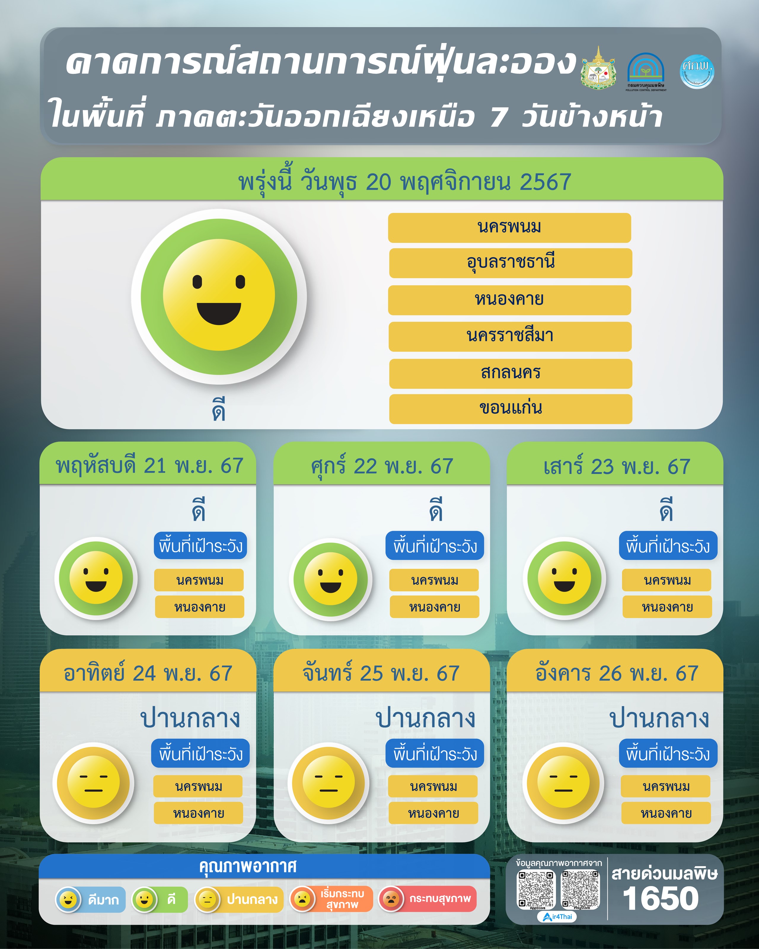 ภาคตะวันออกเฉียงเหนือ ภาพรวมอยู่ในเกณฑ์ดีมาก ตรวจวัดได้ 8.5 – 23.2 มคก./ลบ.ม.