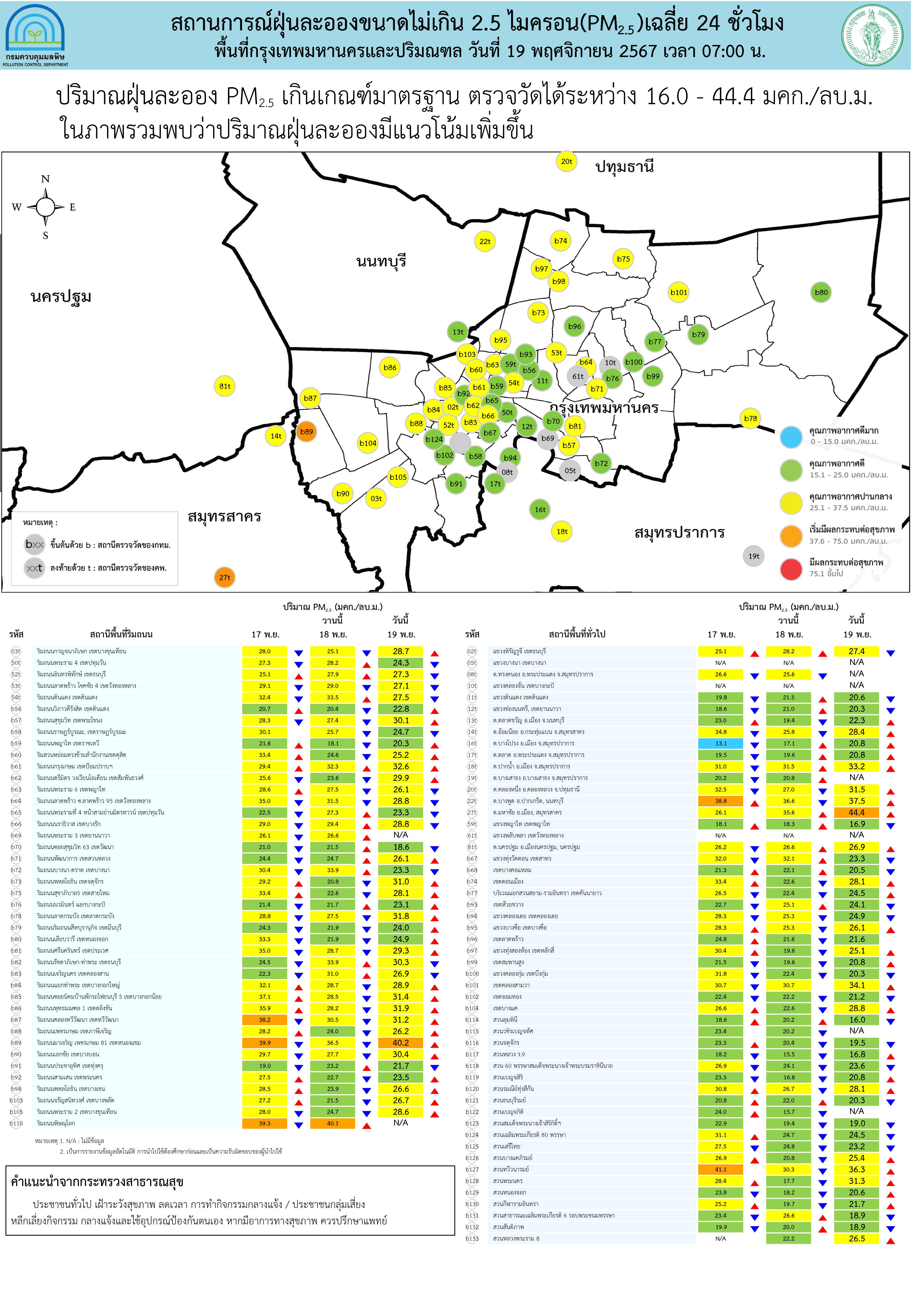 ศูนย์สื่อสารการแก้ไขปัญหามลพิษทางอากาศ รายงานการติดตามตรวจสอบคุณภาพอากาศ ประจำวันที่ 19 พฤศจิกายน 2567 ณ 07:00 น สรุปดังนี้ ภาพรวมปริมาณ PM2.5 ในประเทศอยู่ในเกณฑ์มาตรฐานเป็นส่วนใหญ่ พบเกินค่ามาตรฐานในกรุงเทพฯ และ จ. สมุทรสาคร