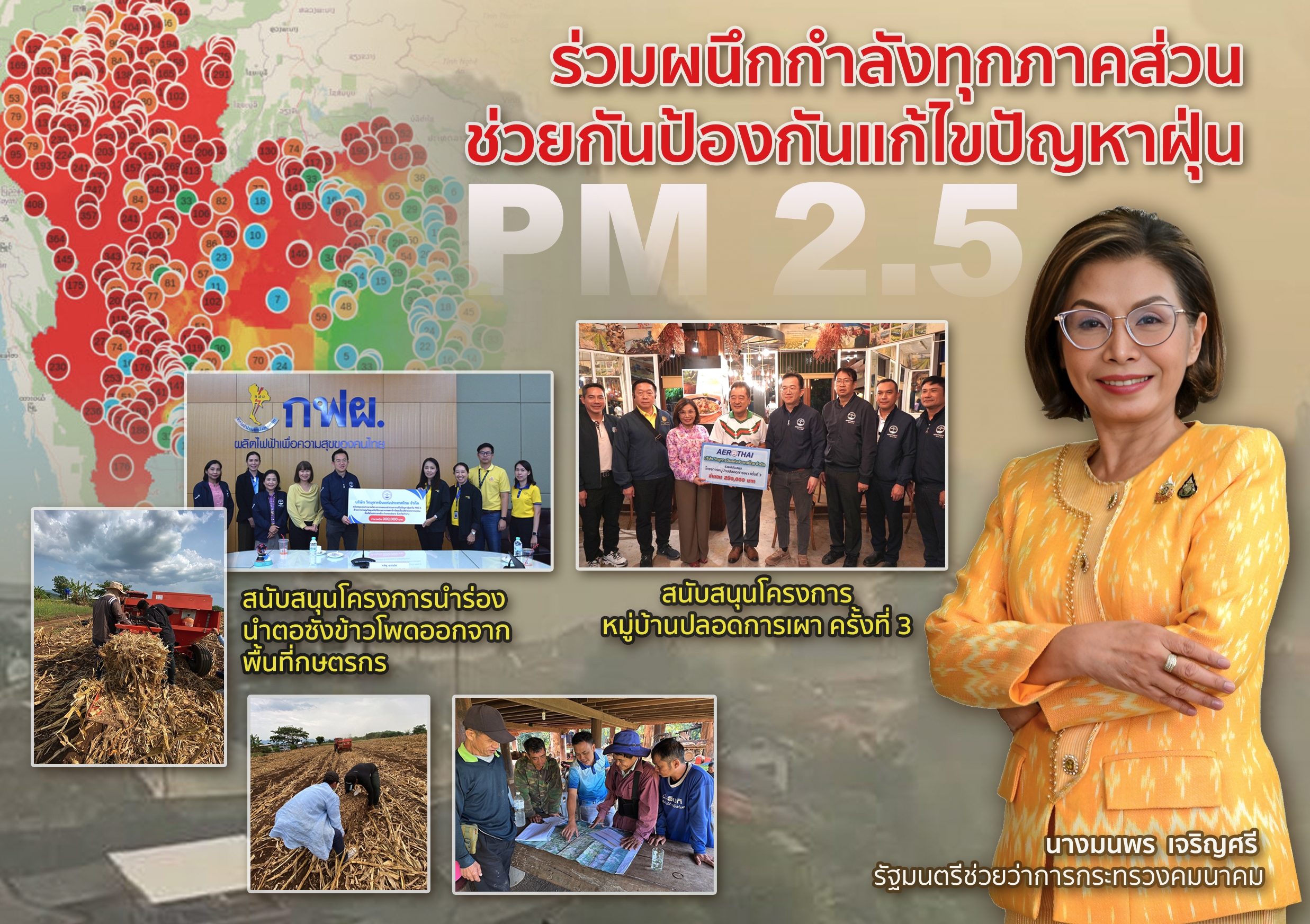 นางมนพร เจริญศรี รัฐมนตรีช่วยว่าการกระทรวงคมนาคม เปิดเผยว่า ปัญหา PM 2.5 เป็นปัญหาระดับประเทศที่ทั้งหน่วยงานภาครัฐเอกชนประชาชนทุกคนต้องให้ความร่วมมือช่วยกันป้องกันและแก้ไข เนื่องจากมีผลกระทบต่อสุขภาพ เศรษฐกิจ และการท่องเที่ยว โดยเฉพาะภาคเหนือมักประสบปัญหาหมอกควันและไฟป่าในช่วงฤดูแล้ง (กุมภาพันธ์ – เมษายน) สาเหตุหลักคาดว่ามาจากการเผาในพื้นที่การเกษตร การเผาเพื่อหาของป่า และไฟป่าตามธรรมชาติ ดังนั้นในฐานะที่กำกับดูแลวิทยุการบินฯ ได้สั่งการให้เข้าไปช่วยเหลือบรรเทาปัญาหาฝุ่นควันในเขตพื้นที่ภาคเหนือ โดย วิทยุการบินฯ รายงานว่าได้ร่วมมือกับบริษัท เชียงใหม่วิสาหกิจเพื่อสังคม จำกัด สนับสนุนรางวัลหมู่บ้านปลอดการเผาให้กับหมู่บ้านที่เข้าร่วมโครงการ ในขนาดพื้นที่ 2,000 ไร่ ซึ่งวันนี้ที่มามอบเงินช่วยเหลือ และควรจะสานต่อความร่วมมือกันต่อเนื่อง เพื่อให้เกิดประโยชน์ต่อประชาชน อีกทั้งการป้องกันแก้ไขจะต้องทำกันล่วงหน้า