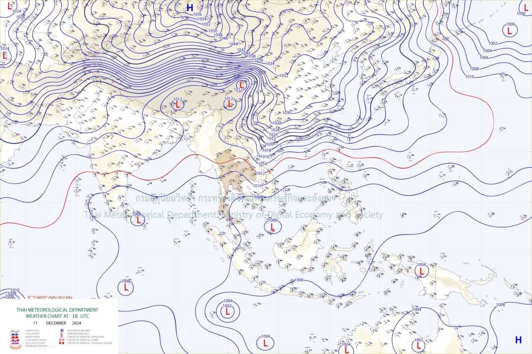 ลักษณะอากาศทั่วไป พยากรณ์อากาศ 24 ชั่วโมงข้างหน้า บริเวณความกดอากาศสูงหรือมวลอากาศเย็นกำลังค่อนข้างแรงอีกระลอกหนึ่งจากประเทศจีนได้แผ่ปกคลุมถึงประเทศเวียดนามและลาวตอนบนแล้ว คาดว่าจะแผ่ปกคลุมภาคตะวันออกเฉียงเหนือตอนบนในวันนี้ (12 ธ.ค. 67) ทำให้ประเทศไทยตอนบนมีฝนเกิดขึ้นบางแห่งในระยะแรก โดยยังคงมีอากาศเย็นในตอนเช้า ส่วนบริเวณยอดดอยและยอดภูมีอากาศเย็นถึงหนาว ขอให้ประชาชนในบริเวณดังกล่าวดูแลรักษาสุขภาพเนื่องจากสภาพอากาศที่เปลี่ยนแปลง รวมถึงระมัดระวังอันตรายในการสัญจรผ่านบริเวณที่มีหมอกไว้ด้วย