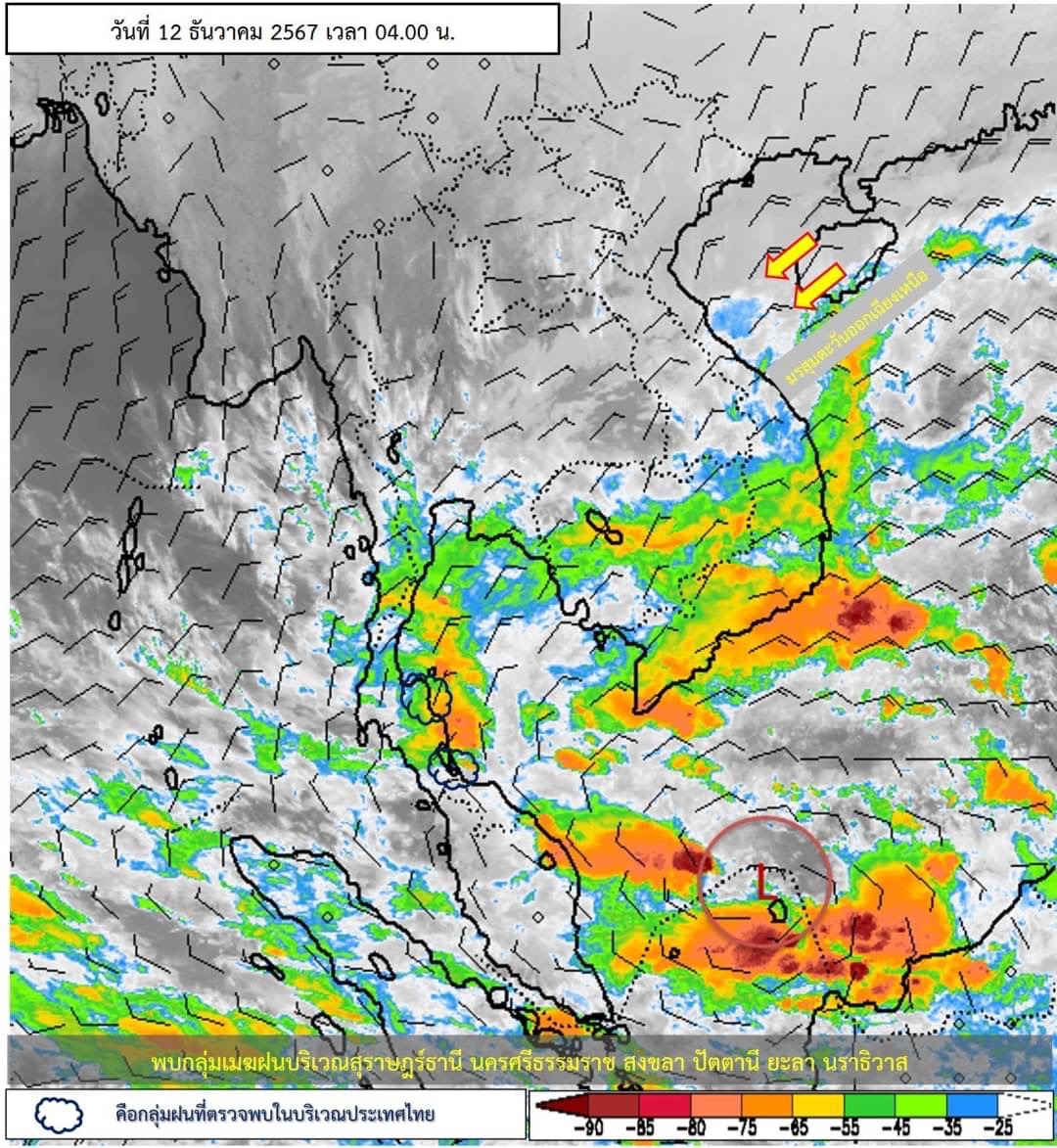 อนึ่ง ในช่วงวันที่ 12-16 ธ.ค. 67 มรสุมตะวันออกเฉียงเหนือที่พัดปกคลุมอ่าวไทยและภาคใต้มีกำลังแรงขึ้น ประกอบกับจะมีหย่อมความกดอากาศต่ำบริเวณทะเลจีนใต้จะเคลื่อนผ่านอ่าวไทยและภาคใต้ตอนล่างในช่วงวันที่ 13-15 ธ.ค. 67 ทำให้ภาคใต้มีฝนเพิ่มขึ้นและมีฝนตกหนักถึงหนักมากบางแห่ง