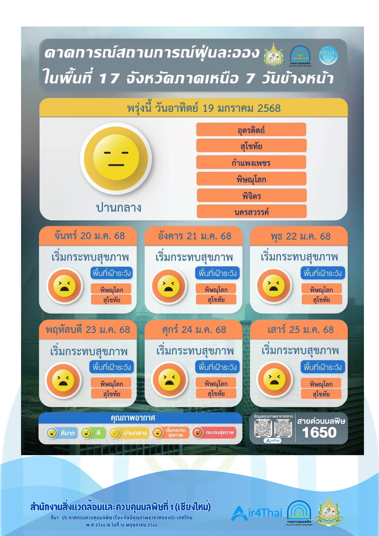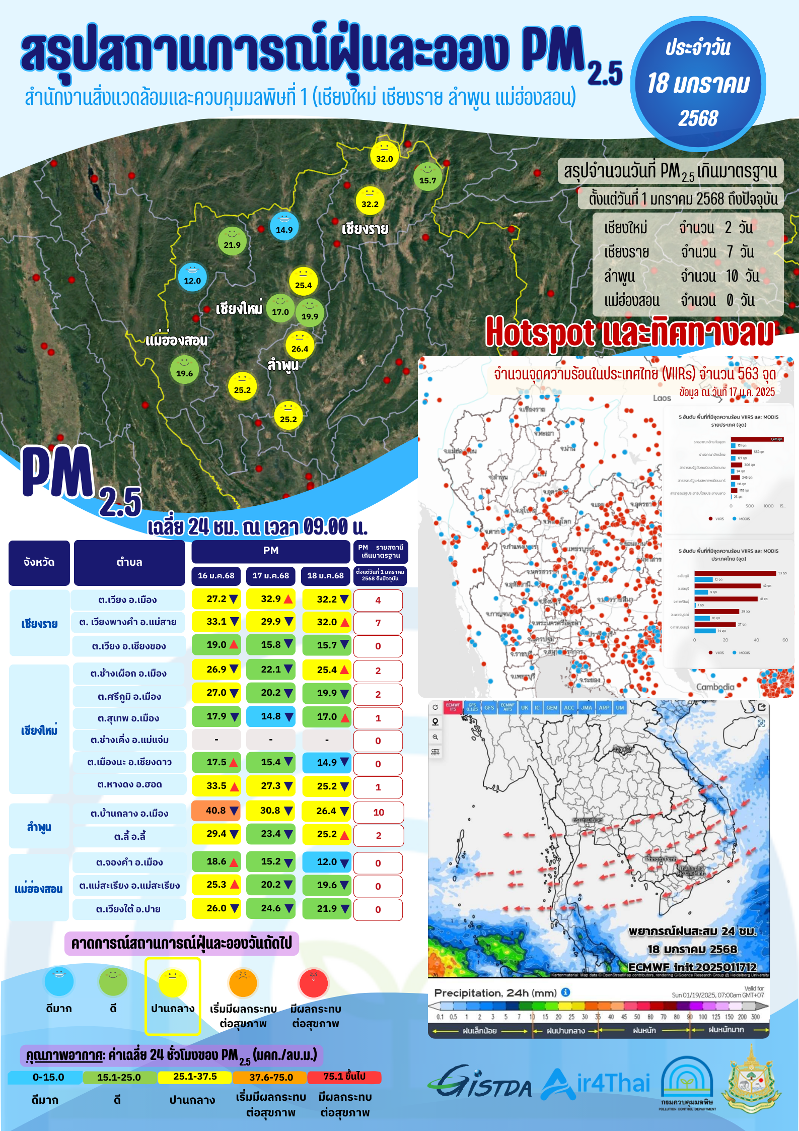 📢 สรุปสถานการณ์ฝุ่น PM2.5 ประจำวันที่ 18 มกราคม 2568 ในพื้นที่รับผิดชอบของสำนักงานสิ่งแวดล้อมและควบคุมมลพิษที่ 1 (เชียงใหม่ เชียงราย ลำพูน แม่ฮ่องสอน)