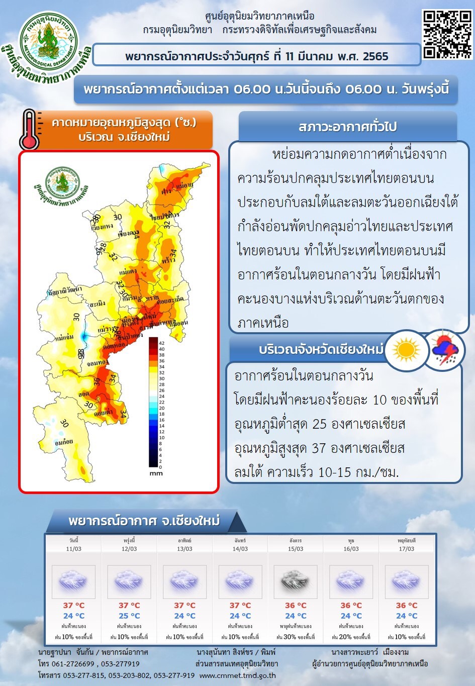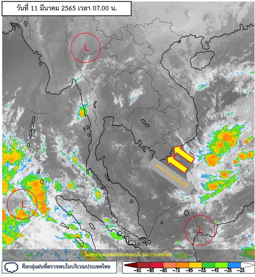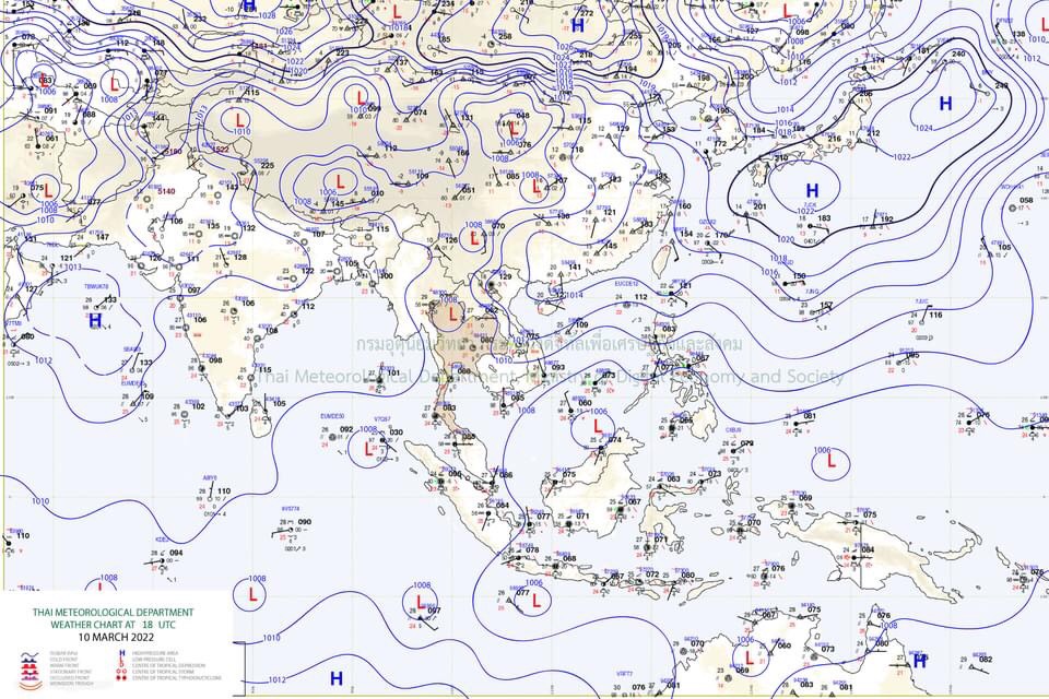 ลักษณะอากาศทั่วไป พยากรณ์อากาศ 24 ชั่วโมงข้างหน้า หย่อมความกดอากาศต่ำเนื่องจากความร้อนปกคลุมประเทศไทยตอนบน ทำให้บริเวณดังกล่าวมีอากาศร้อน ในขณะที่ลมใต้และลมตะวันออกเฉียงใต้ กำลังอ่อนพัดปกคลุมประเทศไทยตอนบนและอ่าวไทย ทำให้มีฝนฟ้าคะนองบางแห่งบริเวณด้านตะวันตกของภาคเหนือ ภาคกลาง ภาคตะวันออก รวมทั้งกรุงเทพมหานครและปริมณฑล และภาคใต้ ขอให้ประชาชนบริเวณประเทศไทยตอนบน ดูแลรักษาสุขภาพเนื่องจากสภาพอากาศร้อนนี้ไว้ด้วย