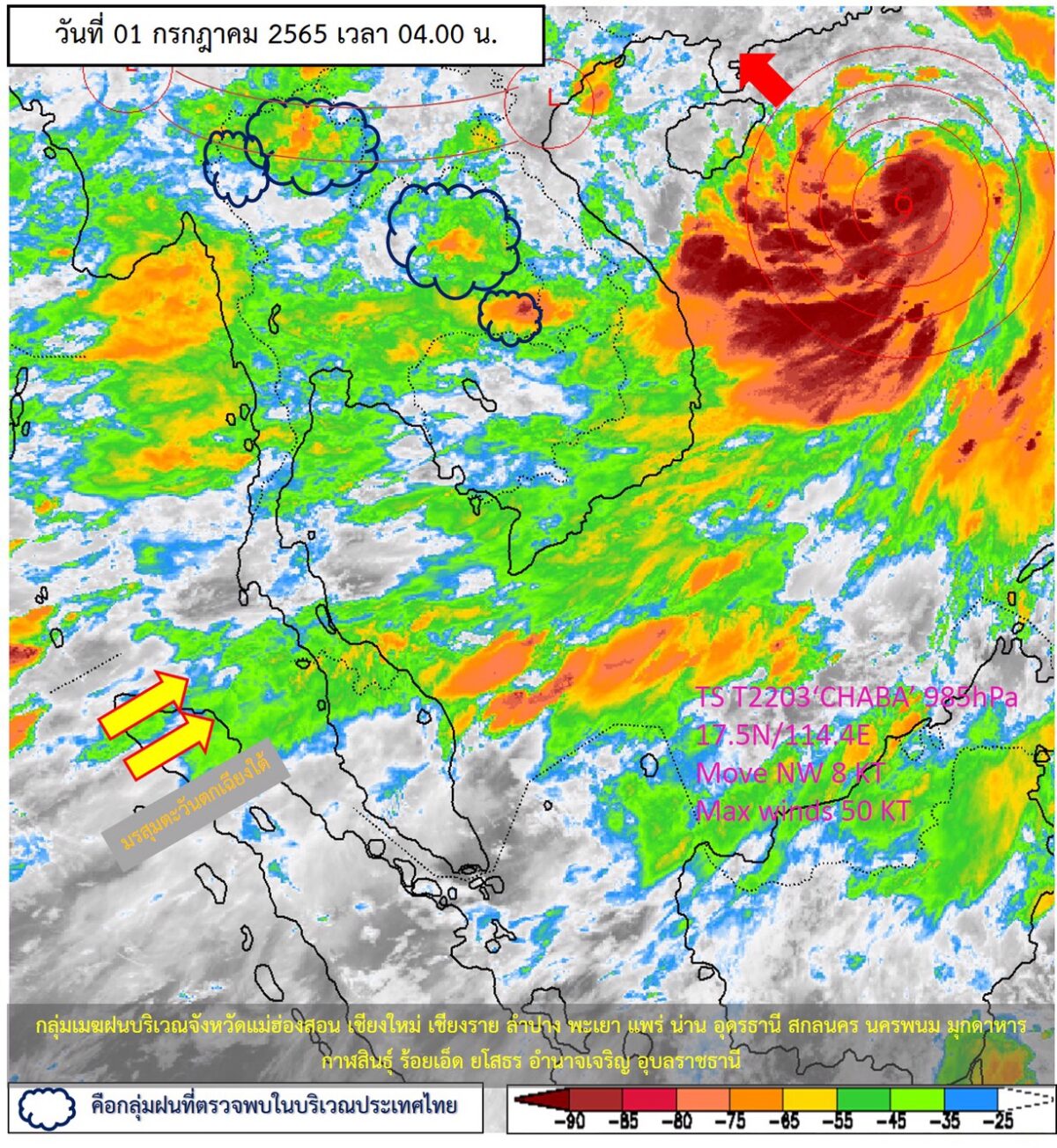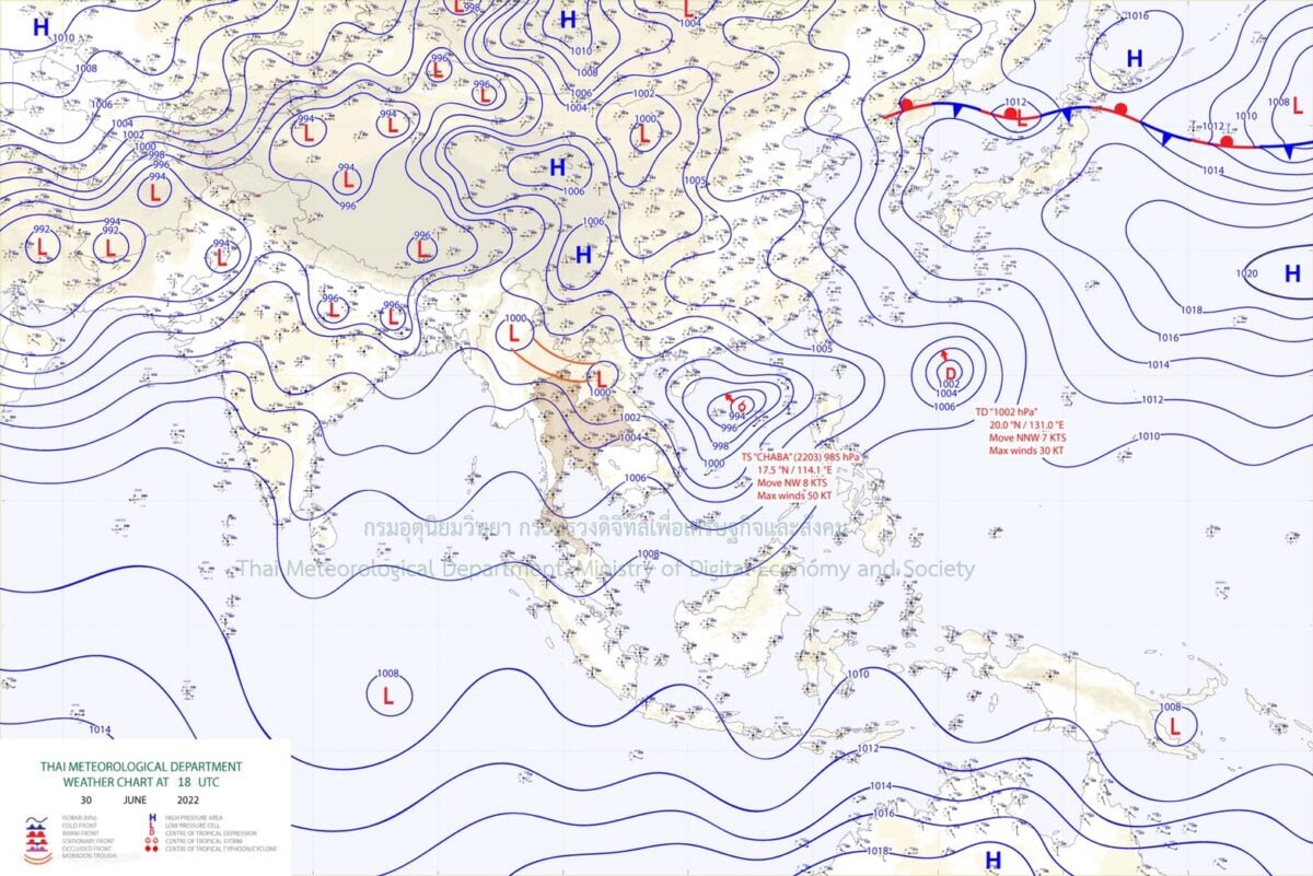 อนึ่ง พายุโซนร้อน “ชบา” (Chaba) บริเวณทะเลจีนใต้ตอนบน คาดว่าจะเคลื่อนขึ้นฝั่งประเทศจีนตอนใต้ในช่วงวันที่ 2–3 ก.ค. 65