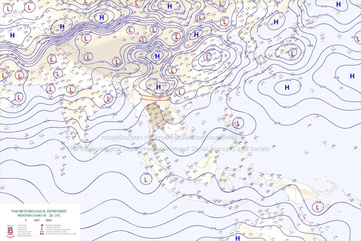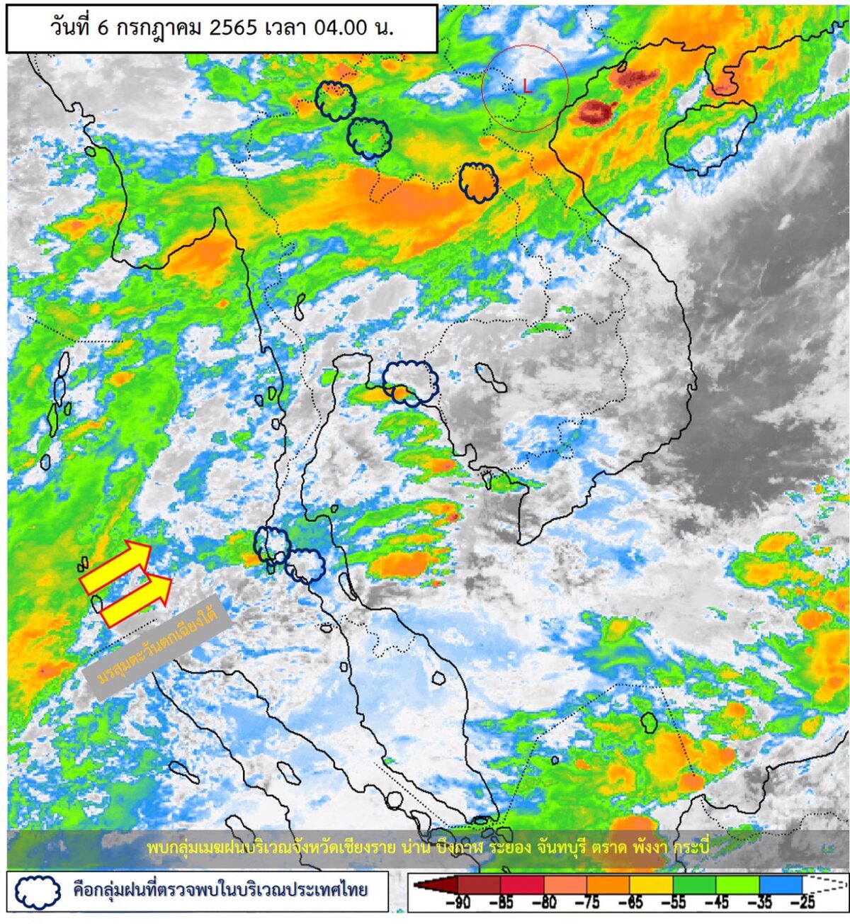 ลักษณะอากาศทั่วไป พยากรณ์อากาศ 24 ชั่วโมงข้างหน้า มรสุมตะวันตกเฉียงใต้ที่พัดปกคลุมทะเลอันดามัน ประเทศไทย และอ่าวไทยเริ่มมีกำลังอ่อนลง ประกอบกับร่องมรสุมพาดผ่านประเทศเมียนมา ประเทศลาวตอนบนเข้าสู่หย่อมความกดอากาศต่ำบริเวณประเทศเวียดนามตอนบน ลักษณะเช่นนี้ยังคงทำให้ภาคตะวันออกและภาคใต้ฝั่งตะวันตกมีฝนตกหนักบางแห่ง ขอให้ประชาชนบริเวณดังกล่าวระวังอันตรายจากฝนตกหนักและฝนที่ตกสะสมซึ่งอาจทำให้เกิดน้ำท่วมฉับพลันและน้ำป่าไหลหลากได้