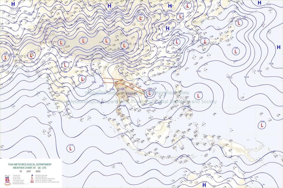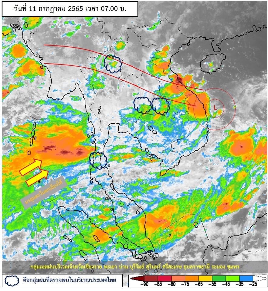 ลักษณะอากาศทั่วไป พยากรณ์อากาศ 24 ชั่วโมงข้างหน้า มรสุมตะวันตกเฉียงใต้กำลังแรงพัดปกคลุมทะเลอันดามัน ประเทศไทย และอ่าวไทย ประกอบกับร่องมรสุมพาดผ่านประเทศเมียนมา ตอนบนของภาคเหนือและภาคตะวันออกเฉียงเหนือของประเทศไทย ประเทศลาวตอนบน เข้าสู่หย่อมความกดอากาศต่ำกำลังแรงบริเวณทะเลจีนใต้ตอนบน ลักษณะเช่นนี้ทำให้ภาคเหนือ ภาคตะวันออกเฉียงเหนือ ภาคกลาง ภาคตะวันออก และภาคใต้ มีฝนตกหนักถึงหนักมากบางแห่ง ขอให้ประชาชนบริเวณดังกล่าวระวังอันตรายจากฝนตกหนักถึงหนักมากและฝนที่ตกสะสมซึ่งอาจทำให้เกิดน้ำท่วมฉับพลันและน้ำป่าไหลหลากในระยะนี้