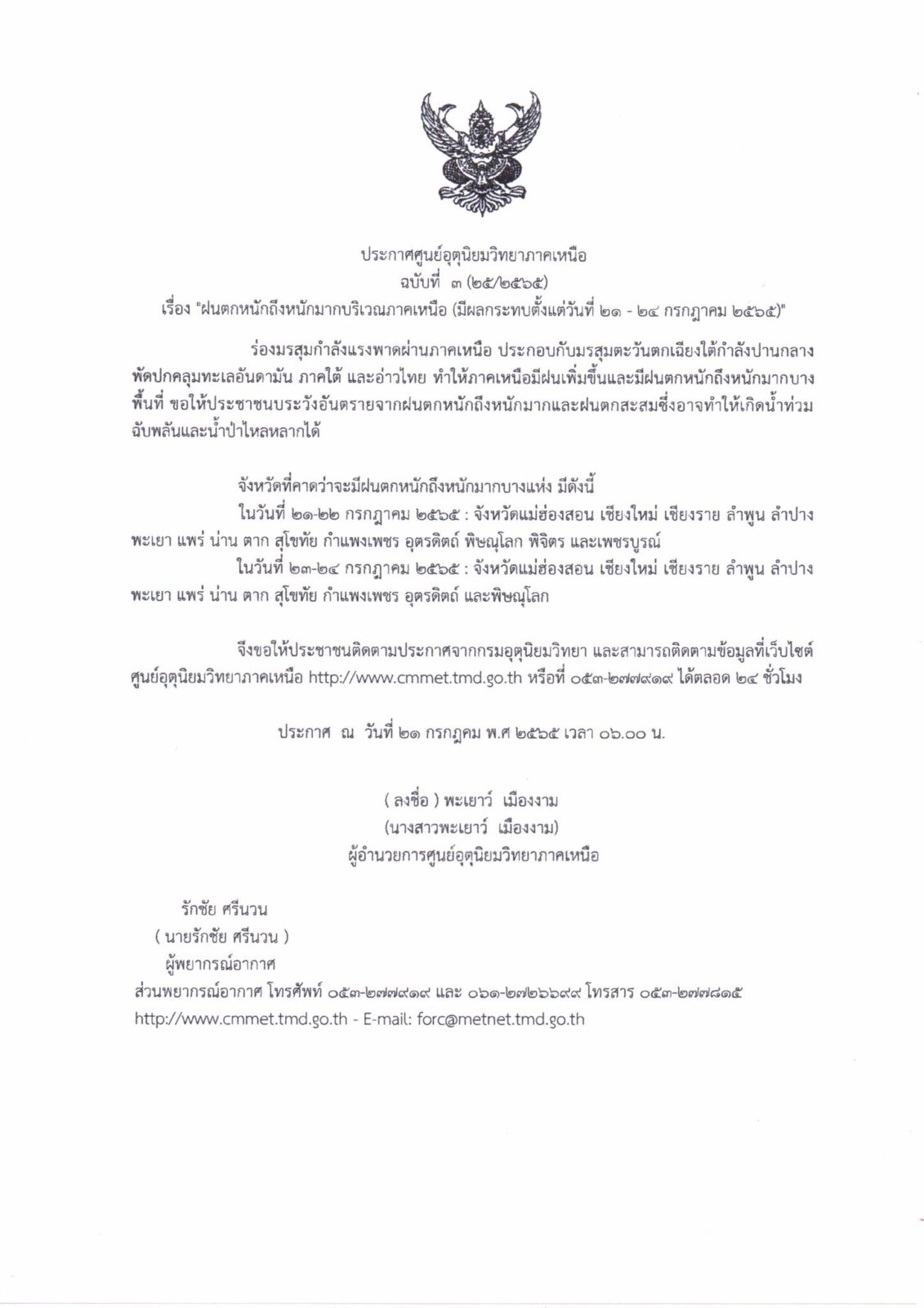 ประกาศศูนย์อุตุนิยมวิทยาภาคเหนือ ฉบับที่ 3(25/2565) เรื่อง “ฝนตกหนักถึงหนักมากบริเวณภาคเหนือ (มีผลกระทบตั้งแต่วันที่ 21- 24 กรกฎาคม 2565)”