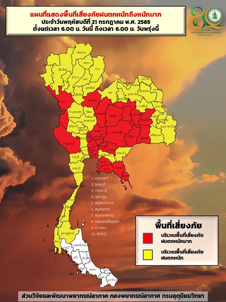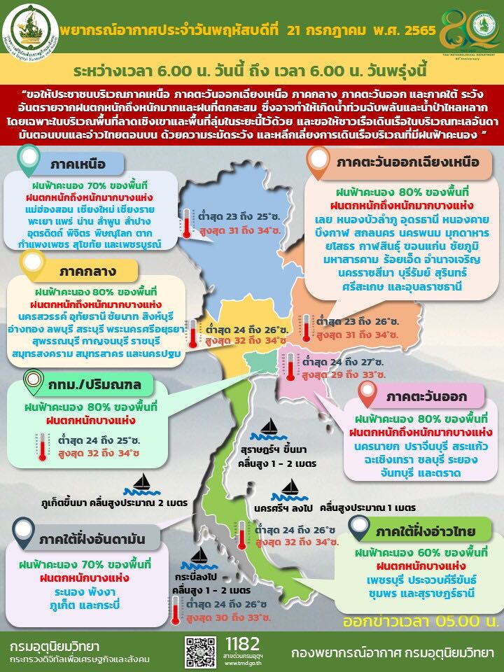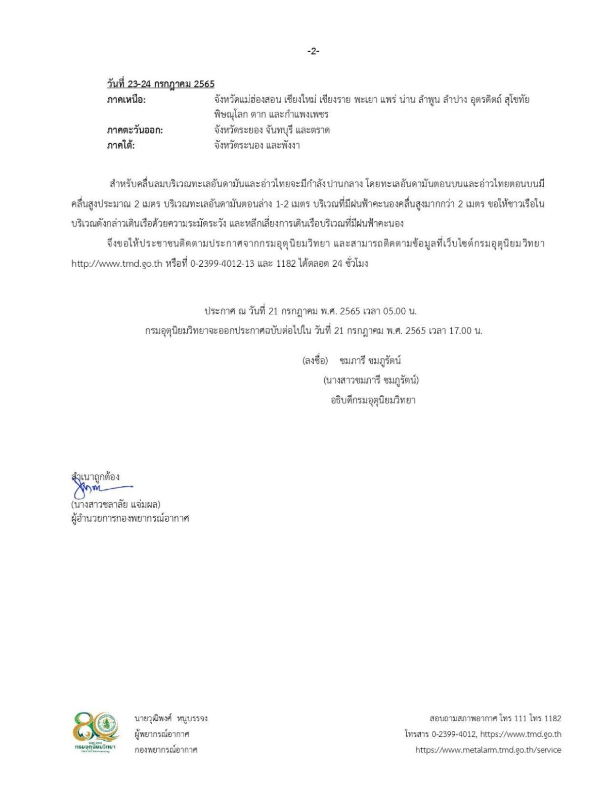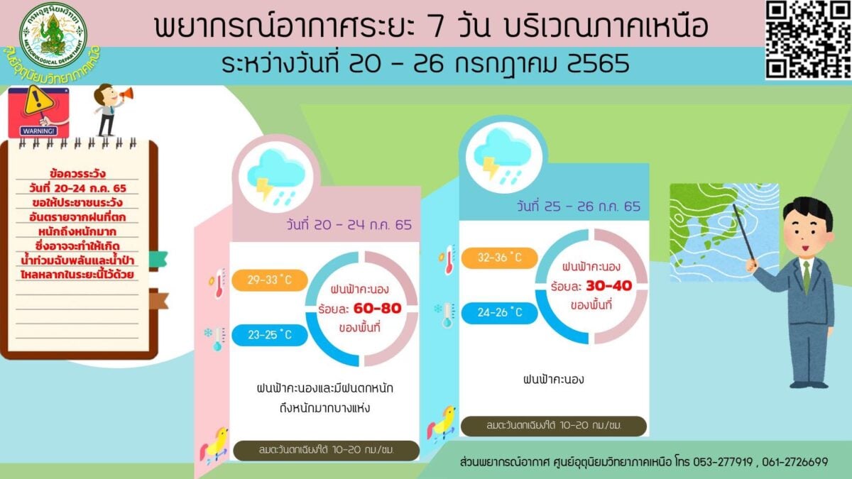 ร่องมรสุมกำลังแรงพาดผ่านภาคเหนือ ประกอบกับมรสุมตะวันตกเจียงใต้กำลังปานกลาง พัดปกคลุมทะเลอันดามัน ภาคใต้ และอ่าวไทย ทำให้ภาคเหนือมีฝนเพิ่มขึ้นและมีฝนตกหนักถึงหนักมากบาง พื้นที่ ขอให้ประชาชนบระวังอันตรายจากฝนตกหนักถึงหนักมากและฝนตกสะสมซึ่งอาจทำให้เกิดน้ำท่วม ฉับพลันและน้ำป่าไหลหลากได้ จังหวัดที่คาดว่าจะมีฝนตกหนักถึงหนักมากบางแห่ง มีดังนี้ ในวันที่ 21-22 กรกฎาคม 2565 : จังหวัดแม่ฮ่องสอน เชียงใหม่ เชียงราย ลำพูน ลำปาง พะเยา แพร่ น่าน ตาก สุโขทัย กำแพงเพชร อุตรดิตถ์ พิษณุโลก พิจิตร และเพชรบูรณ์ ในวันที่ 23-24 กรกฎาคม 2565 : จังหวัดแม่ฮ่องสอน เชียงใหม่ เชียงราย ลำพูน ลำปาง พะเยา แพร่ น่าน ตาก สุโขทัย กำแพงเพชร อุตรดิตถ์ และพิษณุโลก จึงขอให้ประชาชนติดตามประกาศจากกรมอุตุนิยมวิทยา และสามารถติดตามข้อมูลที่เว็บไซต์ ศูนย์อุตุนิยมวิทยาภาคเหนือ http://www.cmmet.tmd.go.th หรือที่ 053-279919 ได้ตลอด 24 ชั่วโมง
