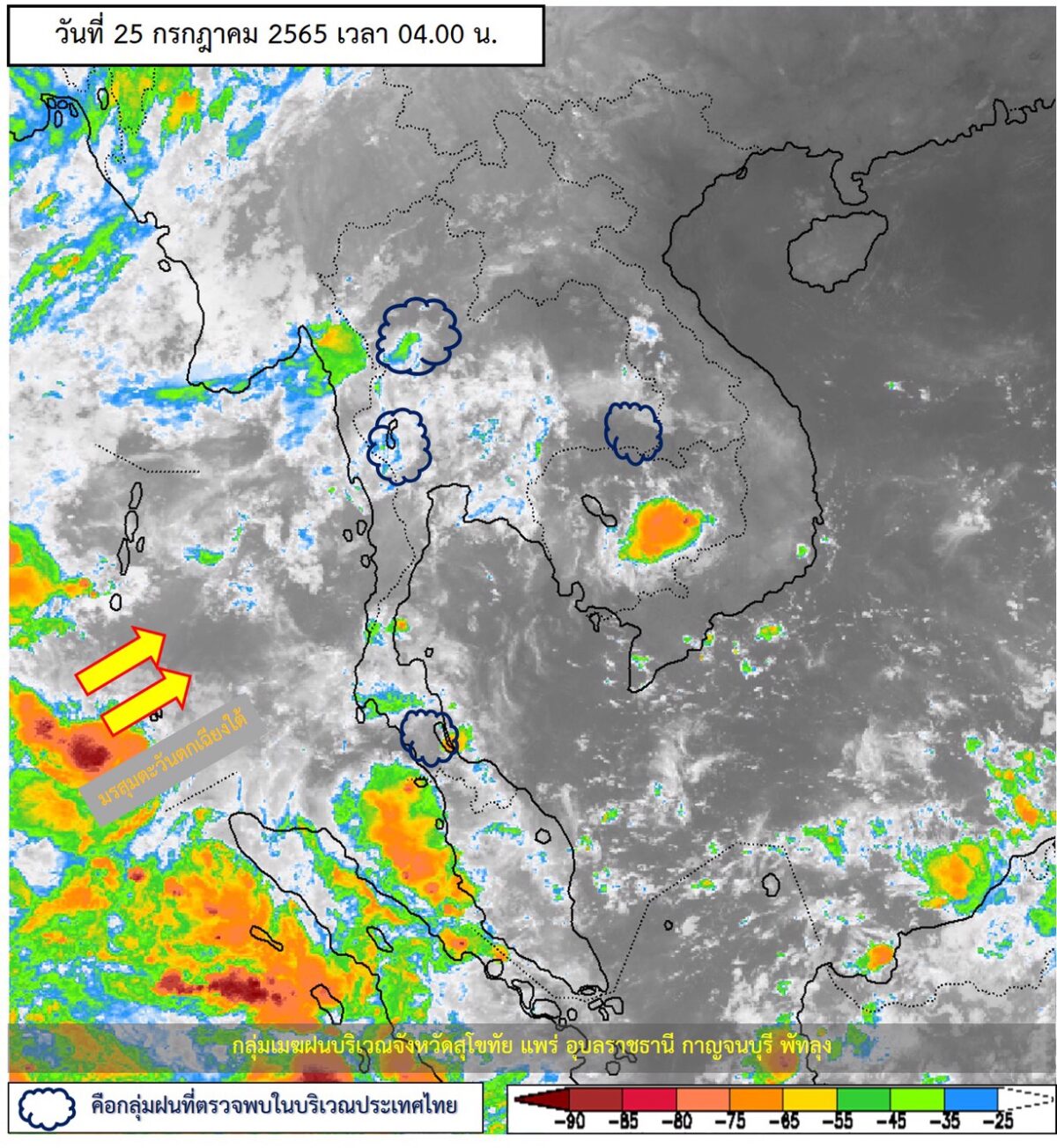 ลักษณะอากาศทั่วไป พยากรณ์อากาศ 24 ชั่วโมงข้างหน้า มรสุมตะวันตกเฉียงใต้กำลังอ่อนพัดปกคลุมทะเลอันดามัน ภาคใต้ และอ่าวไทย ในขณะที่มีลมใต้และลมตะวันออกเฉียงใต้พัดปกคลุมภาคตะวันออกเฉียงเหนือตอนล่าง ภาคกลางตอนล่าง รวมทั้งกรุงเทพมหานครและปริมณฑล และภาคตะวันออก ลักษณะเช่นนี้ทำให้ประเทศไทยยังคงมีฝนฟ้าคะนองเกิดขึ้น โดยมีฝนตกหนักบางแห่งบริเวณภาคเหนือตอนล่าง ภาคกลาง และภาคใต้ ขอให้ประชาชนในบริเวณดังกล่าวระวังอันตรายจากฝนตกหนักที่อาจจะเกิดขึ้นในระยะนี้ไว้ด้วย