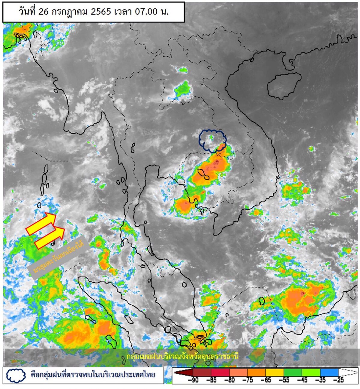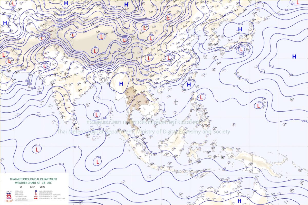 ลักษณะอากาศทั่วไป พยากรณ์อากาศ 24 ชั่วโมงข้างหน้า มรสุมตะวันตกเฉียงใต้กำลังอ่อน พัดปกคลุมทะเลอันดามัน ที่มีลมใต้ และลมตะวันออกเฉียงใต้ พัดปกคลุมภาคเหนือ ภาคตะวันออกเฉียงเหนือ ภาคกลาง รวมทั้งกรุงเทพมหานครและปริมณฑล ภาคตะวันออก และภาคใต้ ลักษณะเช่นนี้ทำให้ประเทศไทยตอนบนมีฝนฟ้าคะนองลดลง ส่วนภาคใต้ตอนล่าง ยังคงมีฝนตกหนักบางแห่ง ขอให้ประชาชนในบริเวณดังกล่าว ระวังอันตรายจากฝนตกหนักที่อาจจะเกิดขึ้นในระยะนี้ไว้ด้วย