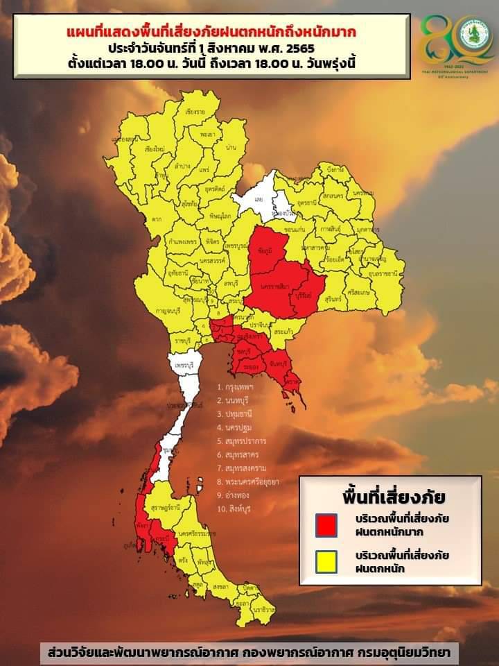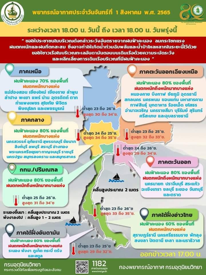 กรมอุตุนิยมวิทยา เผยในช่วงวันที่ 1 – 5 ส.ค. 65 ร่องมรสุมพาดผ่านประเทศเมียนมา ประเทศลาวตอนบน ภาคเหนือตอนบน เข้าสู่หย่อมความกดอากาศต่ำบริเวณประเทศเวียดนามตอนบน ประกอบกับมรสุมตะวันตกเฉียงใต้กำลังปานกลางพัดปกคลุมทะเลอันดามัน ประเทศไทย และอ่าวไทย ลักษณะเช่นนี้ทำให้ประเทศไทยจะมีฝนเพิ่มขึ้น โดยมีฝนตกหนักถึงหนักมากบางพื้นที่บริเวณภาคเหนือ ภาคตะวันออกเฉียงเหนือ รวมทั้งกรุงเทพมหานครและปริมณฑล ภาคตะวันออก และภาคใต้ สำหรับคลื่นลมบริเวณทะเลอันดามันตอนบนและอ่าวไทยตอนบนมีกำลังปานกลาง โดยมีคลื่นสูงประมาณ 2 เมตร บริเวณที่มีฝนฟ้าคะนองคลื่นสูงมากกว่า 2 เมตร