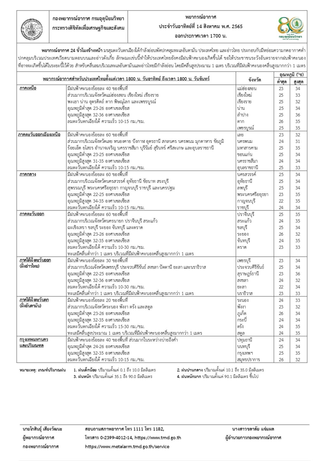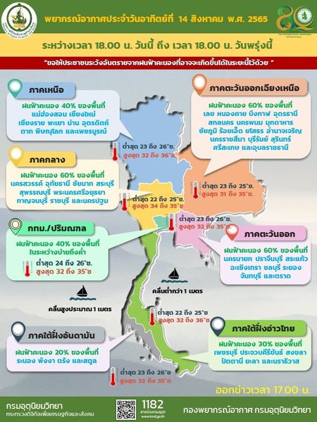 พยากรณ์อากาศ 24 ชั่วโมงข้างหน้า (14 ส.ค. 65) : มรสุมตะวันตกเฉียงใต้กำลังอ่อนพัดปกคลุมทะเลอันดามัน ประเทศไทย และอ่าวไทย ลักษณะเช่นนี้ทำให้ประเทศไทยยังคงมีฝนฟ้าคะนองเกิดขึ้นได้ ขอให้ประชาชนระวังอันตรายจากฝนฟ้าคะนองที่อาจจะเกิดขึ้นได้ในระยะนี้ไว้ด้วย สำหรับคลื่นลมบริเวณทะเลอันดามันและอ่าวไทยมีกำลังอ่อน โดยมีคลื่นสูงประมาณ 1 เมตร บริเวณที่มีฝนฟ้าคะนองคลื่นสูงมากกว่า 1 เมตร