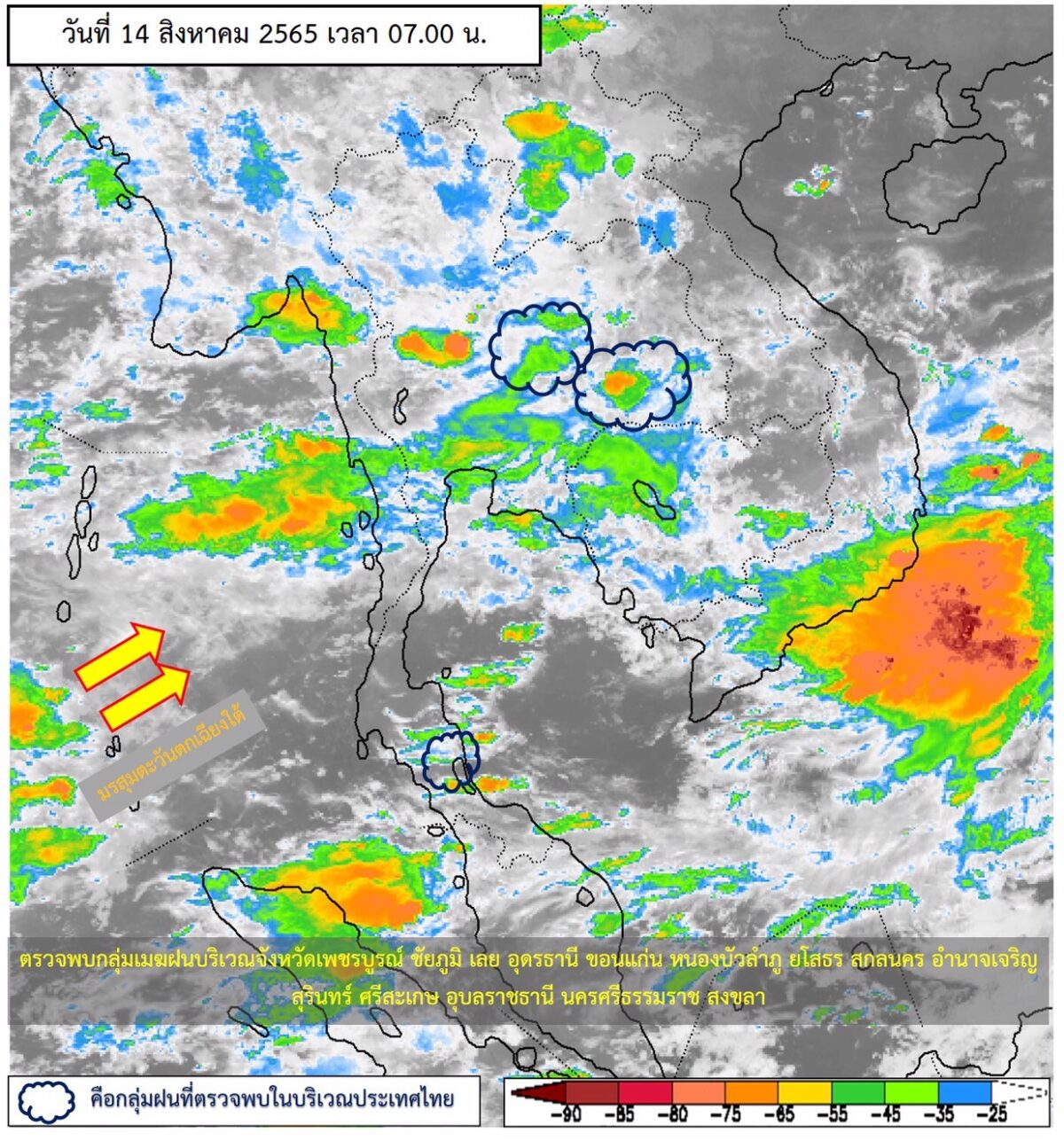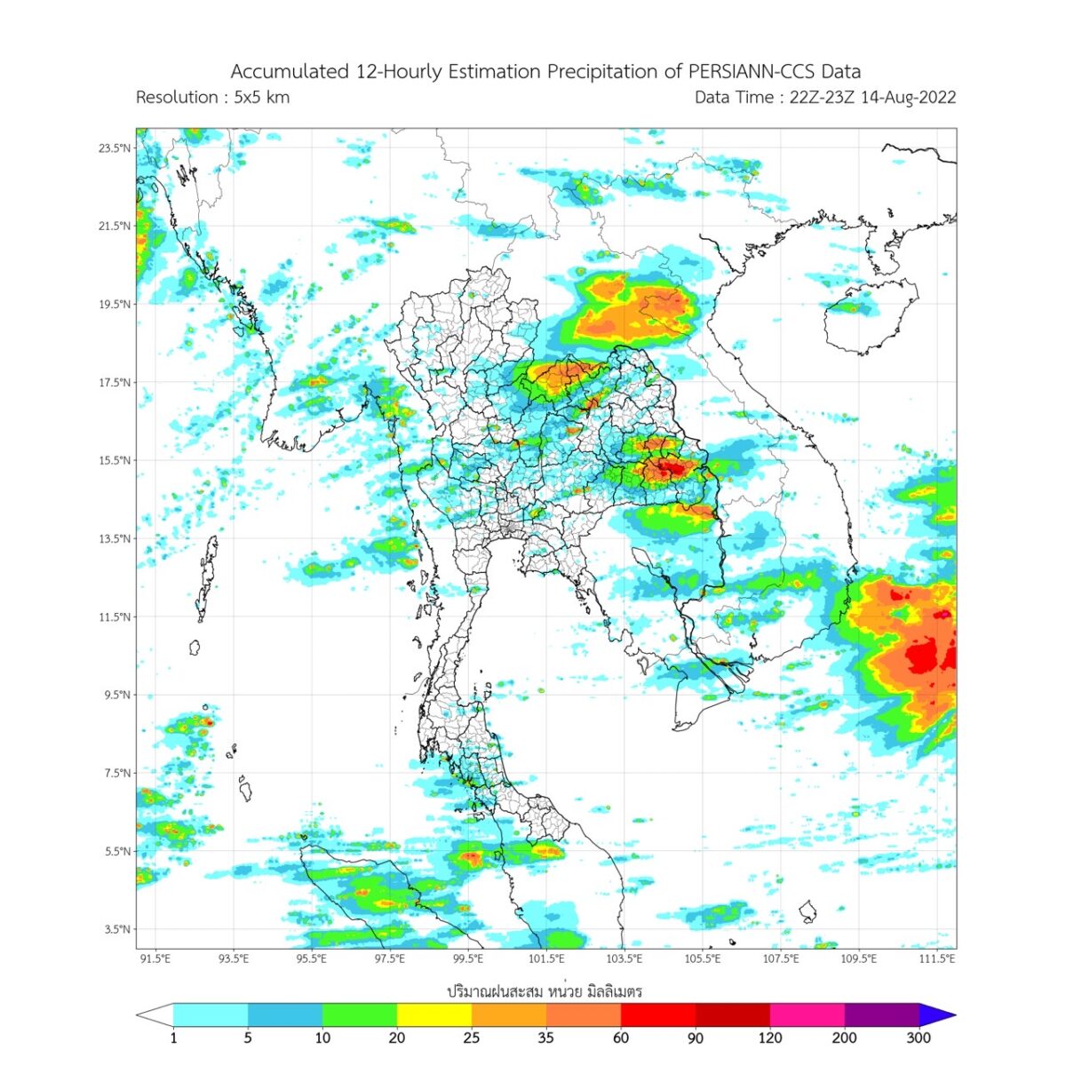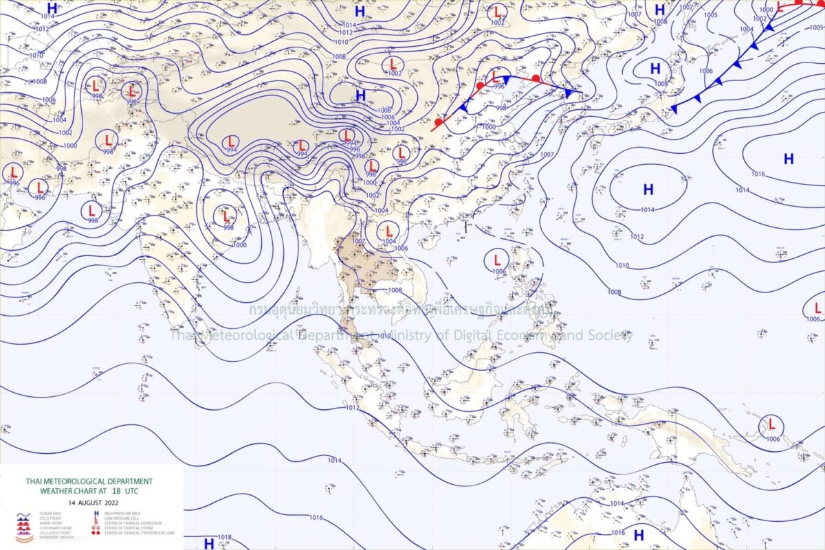 ลักษณะอากาศทั่วไป พยากรณ์อากาศ 24 ชั่วโมงข้างหน้า มรสุมตะวันตกเฉียงใต้พัดปกคลุมทะเลอันดามัน ประเทศไทย และอ่าวไทย ประกอบกับมีหย่อมความกดอากาศต่ำปกคลุมบริเวณประเทศลาวตอนบนและประเทศเวียดนามตอนบน ลักษณะเช่นนี้ทำให้มีฝนตกหนักบางแห่งในภาคเหนือ ภาคตะวันออกเฉียงเหนือ และภาคตะวันออก ขอให้ประชาชนในบริเวณดังกล่าวระวังอันตรายจากฝนตกหนัก ซึ่งอาจทำให้เกิดน้ำท่วมฉับพลันและน้ำป่าไหลหลาก โดยเฉพาะพื้นที่ลาดเชิงเขาใกล้ทางน้ำไหลผ่านและพื้นที่ลุ่มไว้ด้วย