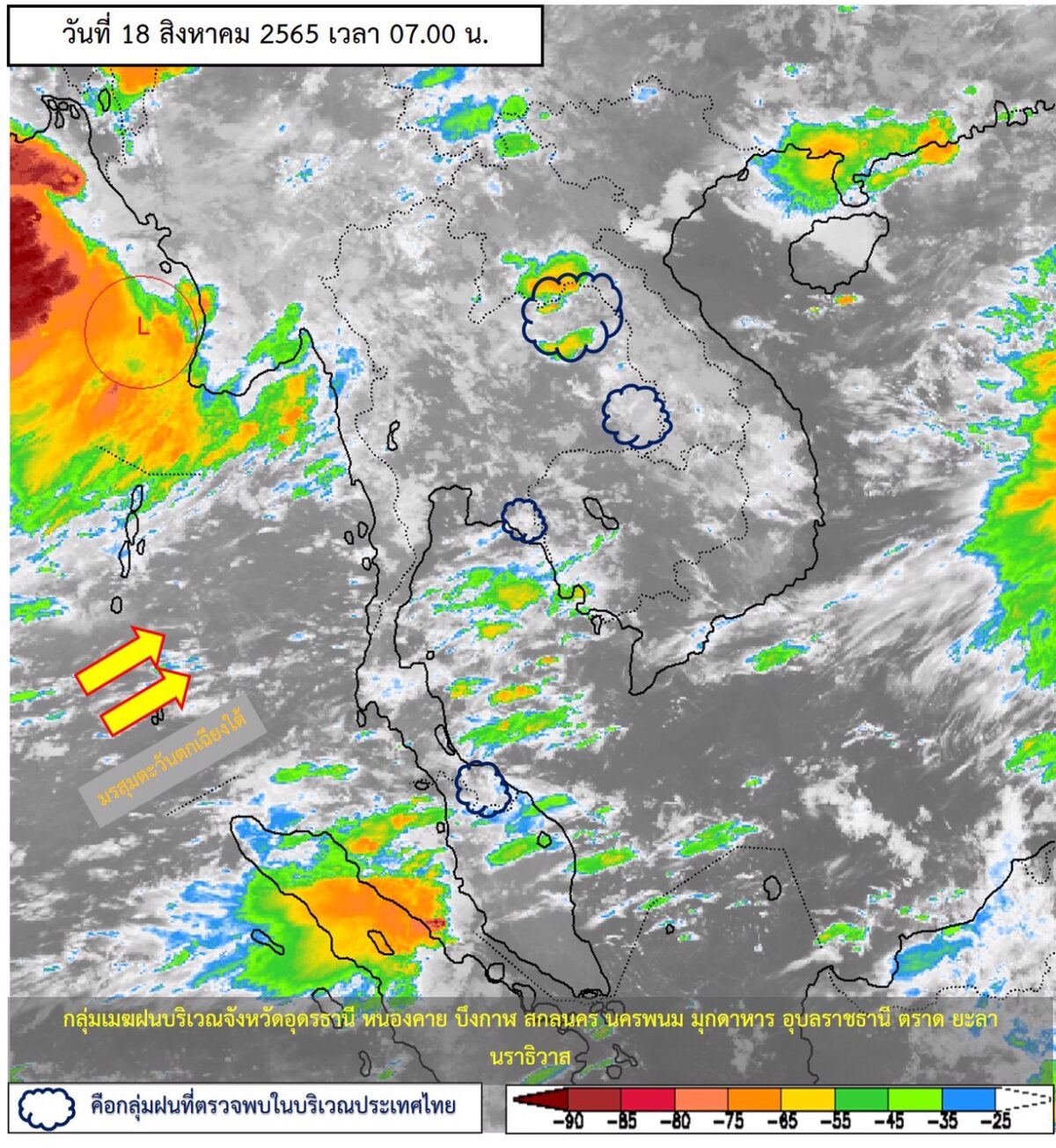 ลักษณะอากาศทั่วไป พยากรณ์อากาศ 24 ชั่วโมงข้างหน้า มรสุมตะวันตกเฉียงใต้ ที่พัดปกคลุมทะเลอันดามัน ประเทศไทย และอ่าวไทยมีกำลังแรงขึ้น ประกอบกับหย่อมความกดอากาศต่ำปกคลุมประเทศเมียนมา ลักษณะเช่นนี้ทำให้ประเทศไทย ยังคงมีฝนตกหนักบางแห่งในด้านตะวันตกของภาคเหนือ ภาคตะวันออก และภาคใต้ฝั่งตะวันตก ขอให้ประชาชนในบริเวณดังกล่าว ระวังอันตรายจากฝนตกหนักและฝนที่ตกสะสม ซึ่งอาจทำให้เกิดน้ำท่วมฉับพลันและน้ำป่าไหลหลาก โดยเฉพาะพื้นที่ลาดเชิงเขาใกล้ทางน้ำไหลผ่านและพื้นที่ลุ่มไว้ด้วย
