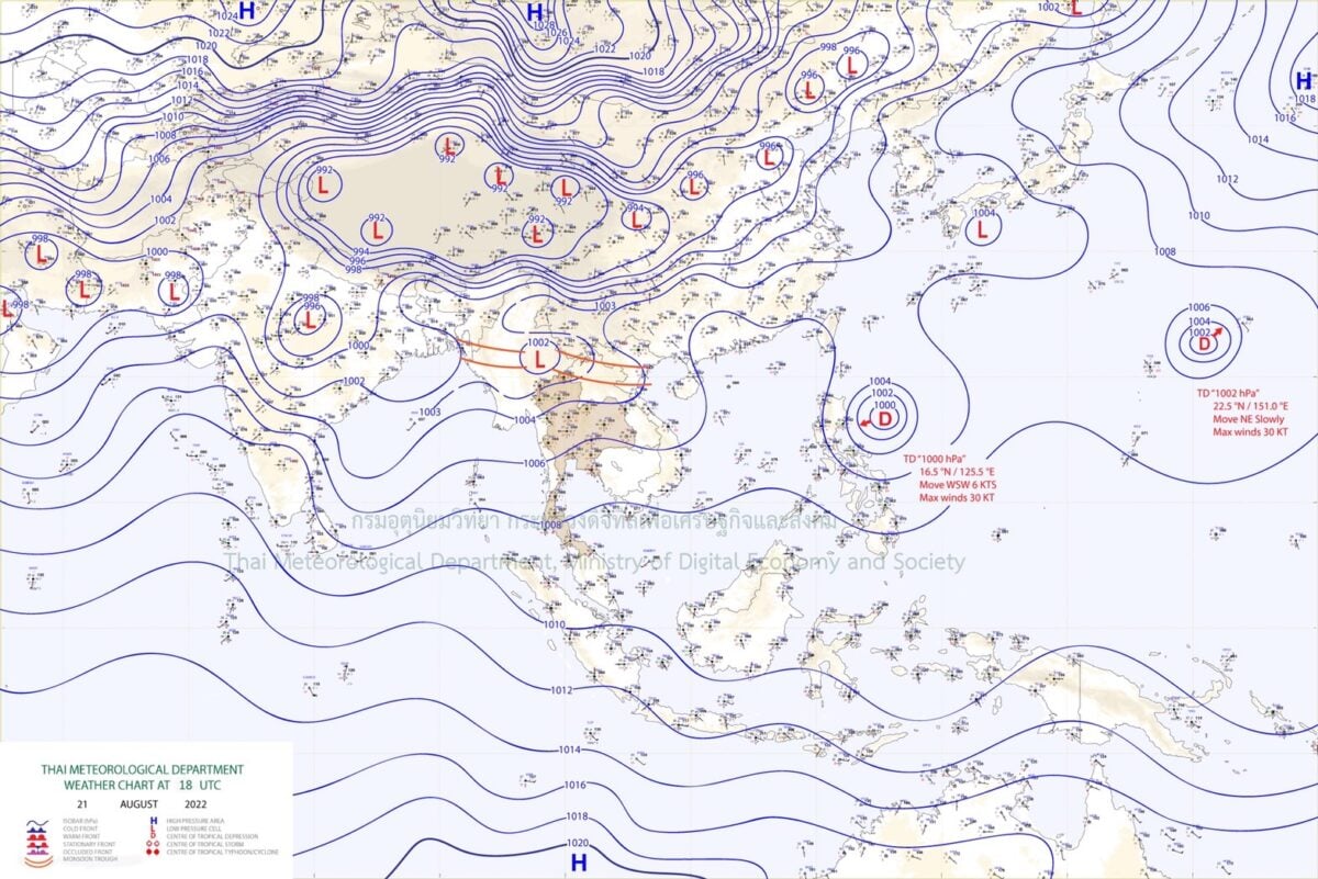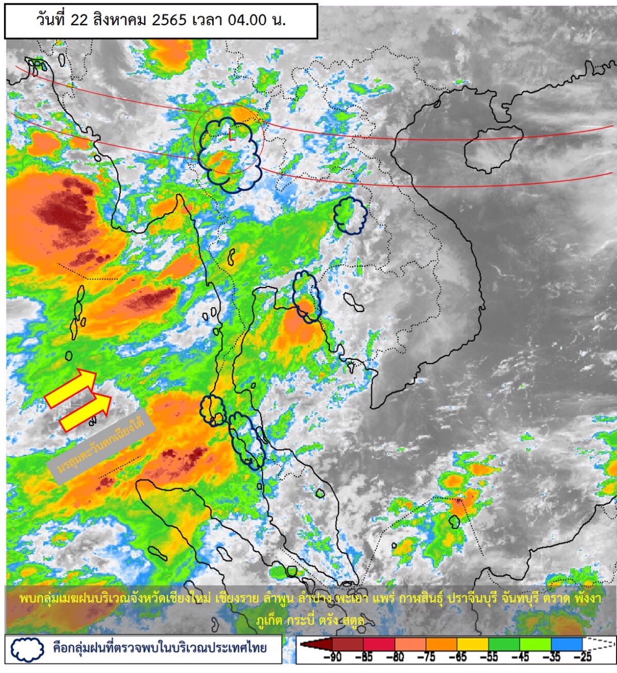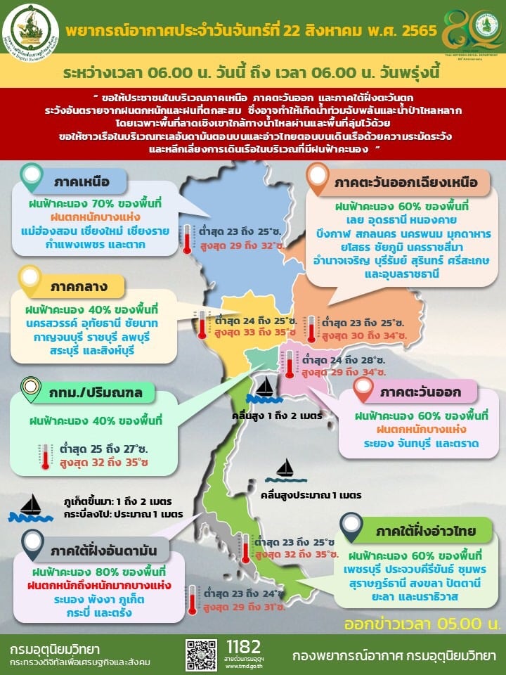 ลักษณะอากาศทั่วไป พยากรณ์อากาศ 24 ชั่วโมงข้างหน้า ร่องมรสุมพาดผ่านตอนบนของภาคเหนือ และประเทศลาวตอนบน เข้าสู่หย่อมความกดอากาศต่ำบริเวณประเทศ เมียนมาตอนบน ประกอบกับมรสุมตะวันตกเฉียงใต้ที่พัดปกคลุมทะเลอันดามัน ประเทศไทย และอ่าวไทย มีกำลังปานกลาง ลักษณะเช่นนี้ทำให้ประเทศไทยมีฝนตกหนักถึงหนักมากบางแห่งบริเวณภาคเหนือ ภาคตะวันออก และภาคใต้ฝั่งตะวันตก ขอให้ประชาชนในบริเวณดังกล่าวระวังอันตรายจากฝนตกหนักถึงหนักมากและฝนที่ตกสะสม ซึ่งอาจทำให้เกิดน้ำท่วมฉับพลันและน้ำป่าไหลหลาก โดยเฉพาะพื้นที่ลาดเชิงเขาใกล้ทางน้ำไหลผ่านและพื้นที่ลุ่มไว้ด้วย
