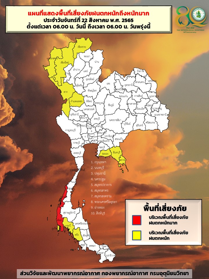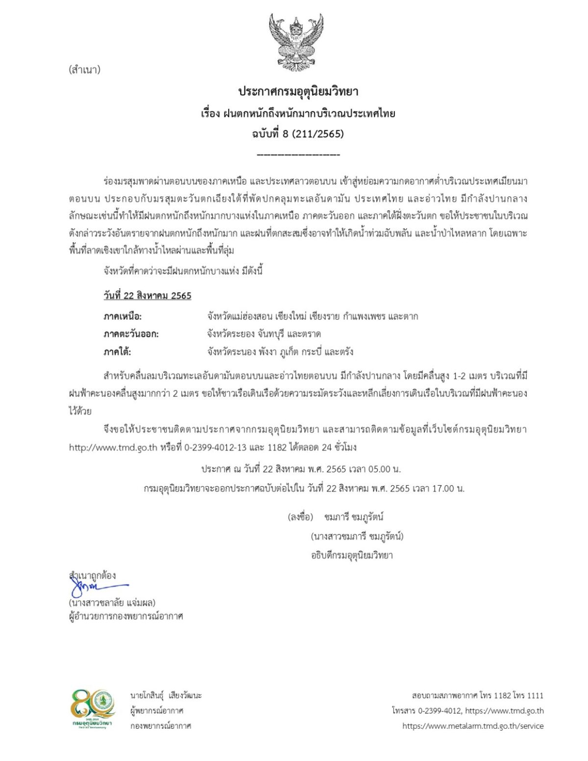 ประกาศกรมอุตุนิยมวิทยา เรื่อง ฝนตกหนักถึงหนักมากบริเวณประเทศไทย ฉบับที่ 8 (211/2565)