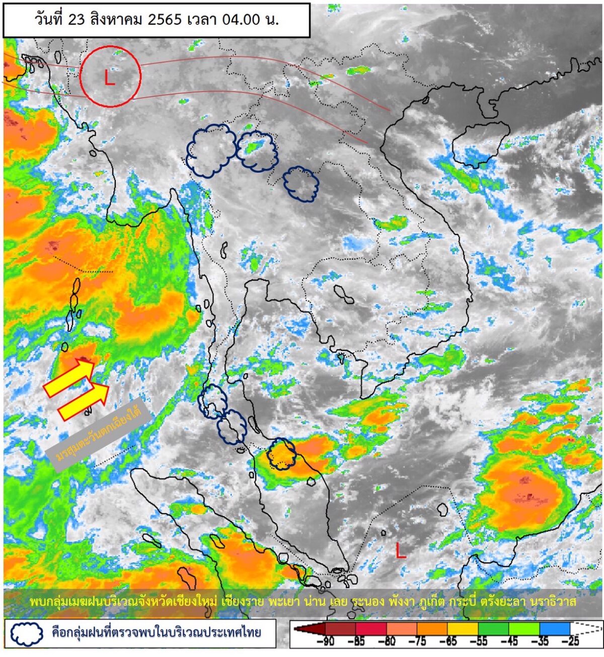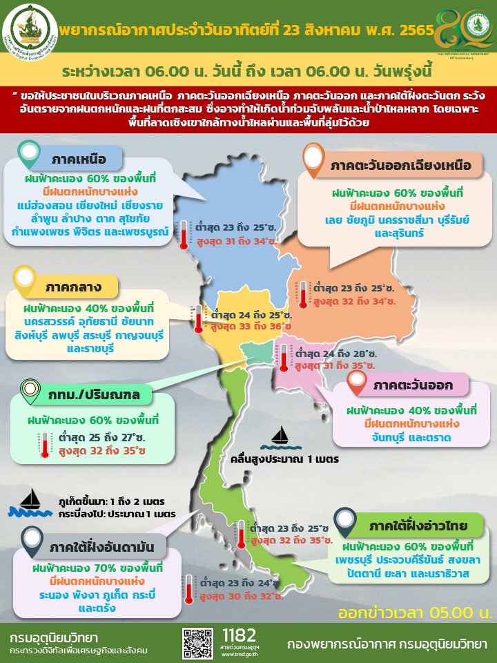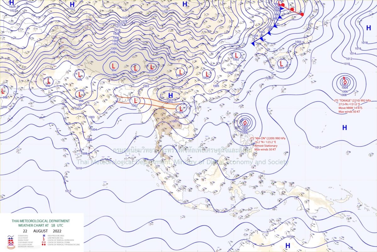 อนึ่ง พายุโซนร้อน “หมาอ๊อน” (MA-ON) บริเวณด้านตะวันออกของประเทศฟิลิปปินส์ คาดว่าจะเคลื่อนลงสู่ทะเลจีนใต้ตอนบน ในช่วงวันที่ 23–25 ส.ค. 65 และเคลื่อนขึ้นฝั่งด้านตะวันออกของประเทศจีนตอนใต้ โดยพายุนี้ไม่ส่งผลกระทบโดยตรงต่อประเทศไทย