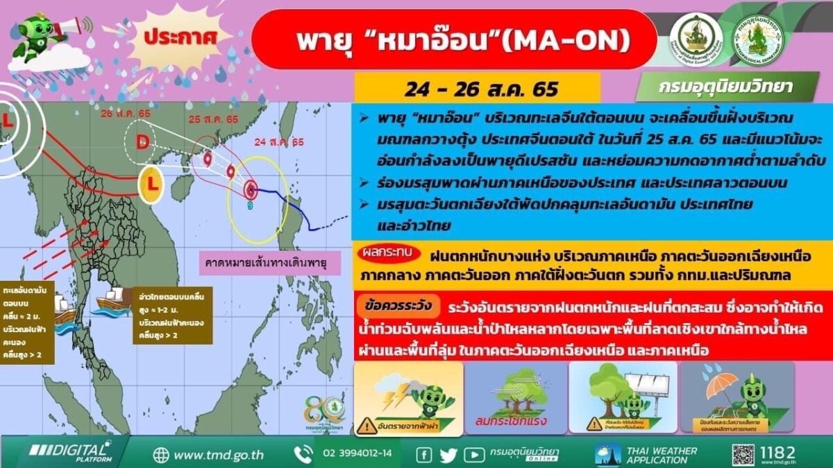 เมื่อเวลา 16.00 น. ของวันนี้ (24 ส.ค. 65) พายุโซนร้อนกำลังแรง “หมาอ๊อน” บริเวณทะเลจีนใต้ตอนบน มีศูนย์กลางอยู่ห่างประมาณ 310 กิโลเมตร ทางทิศตะวันออกเฉียงใต้ของมาเก๊า หรือที่ละติจูด 19.6 องศาเหนือ ลองจิจูด 115.0 องศาตะวันออก
