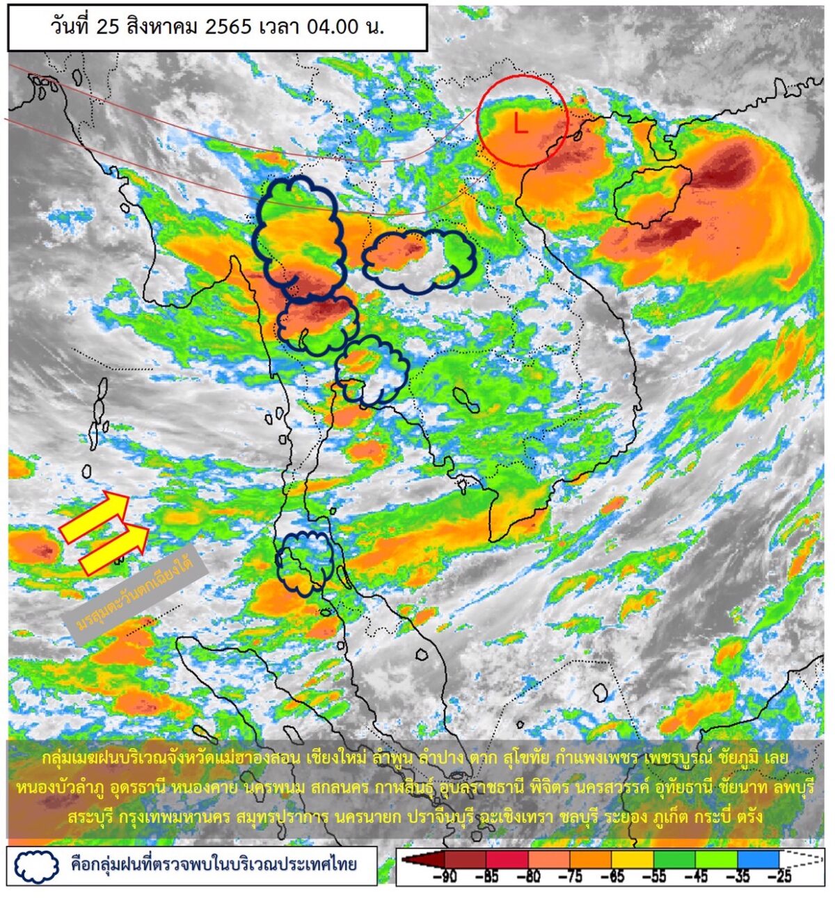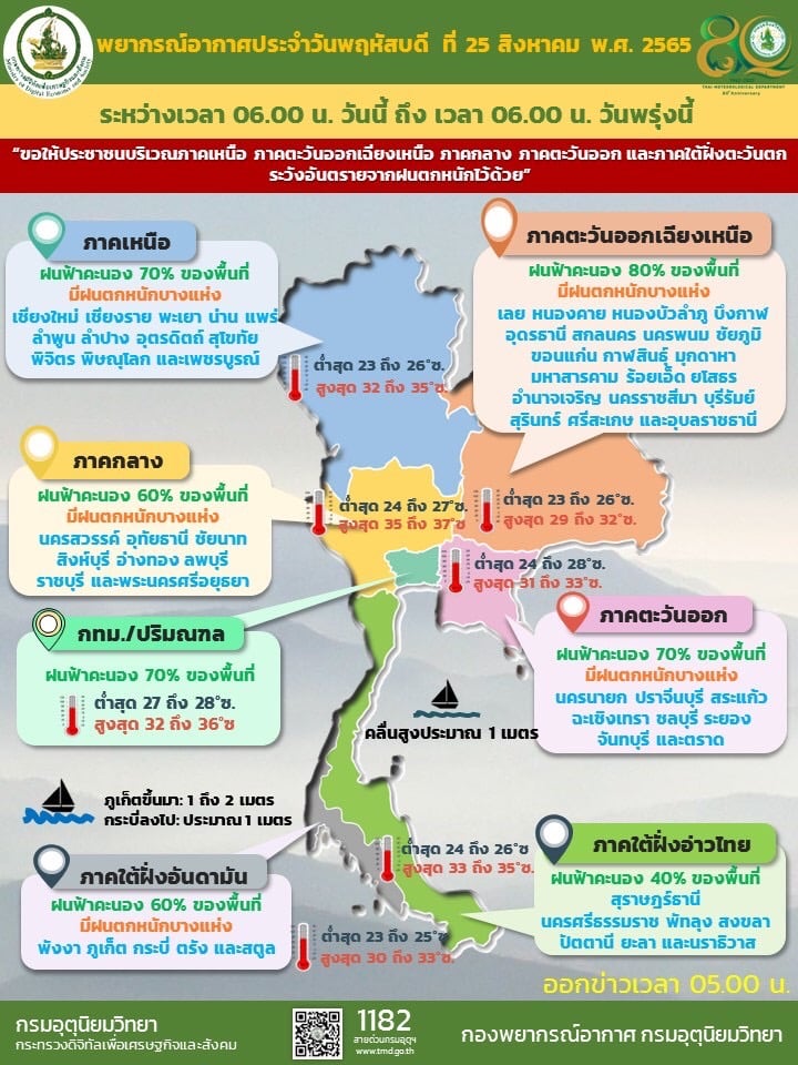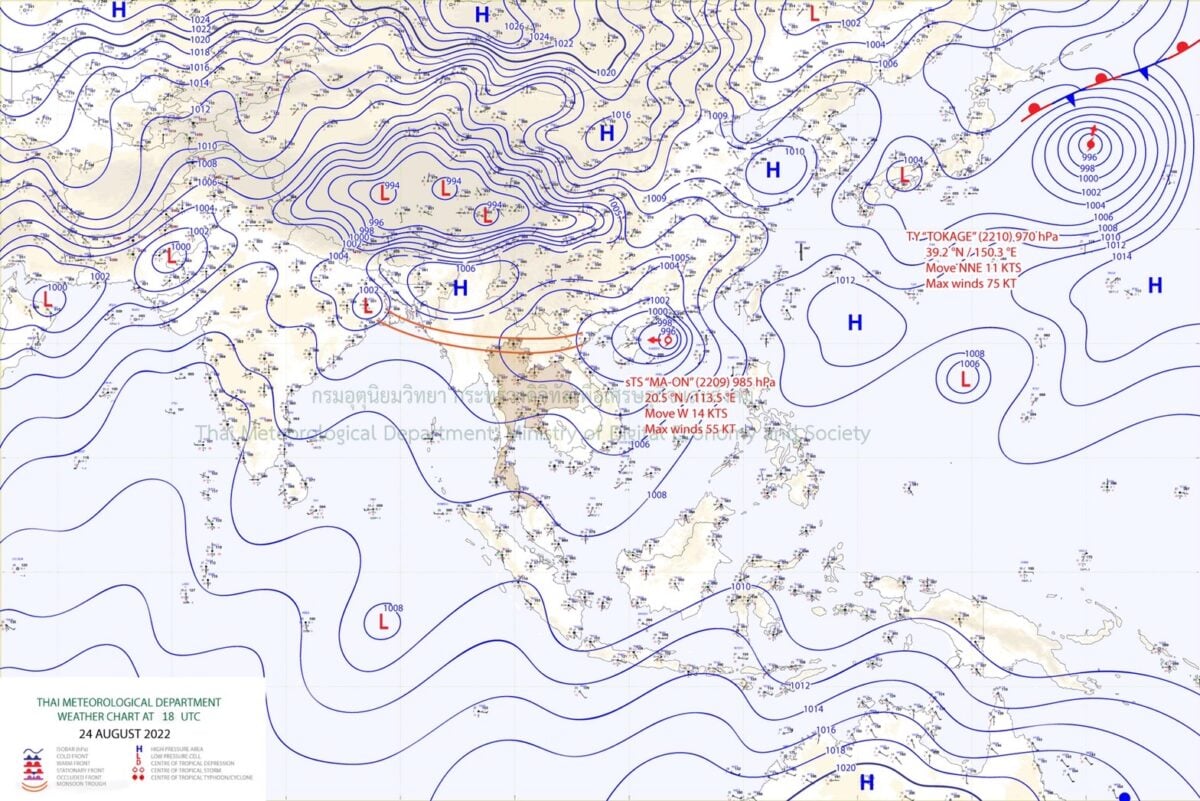 ลักษณะอากาศทั่วไป พยากรณ์อากาศ 24 ชั่วโมงข้างหน้า ร่องมรสุมพาดผ่านภาคเหนือตอนบนเข้าสู่พายุโซนร้อน “หมาอ๊อน” (MA-ON) บริเวณทะเลจีนใต้ตอนบน ประกอบกับมรสุมตะวันตกเฉียงใต้พัดปกคลุมทะเลอันดามัน ประเทศไทย และอ่าวไทย ลักษณะเช่นนี้ทำให้ประเทศไทยตอนบน มีฝนตกหนักบางแห่งบริเวณภาคเหนือ ภาคตะวันออกเฉียงเหนือ ภาคกลาง ภาคตะวันออก และภาคใต้ฝั่งตะวันตก ขอให้ประชาชนบริเวณดังกล่าว ระวังอันตรายจากฝนตกหนักไว้ด้วย