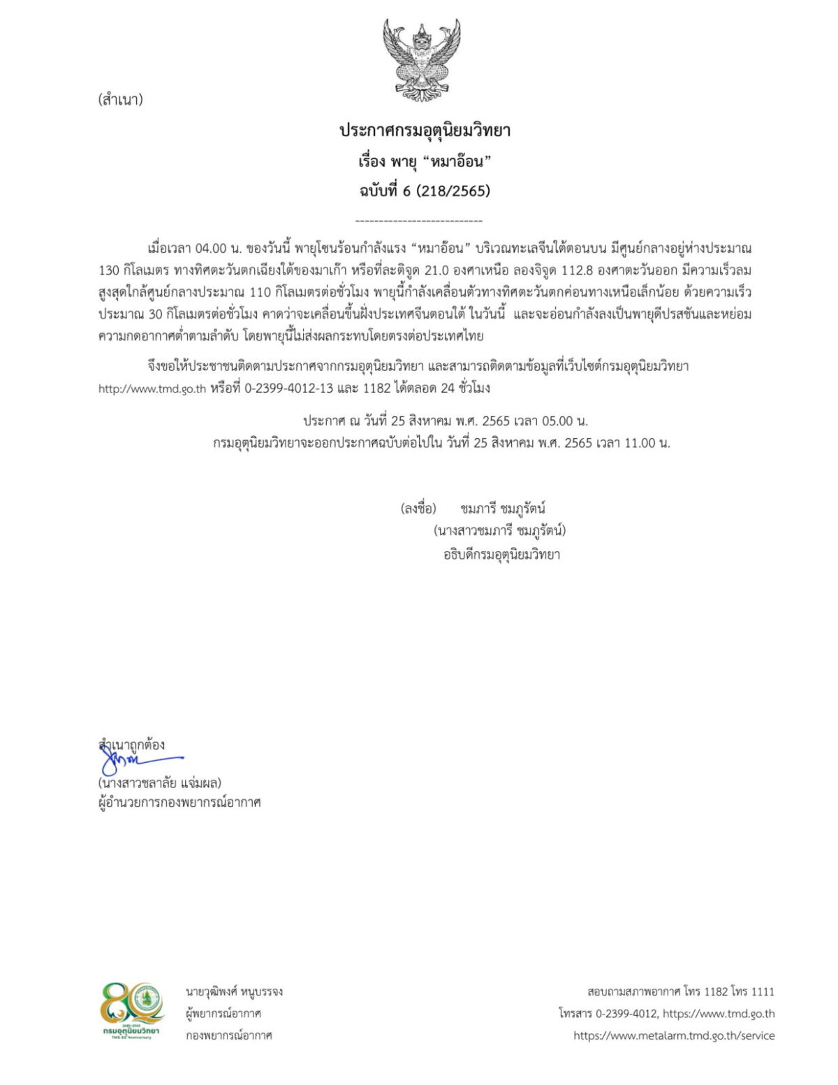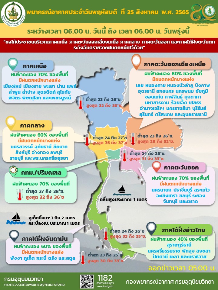 กรมอุตุนิยมวิทยาจะออกประกาศฉบับต่อไปใน วันที่ 25 สิงหาคม พ.ศ. 2565 เวลา 11.00 น.