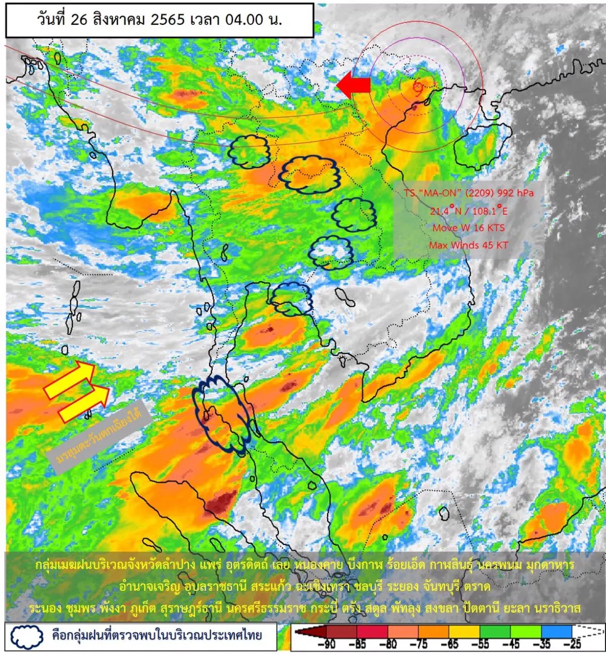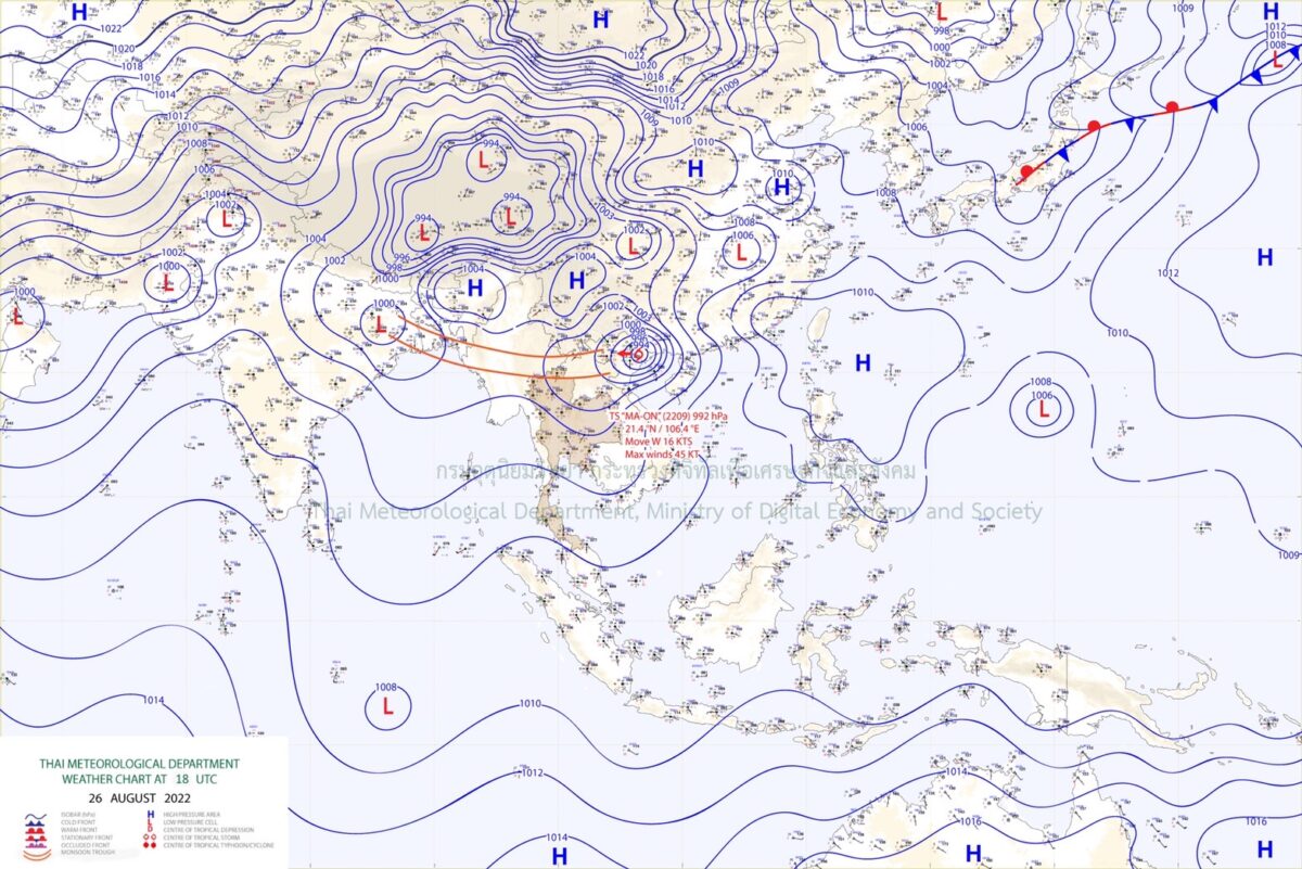 ลักษณะอากาศทั่วไป พยากรณ์อากาศ 24 ชั่วโมงข้างหน้า ร่องมรสุมกำลังแรงพาดผ่านประเทศเมียนมาและภาคเหนือตอนบน เข้าสู่พายุโซนร้อน “หมาอ๊อน” (MA-ON) บริเวณประเทศเวียดนามตอนบน ประกอบกับมรสุมตะวันตกเฉียงใต้พัดปกคลุมทะเลอันดามัน ประเทศไทย และอ่าวไทย ลักษณะเช่นนี้ทำให้ประเทศไทยมีฝนตกหนักถึงหนักมากบางแห่งบริเวณภาคเหนือ ภาคตะวันออกเฉียงเหนือ ภาคกลาง รวมทั้งกรุงเทพมหานครและปริมณฑล ภาคตะวันออก และภาคใต้ ขอให้ประชาชนในบริเวณดังกล่าวระวังอันตรายจากฝนตกหนักถึงหนักมากและฝนที่ตกสะสมซึ่งอาจทำให้เกิดน้ำท่วมฉับพลันและน้ำป่าไหลหลากโดยเฉพาะพื้นที่ลาดเชิงเขาใกล้ทางน้ำไหลผ่านและพื้นที่ลุ่มไว้ด้วย