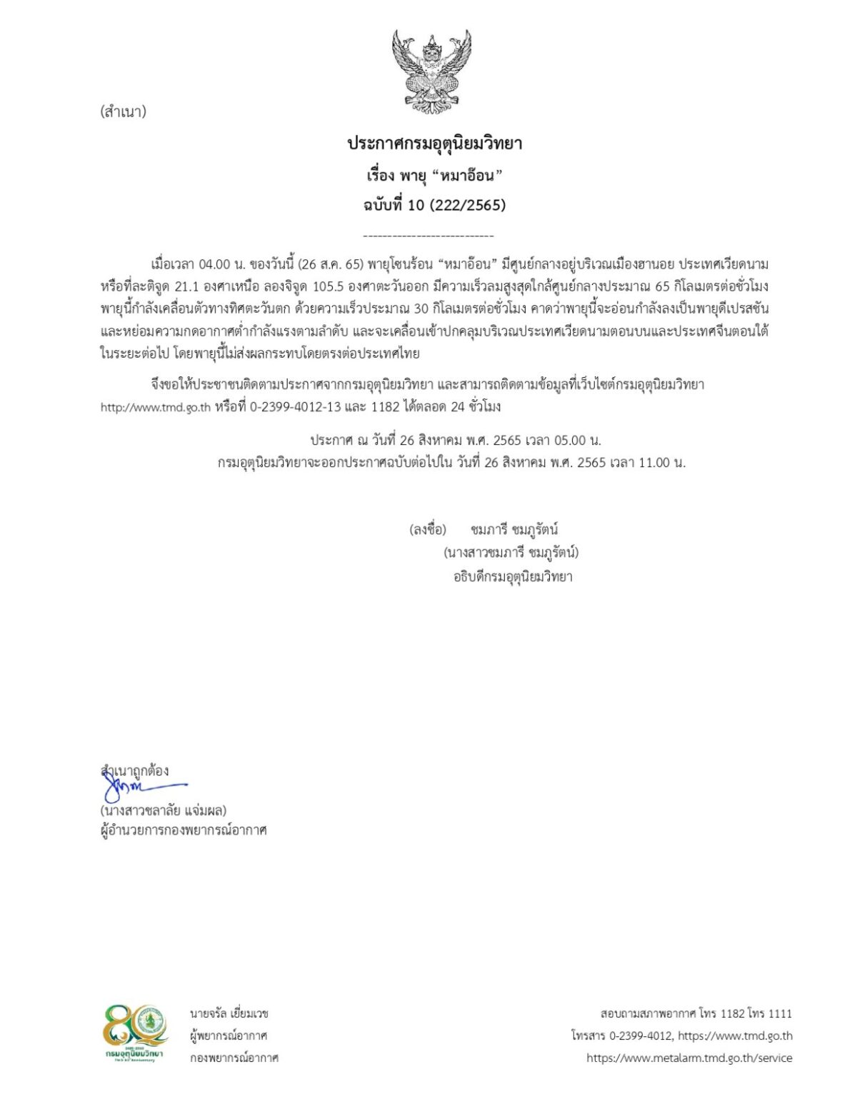 ประกาศกรมอุตุนิยมวิทยา เรื่อง พายุ “หมาอ๊อน” ฉบับที่ 10 (222/2565) เมื่อเวลา 04.00 น. ของวันนี้ (26 ส.ค. 65) พายุโซนร้อน “หมาอ๊อน” มีศูนย์กลางอยู่บริเวณเมืองฮานอย ประเทศเวียดนาม หรือที่ละติจูด 21.1 องศาเหนือ ลองจิจูด 105.5 องศาตะวันออก มีความเร็วลมสูงสุดใกล้ศูนย์กลางประมาณ 65 กิโลเมตรต่อชั่วโมง พายุนี้กำลังเคลื่อนตัวทางทิศตะวันตก ด้วยความเร็วประมาณ 30 กิโลเมตรต่อชั่วโมง คาดว่าพายุนี้จะอ่อนกำลังลงเป็นพายุดีเปรสชัน และหย่อมความกดอากาศต่ำกำลังแรงตามลำดับ และจะเคลื่อนเข้าปกคลุมบริเวณประเทศเวียดนามตอนบนและประเทศจีนตอนใต้ ในระยะต่อไป โดยพายุนี้ไม่ส่งผลกระทบโดยตรงต่อประเทศไทย