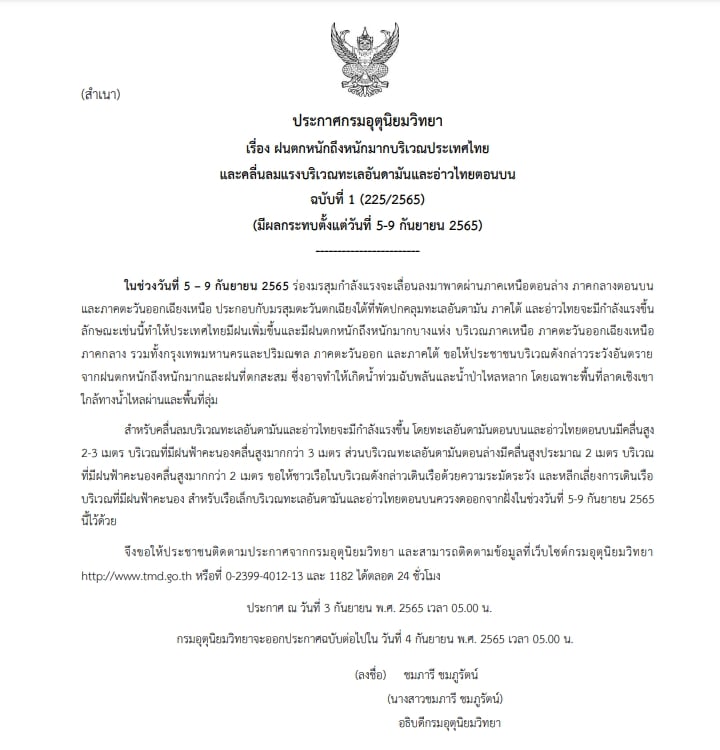 ประกาศกรมอุตุนิยมวิทยา “ฝนตกหนักถึงหนักมากบริเวณประเทศไทย และคลื่นลมแรงบริเวณทะเลอันดามันและอ่าวไทยตอนบน (มีผลกระทบตั้งแต่วันที่ 5-9 กันยายน 2565)” ิฉบับที่ 1 ลงวันที่ 3 กันยายน 2565