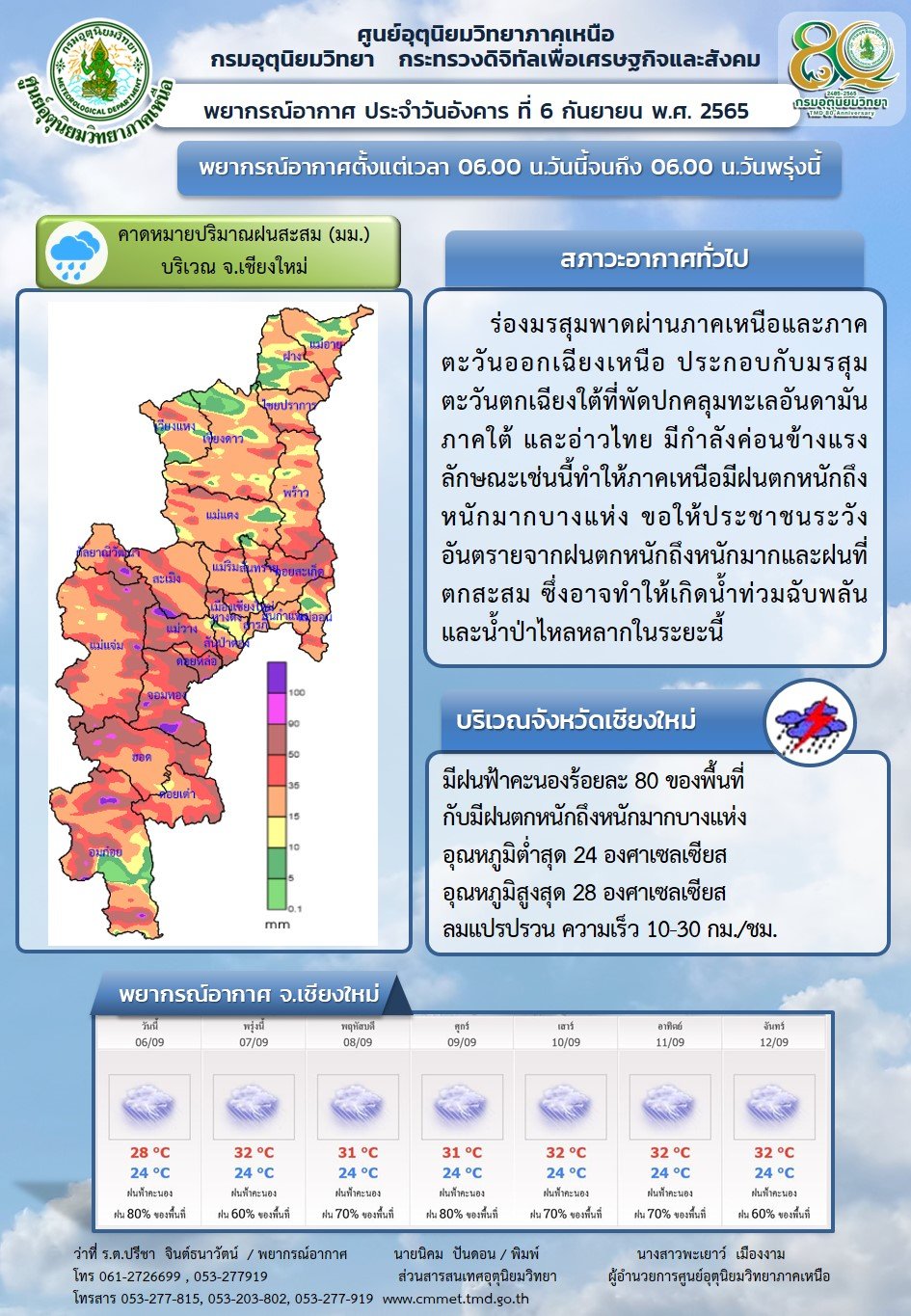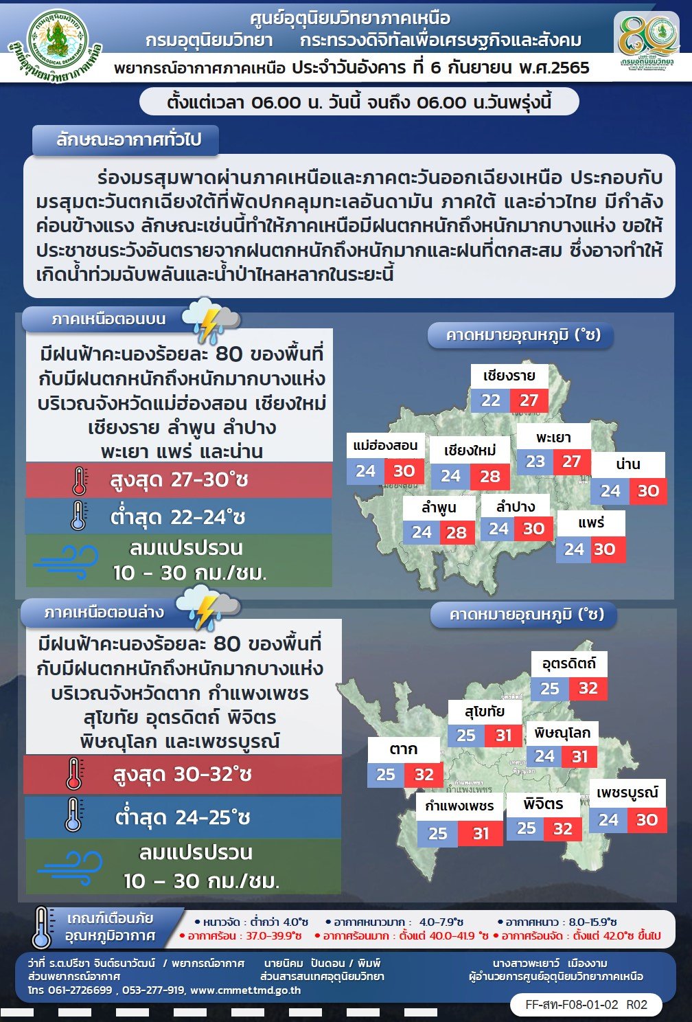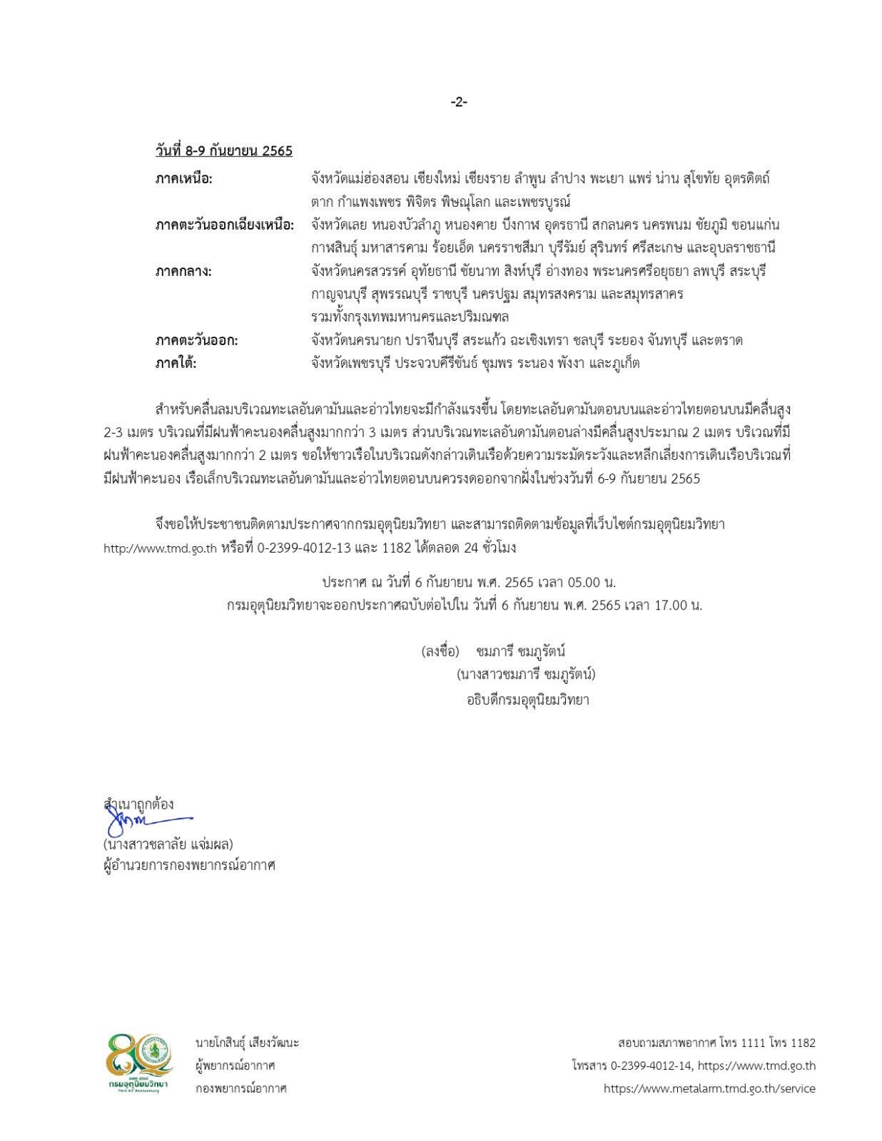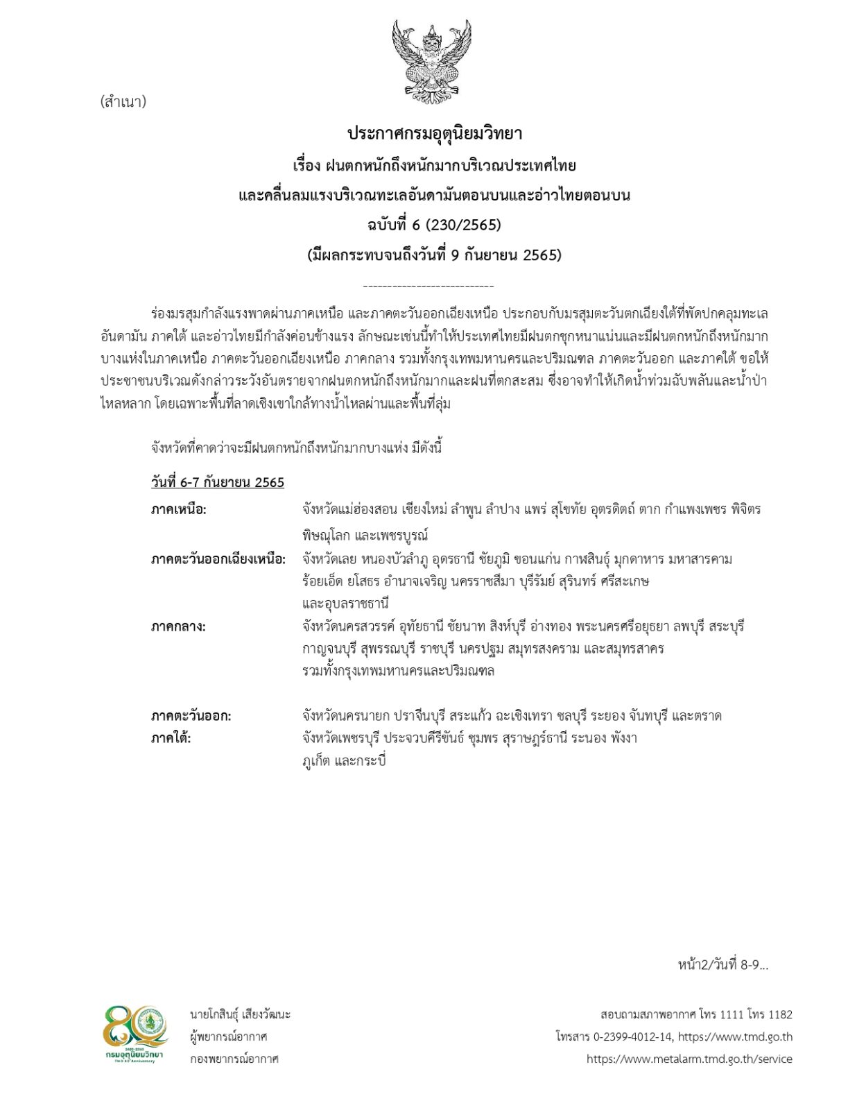 ประกาศกรมอุตุนิยมวิทยา เรื่อง ฝนตกหนักถึงหนักมากบริเวณประเทศไทย และคลื่นลมแรงบริเวณทะเลอันดามันตอนบนและอ่าวไทยตอนบน ฉบับที่ 6 (230/2565) (มีผลกระทบจนถึงวันที่ 9 กันยายน 2565)