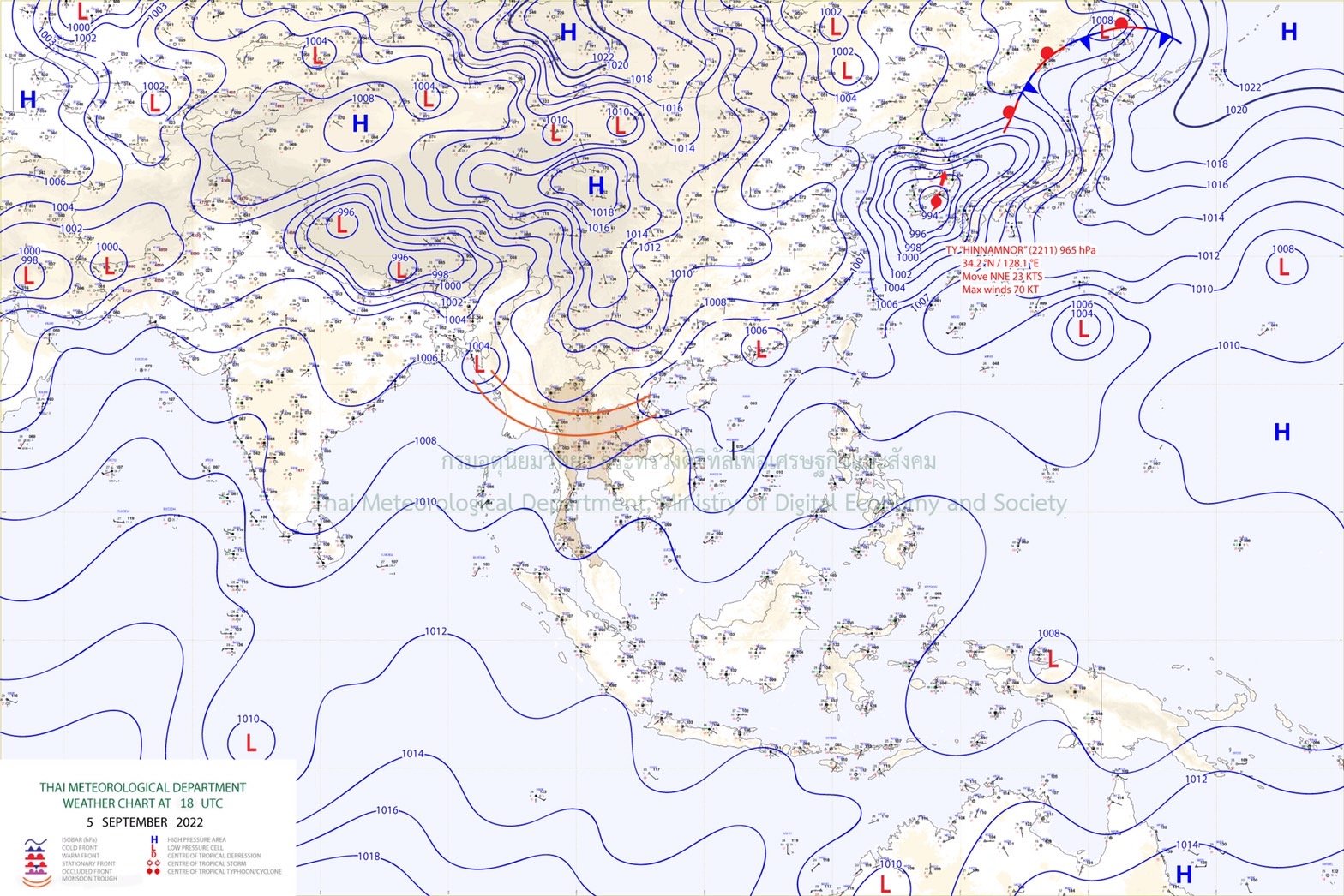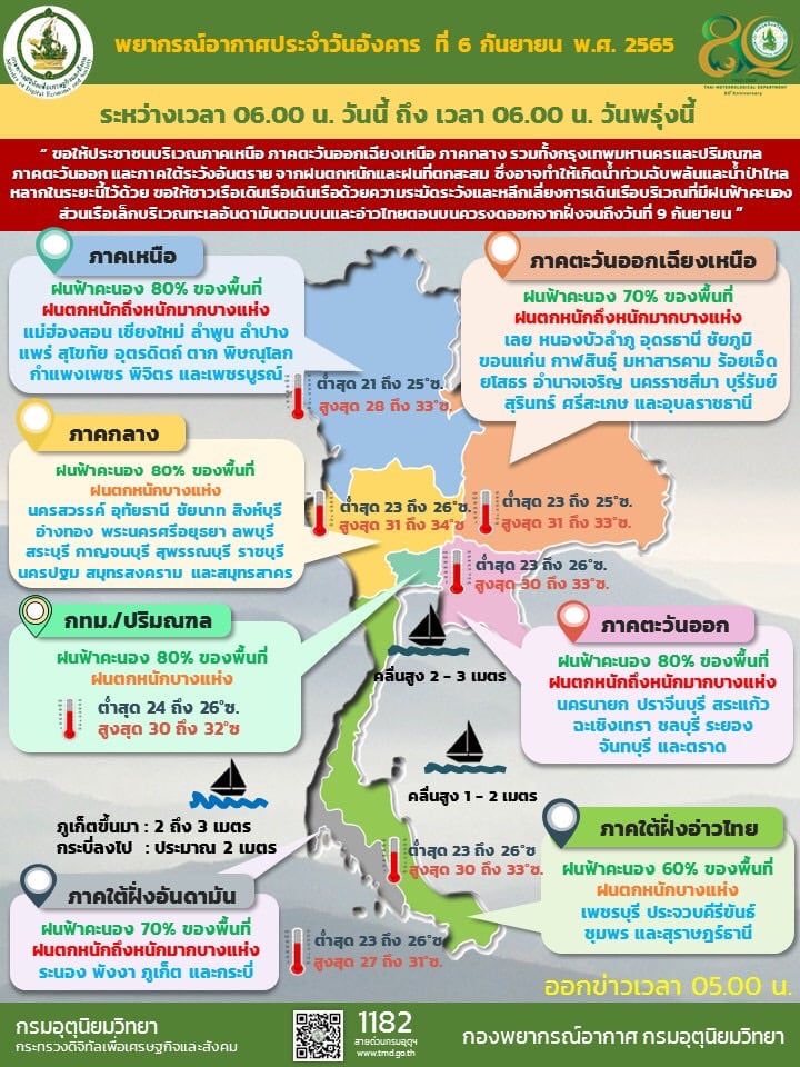สำหรับคลื่นลมบริเวณทะเลอันดามันตอนบนและอ่าวไทยตอนบนมีกำลังค่อนข้างแรง โดยมีคลื่นสูง 2-3 เมตร บริเวณที่มีฝนฟ้าคะนองคลื่นสูงมากกว่า 3 เมตรขอให้ชาวเรือในบริเวณดังกล่าวเดินเรือด้วยความระมัดระวังและหลีกเลี่ยงการเดินเรือบริเวณที่มีฝนฟ้าคะนอง ส่วนเรือเล็กบริเวณทะเลอันดามันตอนบนและอ่าวไทยตอนบนควรงดออกจากฝั่งจนถึงวันที่ 9 กันยายน 2565