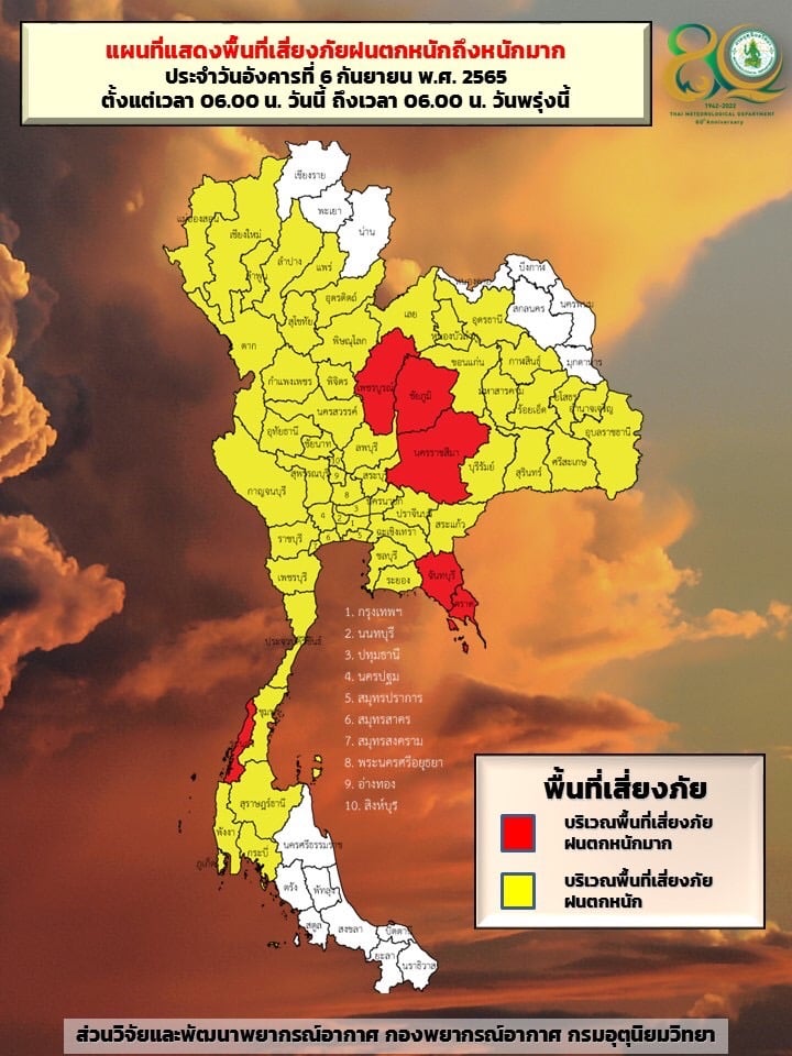 ลักษณะอากาศทั่วไป พยากรณ์อากาศ 24 ชั่วโมงข้างหน้า ประเทศไทยมีฝนตกชุกหนาแน่น และมีฝนตกหนักถึงหนักมากบางแห่งบริเวณภาคเหนือ ภาคตะวันออกเฉียงเหนือ ภาคกลาง รวมทั้งกรุงเทพมหานครและปริมณฑล ภาคตะวันออก และภาคใต้ ทั้งนี้เนื่องจากร่องมรสุมกำลังแรงพาดผ่านภาคเหนือ และภาคตะวันออกเฉียงเหนือ ประกอบกับมรสุมตะวันตกเฉียงใต้ที่พัดปกคลุมทะเลอันดามัน ภาคใต้ และอ่าวไทย มีกำลังค่อนข้างแรง ขอให้ประชาชนในบริเวณดังกล่าวระวังอันตรายจากฝนตกหนักและฝนที่ตกสะสม ซึ่งอาจทำให้เกิดน้ำท่วมฉับพลันและน้ำป่าไหลหลาก โดยเฉพาะพื้นที่ลาดเชิงเขาใกล้ทางน้ำไหลผ่านและพื้นที่ลุ่มในระยะนี้ไว้ด้วย