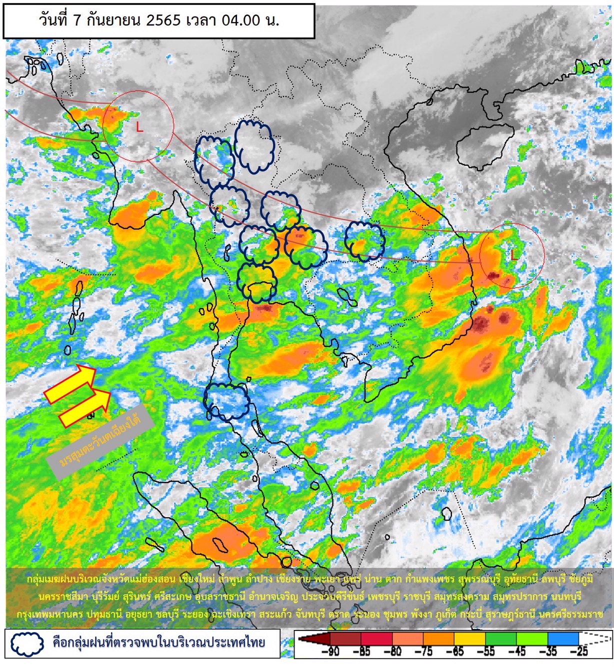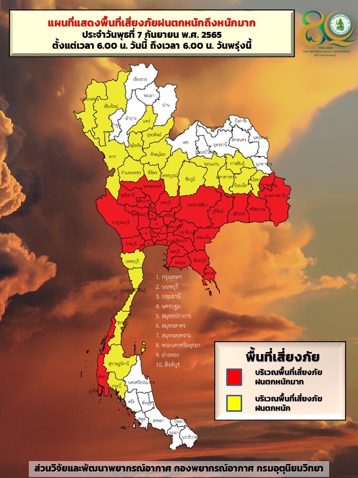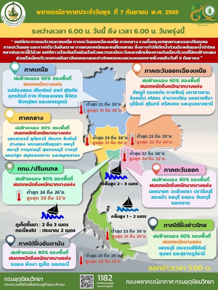 ลักษณะอากาศทั่วไป พยากรณ์อากาศ 24 ชั่วโมงข้างหน้า บริเวณความกดอากาศสูงจากประเทศจีน แผ่ลงมาปกคลุมประเทศลาว ภาคเหนือตอนบน และภาคตะวันออกเฉียงเหนือตอนบน ส่งผลทำให้ร่องมรสุมกำลังแรงเลื่อนลงมาพาดผ่านภาคกลาง และภาคตะวันออกเฉียงเหนือตอนล่าง เข้าสู่หย่อมความกดอากาศต่ำบริเวณชายฝั่งประเทศเวียดนามตอนกลาง ประกอบกับมรสุมตะวันตกเฉียงใต้ ที่พัดปกคลุมทะเลอันดามัน ภาคใต้ และอ่าวไทย มีกำลังค่อนข้างแรง ลักษณะเช่นนี้ทำให้ภาคเหนือตอนล่าง ภาคตะวันออกเฉียงเหนือตอนล่าง ภาคกลาง รวมทั้งกรุงเทพมหานครและปริมณฑล ภาคตะวันออก และภาคใต้ และมีฝนตกหนักถึงหนักมากบางแห่ง ขอให้ประชาชนในบริเวณดังกล่าว ระวังอันตรายจากฝนตกหนักและฝนที่ตกสะสม ซึ่งอาจทำให้เกิดน้ำท่วมฉับพลันและน้ำป่าไหลหลาก โดยเฉพาะพื้นที่ลาดเชิงเขาใกล้ทางน้ำไหลผ่านและพื้นที่ลุ่มในระยะนี้ไว้ด้วย