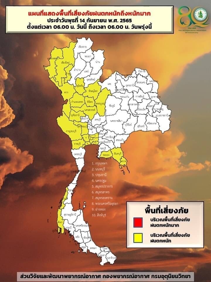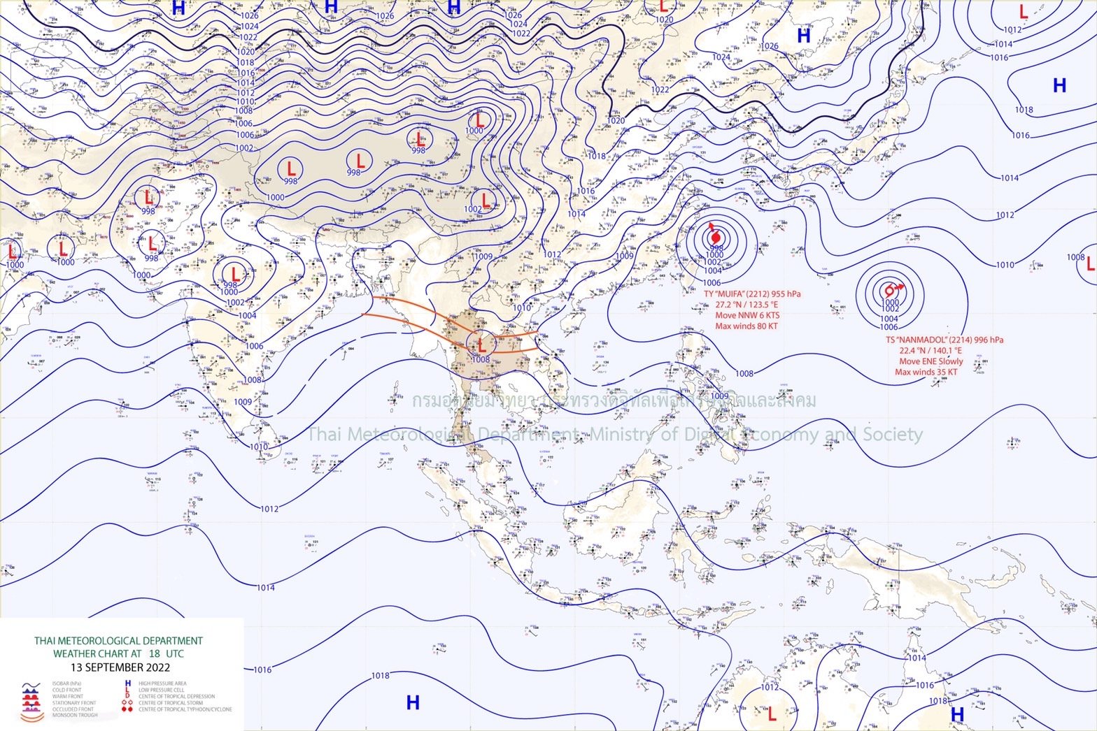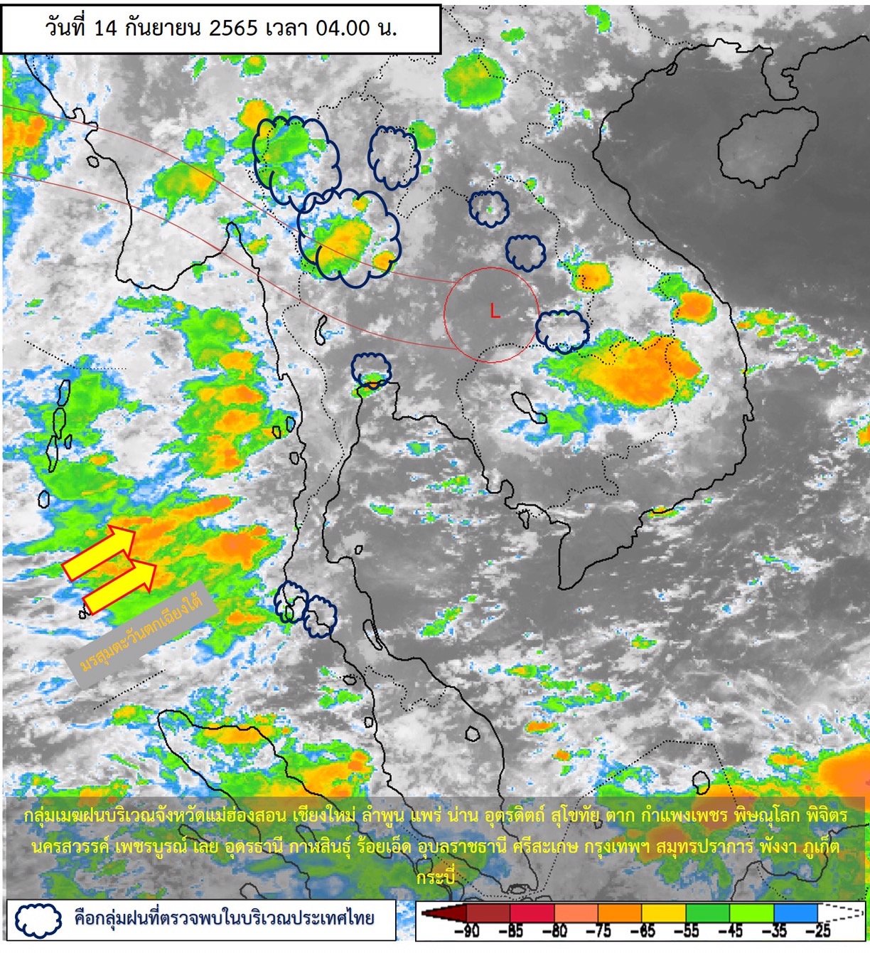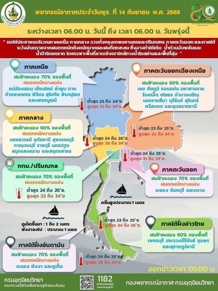 ลักษณะอากาศทั่วไป พยากรณ์อากาศ 24 ชั่วโมงข้างหน้า บริเวณความกดอากาศสูงปกคลุมประเทศลาวตอนบน และเวียดนามตอนบน ประกอบกับร่องมรสุมพาดผ่านภาคเหนือ และภาคตะวันออกเฉียงเหนือ ส่วนมรสุมตะวันตกเฉียงใต้พัดปกคลุมทะเลอันดามัน ภาคใต้ฝั่งตะวันตก และอ่าวไทย ลักษณะเช่นนี้ทำให้ประเทศไทยยังคงมีฝนตกต่อเนื่องและมีฝนตกหนักบางแห่งในภาคเหนือ ภาคกลาง รวมทั้งกรุงเทพมหานครและปริมณฑล ภาคตะวันออก และภาคใต้ ขอให้ประชาชนในบริเวณดังกล่าวระวังอันตรายจากฝนตกหนักและฝนที่ตกสะสม ซึ่งอาจทำให้เกิดน้ำท่วมฉับพลันและน้ำป่าไหลหลาก โดยเฉพาะพื้นที่ลาดเชิงเขาใกล้ทางน้ำไหลผ่านและพื้นที่ลุ่มในระยะนี้ไว้ด้วย
