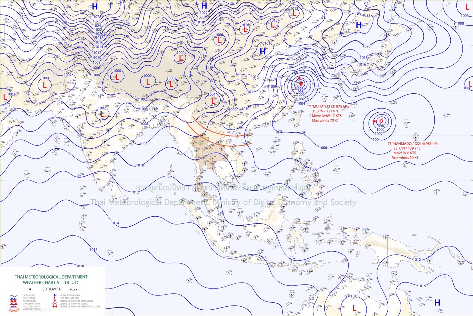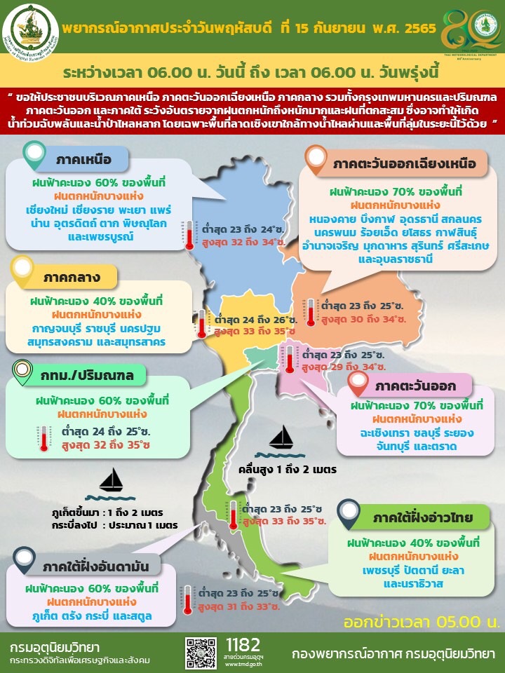 ลักษณะอากาศทั่วไป พยากรณ์อากาศ 24 ชั่วโมงข้างหน้า ร่องมรสุมพาดผ่านภาคเหนือตอนบนและภาคตะวันออกเฉียงเหนือตอนบน ประกอบกับมรสุมตะวันตกเฉียงใต้พัดปกคลุมทะเลอันดามัน ภาคใต้ และอ่าวไทย ลักษณะเช่นนี้ทำให้ประเทศไทยมีฝนตกหนักบางแห่งในภาคเหนือ ภาคตะวันออกเฉียงเหนือ ภาคกลาง รวมทั้งกรุงเทพมหานครและปริมณฑล ภาคตะวันออก และภาคใต้ ขอให้ประชาชนในบริเวณดังกล่าวระวังอันตรายจากฝนตกหนักและฝนที่ตกสะสม ซึ่งอาจทำให้เกิดน้ำท่วมฉับพลันและน้ำป่าไหลหลาก โดยเฉพาะพื้นที่ลาดเชิงเขาใกล้ทางน้ำไหลผ่านและพื้นที่ลุ่มในระยะนี้ไว้ด้วย