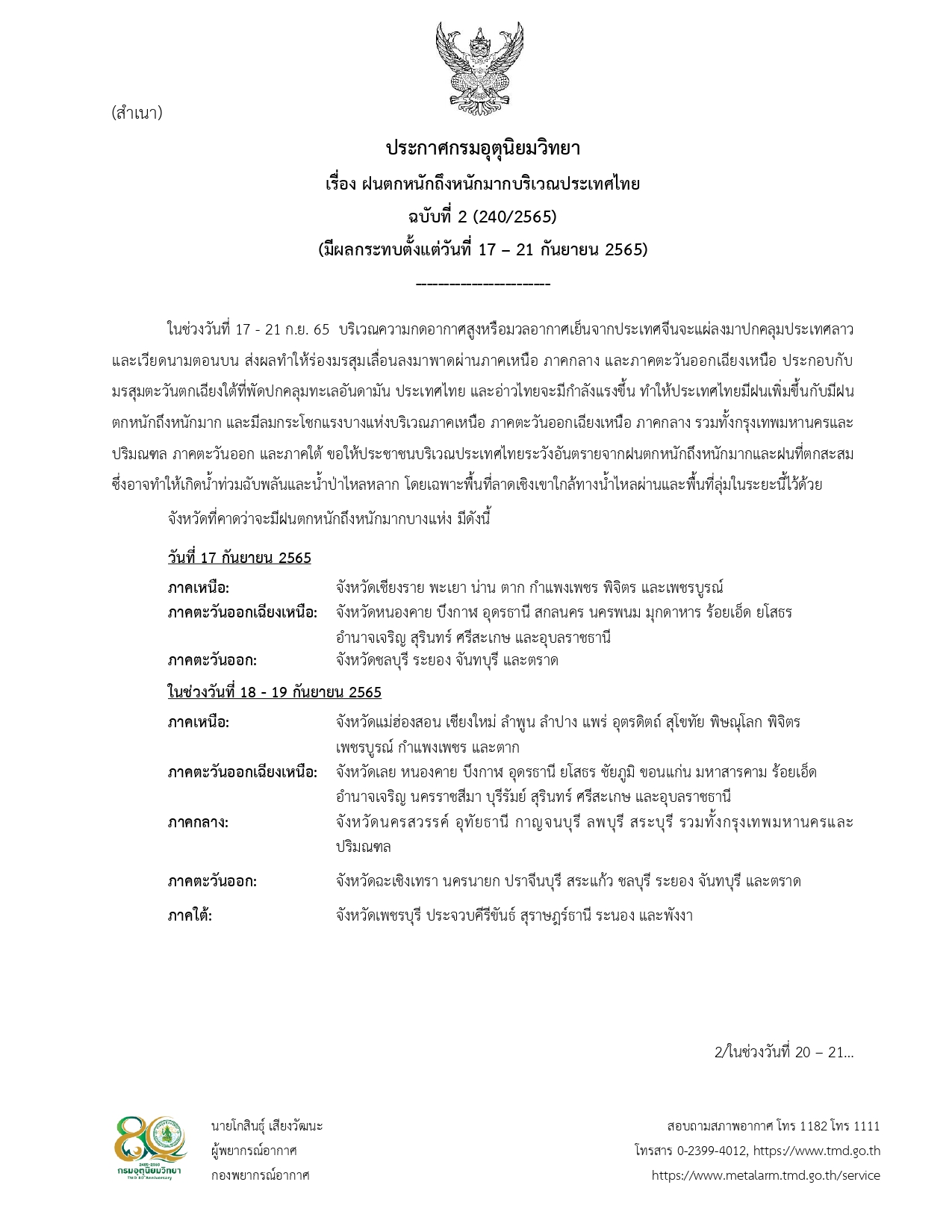 ประกาศกรมอุตุนิยมวิทยา เรื่อง ฝนตกหนักถึงหนักมากบริเวณประเทศไทย ฉบับที่ 2 (240/2565) มีผลกระทบตั้งแต่วันที่ 17 – 21 กันยายน 2565