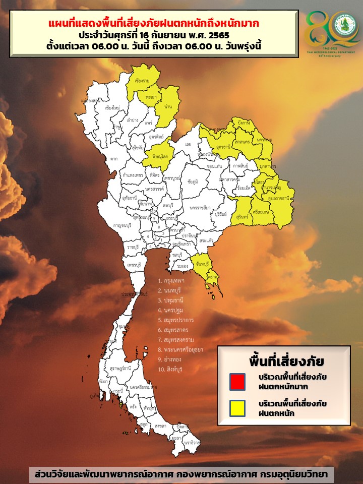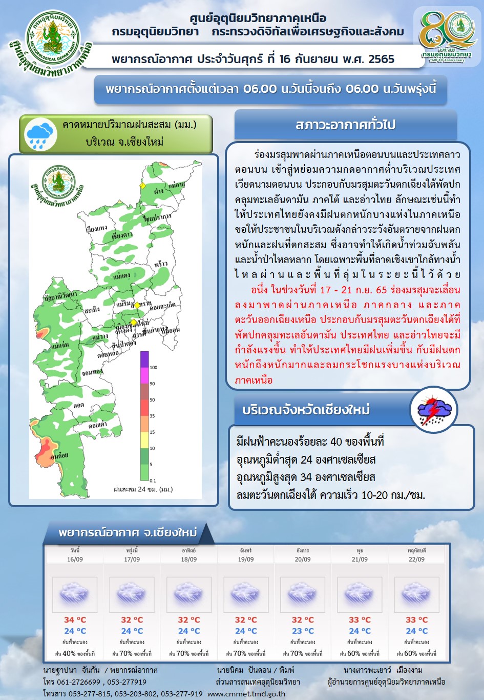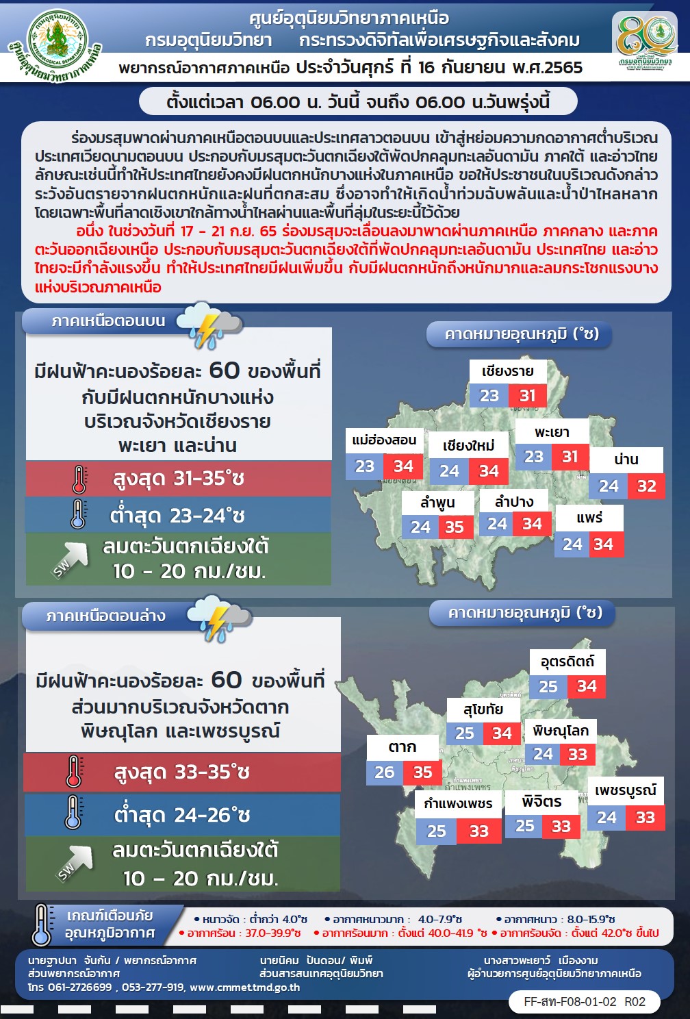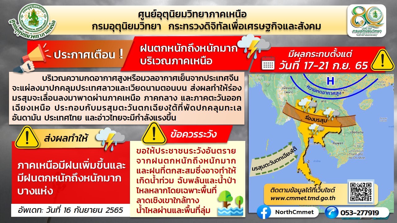 ในช่วงวันที่ 17 – 21 ก.ย. 65 บริเวณความกดอากาศสูงหรือมวลอากาศเย็นจากประเทศจีน จะแผ่ลงมาปกคลุมประเทศลาว และเวียดนามตอนบน ส่งผลทำให้ร่องมรสุมเลื่อนลงมาพาดผ่านภาคเหนือ ภาคกลาง และภาคตะวันออกเฉียงเหนือ ประกอบกับมรสุมตะวันตกเฉียงใต้ ที่พัดปกคลุมทะเลอันดามัน ประเทศไทย และอ่าวไทยจะมีกำลังแรงขึ้น ทำให้ประเทศไทยมีฝนเพิ่มขึ้นกับมีฝนตกหนักถึงหนักมาก และมีลมกระโชกแรงบางแห่ง บริเวณภาคเหนือ ภาคตะวันออกเฉียงเหนื่อ ภาคกลาง รวมทั้งกรุงเทพมหานครและปริมณฑล ภาคตะวันออก และภาคใต้ ขอให้ประชาชนบริเวณประเทศไทย ระวังอันตรายจากฝนตกหนักถึงหนักมากและฝนที่ตกสะสม ซึ่งอาจทำให้เกิดน้ำท่วมฉับพลันและน้ำป่าไหลหลาก โดยเฉพาะพื้นที่ลาดเชิงเขาใกล้ทางน้ำไหลผ่านและพื้นที่ลุ่มในระยะนี้ไว้ด้วย