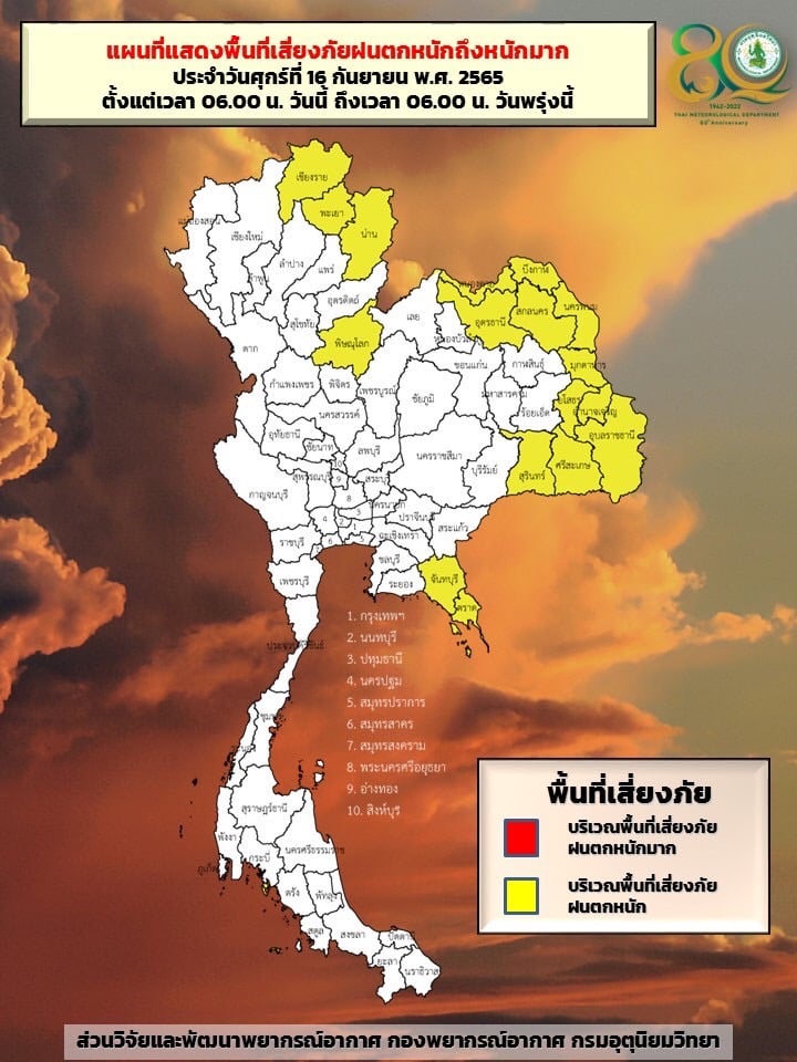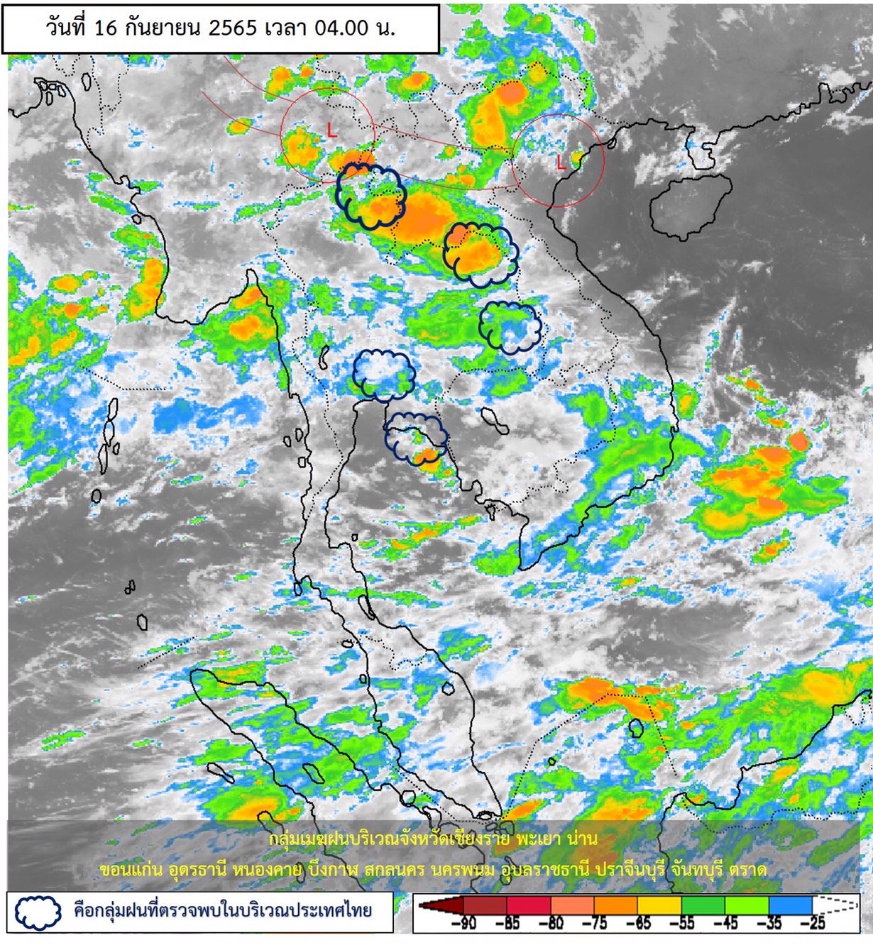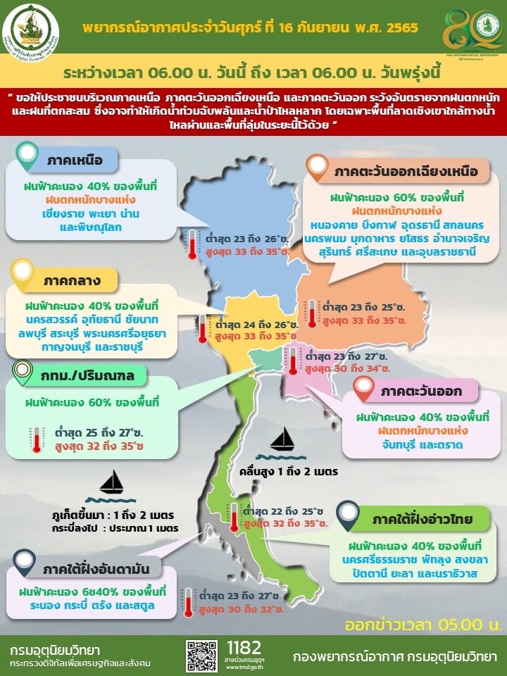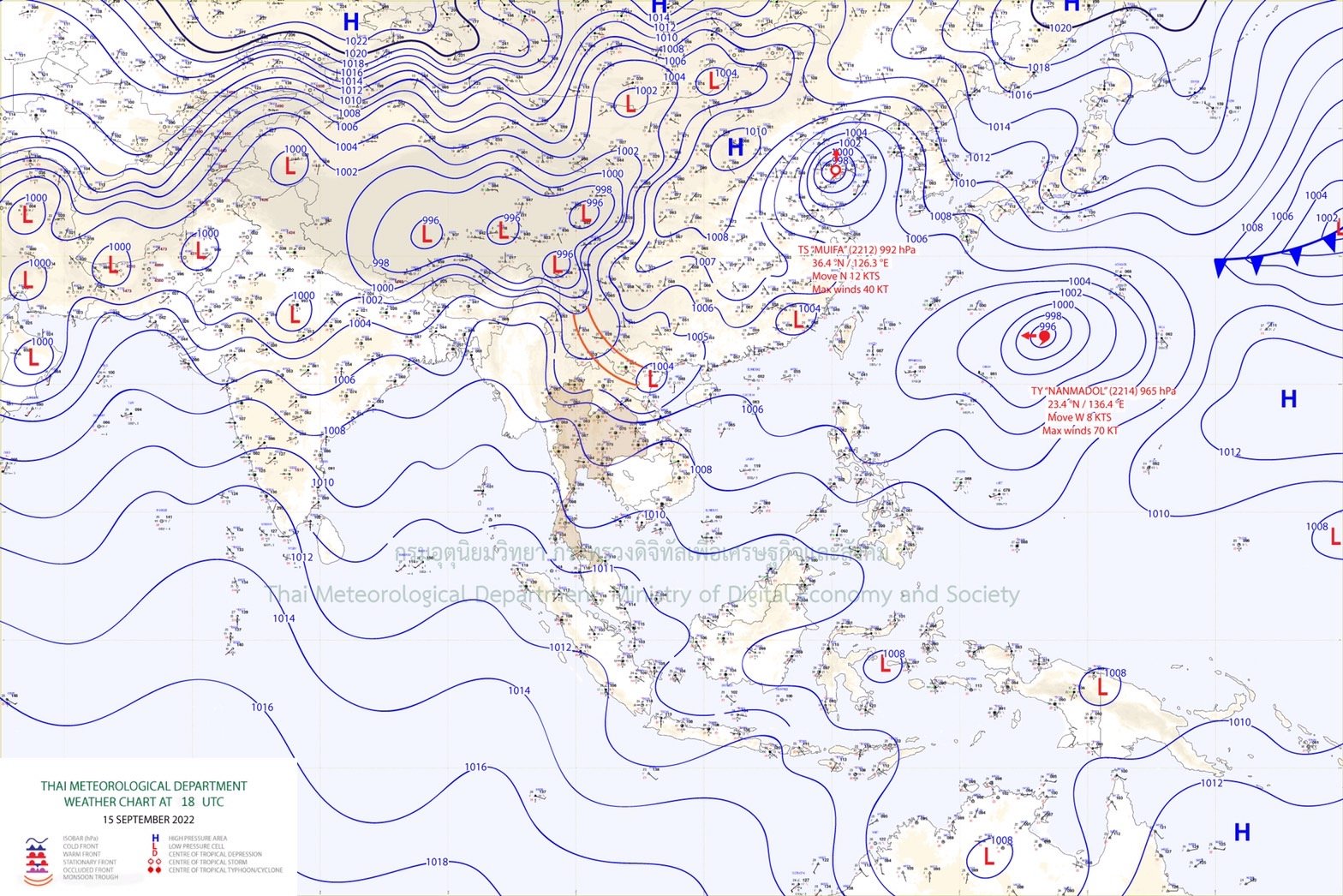อนึ่ง ในช่วงวันที่ 17 – 21 ก.ย. 65 ร่องมรสุมจะเลื่อนลงมาพาดผ่านภาคเหนือ ภาคกลาง และภาคตะวันออกเฉียงเหนือ ประกอบกับมรสุมตะวันตกเฉียงใต้ ที่พัดปกคลุมทะเลอันดามัน ประเทศไทย และอ่าวไทยจะมีกำลังแรงขึ้น ทำให้ประเทศไทยมีฝนเพิ่มขึ้น กับมีฝนตกหนักถึงหนักมากและลมกระโชกแรงบางแห่ง บริเวณภาคเหนือ ภาคตะวันออกเฉียงเหนือ ภาคกลาง รวมทั้งกรุงเทพมหานครและปริมณฑล ภาคตะวันออก และภาคใต้ สำหรับคลื่นลมบริเวณทะเลอันดามันและอ่าวไทยจะมีกำลังแรงขึ้น โดยทะเลอันดามันตอนบนและอ่าวไทยตอนบนมีคลื่นสูง 1 – 2 เมตร บริเวณที่มีฝนฟ้าคะนองคลื่นสูงมากกว่า 2 เมตร