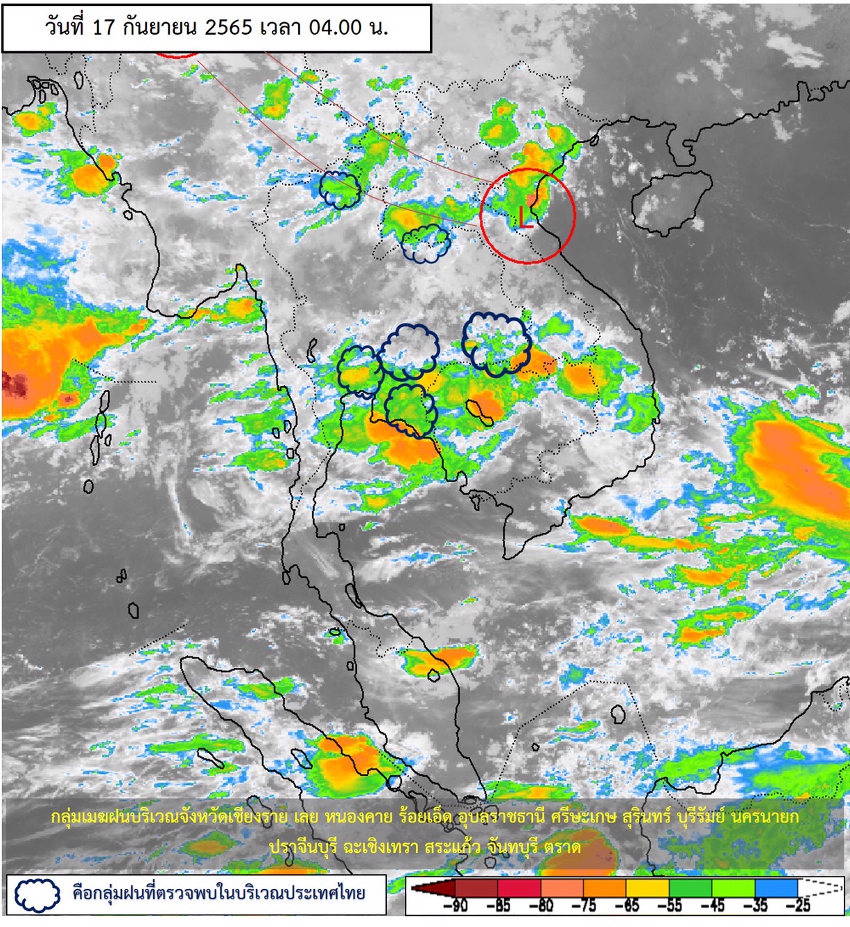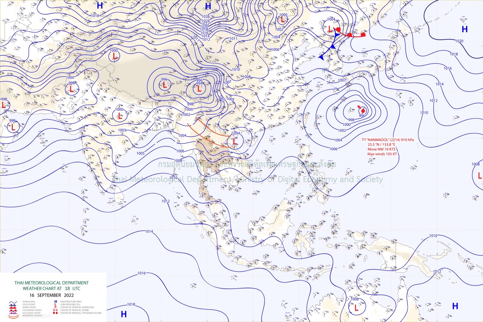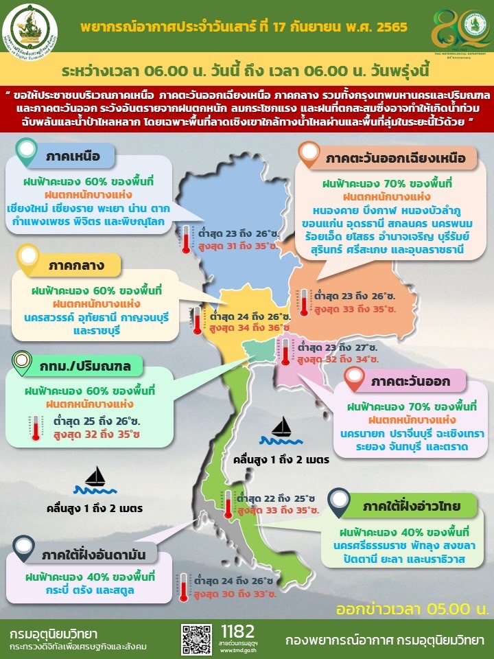 ลักษณะอากาศทั่วไป พยากรณ์อากาศ 24 ชั่วโมงข้างหน้า ร่องมรสุมเลื่อนลงมาพาดผ่านภาคเหนือตอนบน และภาคตะวันออกเฉียงเหนือตอนบน เข้าสู่หย่อมความกดอากาศต่ำ บริเวณประเทศเวียดนามตอนบน ประกอบกับมรสุมตะวันตกเฉียงใต้ ที่พัดปกคลุมทะเลอันดามัน ประเทศไทย และอ่าวไทยมีกำลังแรงขึ้น ลักษณะเช่นนี้ทำให้ประเทศไทย