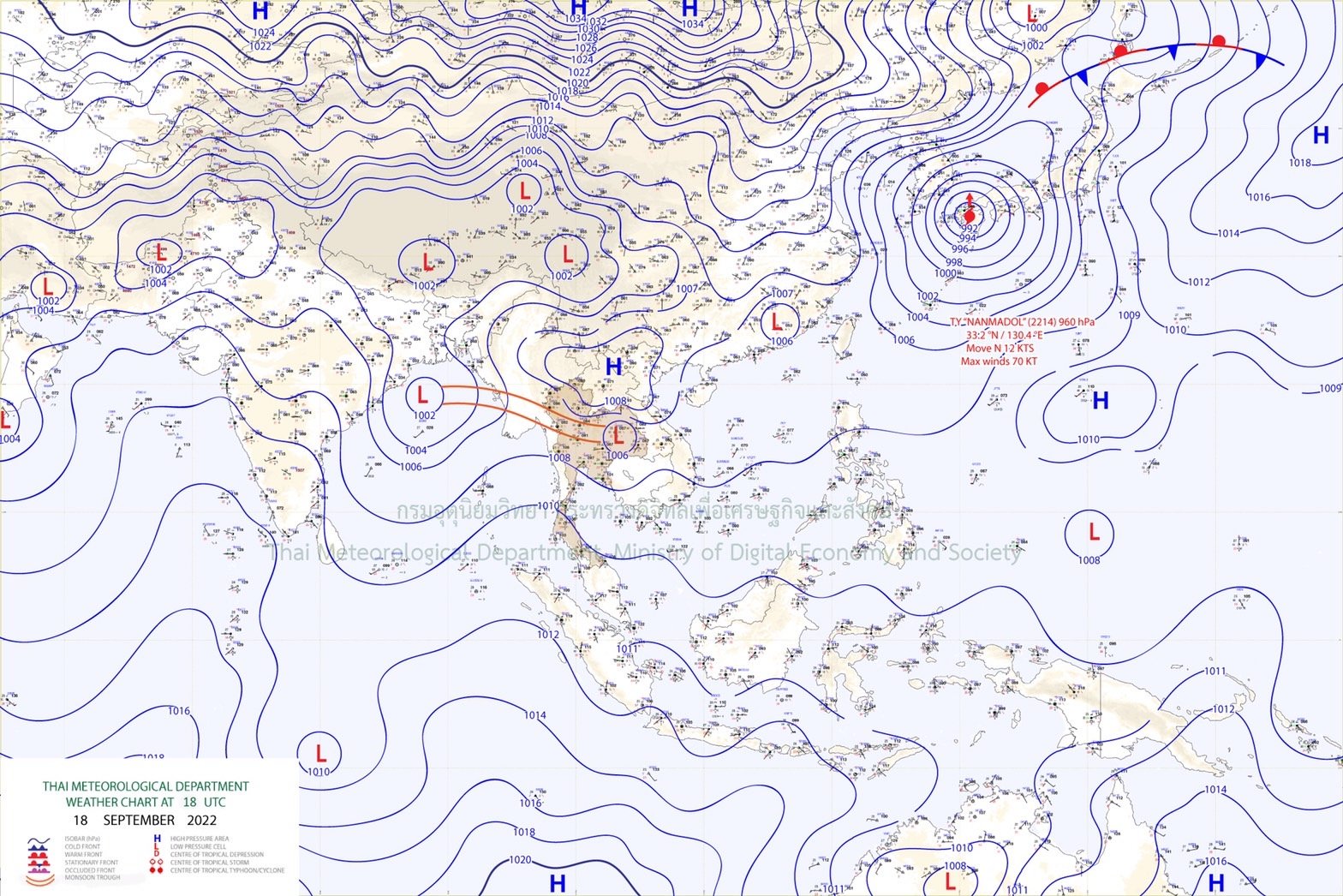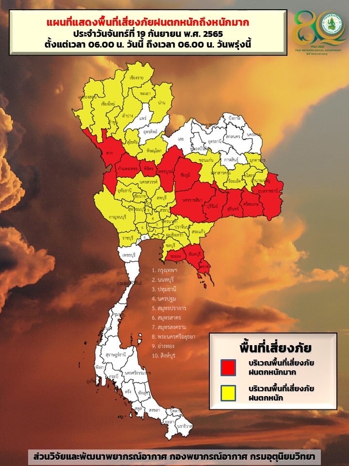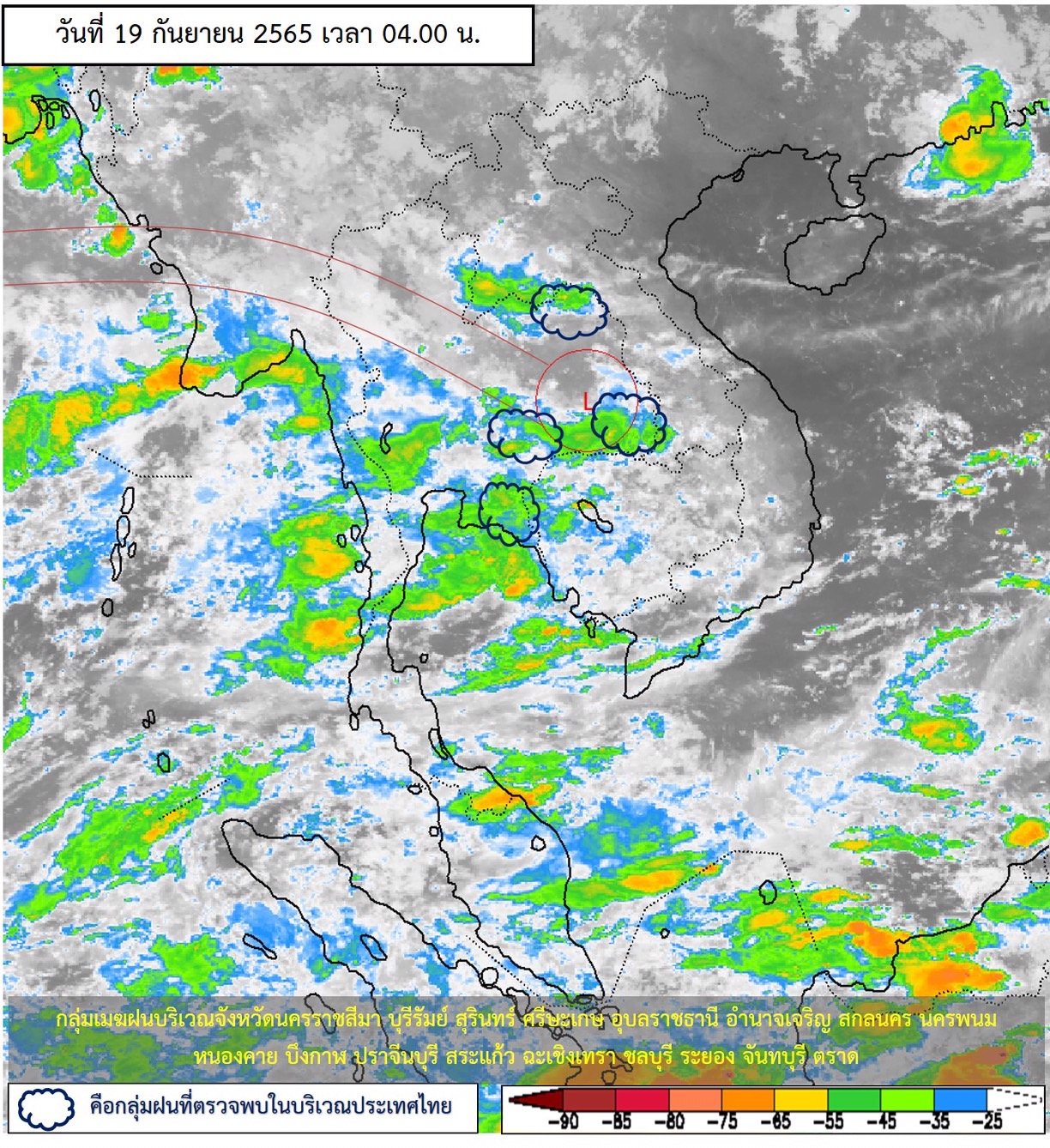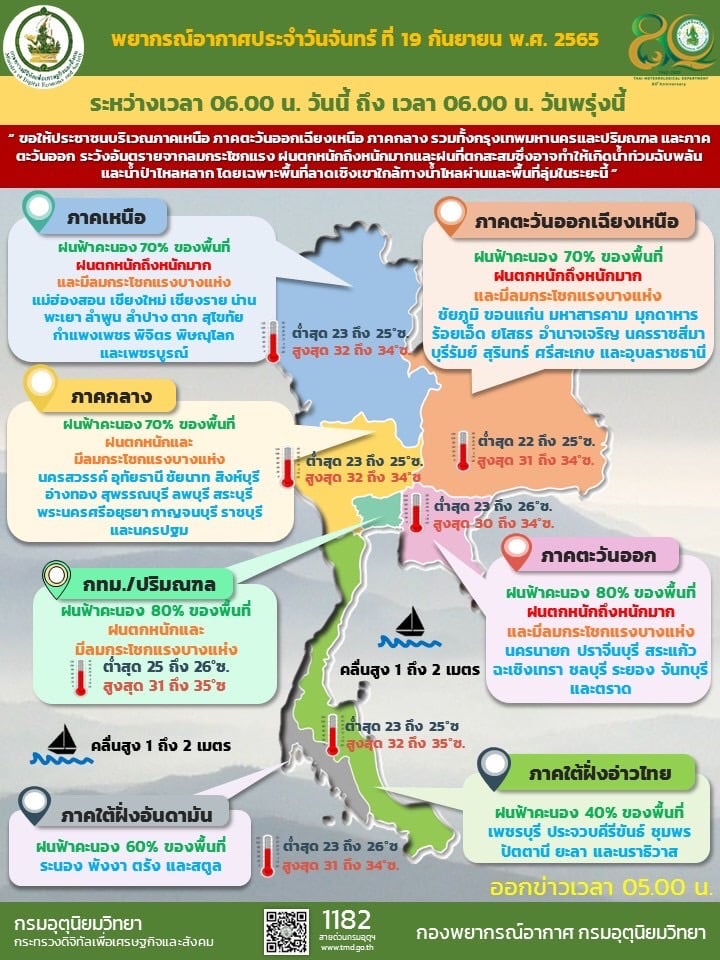 ลักษณะอากาศทั่วไป พยากรณ์อากาศ 24 ชั่วโมงข้างหน้า บริเวณความกดอากาศสูงหรือมวลอากาศเย็นจากประเทศจีนแผ่ลงมาปกคลุมประเทศลาวตอนบนและประเทศเวียดนามตอนบน ส่งผลทำให้ร่องมรสุมเลื่อนลงมาพาดผ่านภาคเหนือตอนล่าง ภาคกลางตอนบน เข้าสู่หย่อมความกดอากาศต่ำบริเวณภาคตะวันออกเฉียงเหนือของประเทศไทย ประกอบกับมรสุมตะวันตกเฉียงใต้ที่พัดปกคลุมทะเลอันดามัน ประเทศไทย และอ่าวไทยมีกำลังปานกลาง ลักษณะเช่นนี้ทำให้ประเทศไทยมีฝนเพิ่มขึ้น กับมีลมกระโชกแรงบางแห่ง และมีฝนตกหนักถึงหนักมากบางพื้นที่ในภาคเหนือ ภาคตะวันออกเฉียงเหนือ ภาคกลาง รวมทั้งกรุงเทพมหานครและปริมณฑล และภาคตะวันออก ขอให้ประชาชนในบริเวณดังกล่าวระวังอันตรายจากลมกระโชกแรง ฝนตกหนักถึงหนักมากและฝนที่ตกสะสม ซึ่งอาจทำให้เกิดน้ำท่วมฉับพลันและน้ำป่าไหลหลาก โดยเฉพาะพื้นที่ลาดเชิงเขาใกล้ทางน้ำไหลผ่านและพื้นที่ลุ่มในระยะนี้ไว้ด้วย