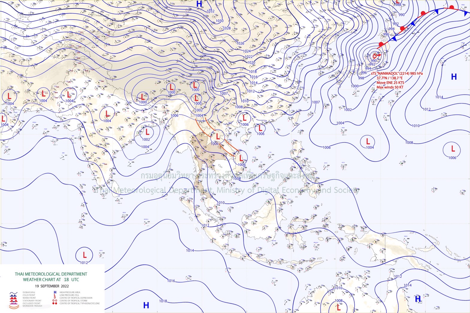 ลักษณะอากาศทั่วไป พยากรณ์อากาศ 24 ชั่วโมงข้างหน้า ร่องมรสุมพาดผ่านประเทศเมียนมาและประเทศลาวตอนบน เข้าสู่หย่อมความกดอากาศต่ำ บริเวณประเทศเวียดนามตอนกลาง ประกอบกับมรสุมตะวันตกเฉียงใต้ที่พัดปกคลุมทะเลอันดามัน ภาคใต้ และอ่าวไทยมีกำลังปานกลาง ลักษณะเช่นนี้ทำให้ประเทศไทยยังคงมีฝนตกหนักบางพื้นที่ ในภาคเหนือ ภาคตะวันออกเฉียงเหนือ และภาคตะวันออก ขอให้ประชาชนในบริเวณดังกล่าว ระวังอันตรายจากฝนตกหนักและฝนที่ตกสะสม ซึ่งอาจทำให้เกิดน้ำท่วมฉับพลันและน้ำป่าไหลหลาก โดยเฉพาะพื้นที่ลาดเชิงเขาใกล้ทางน้ำไหลผ่าน และพื้นที่ลุ่มในระยะนี้ไว้ด้วย