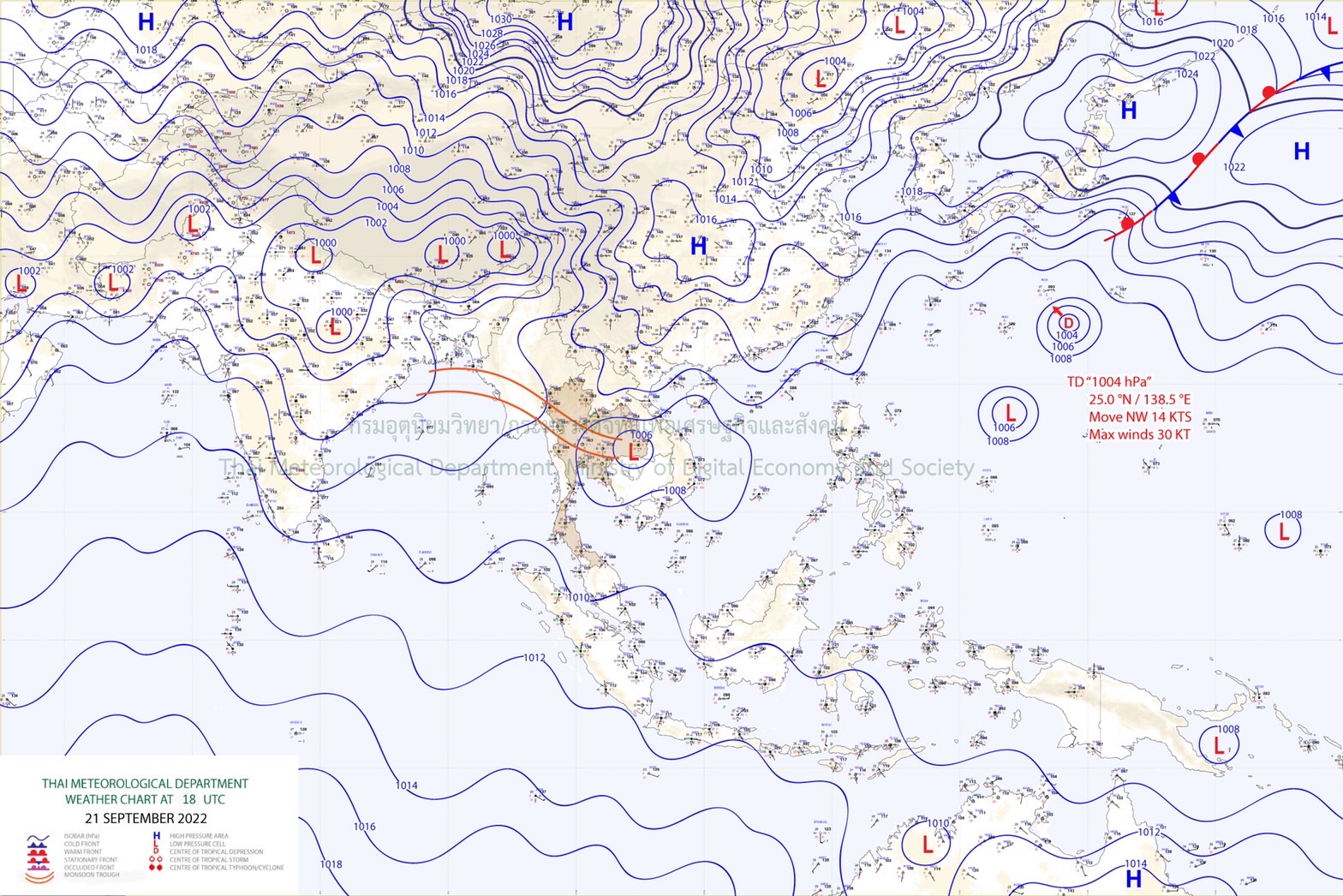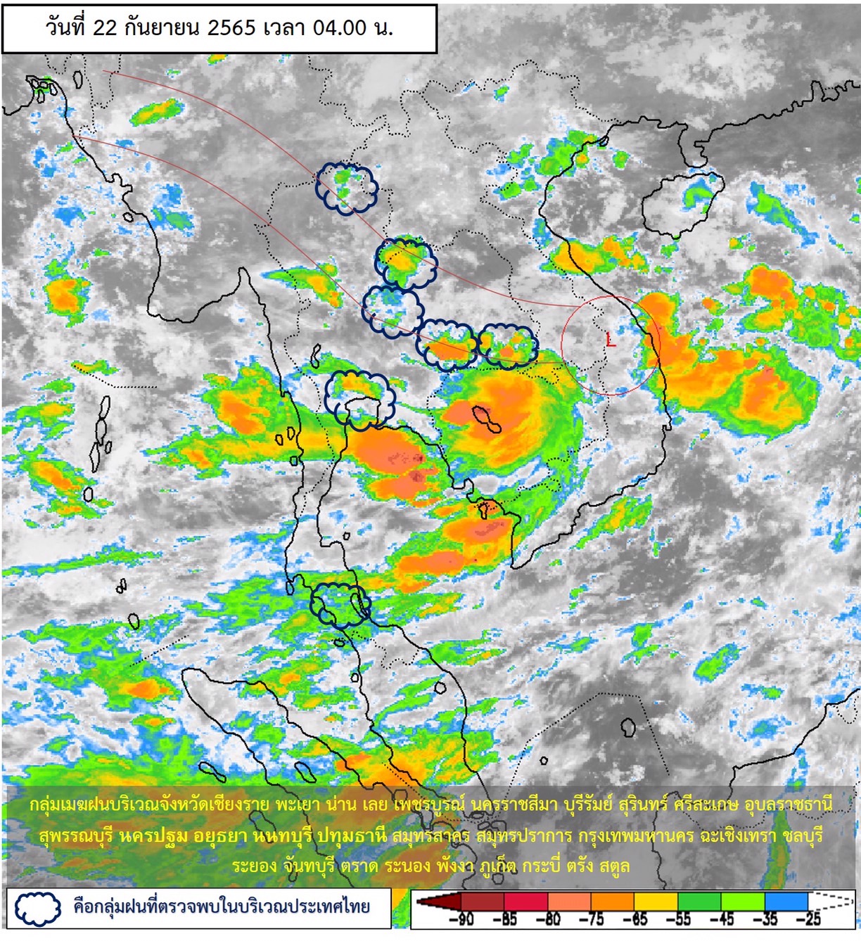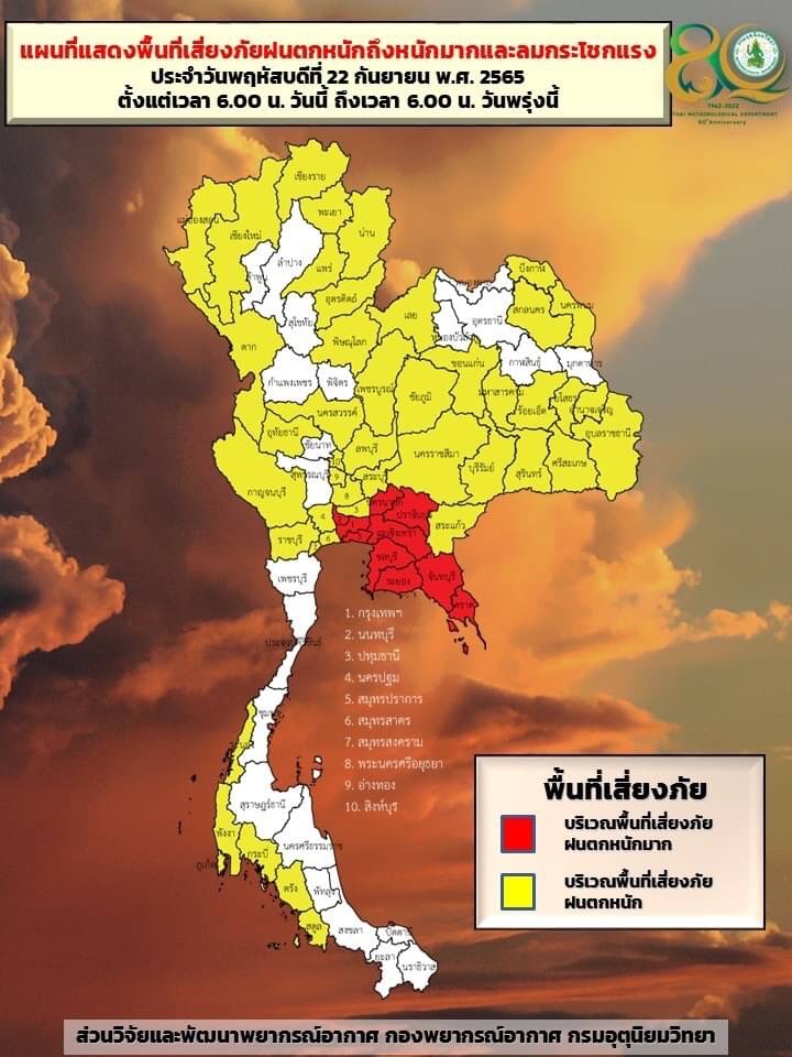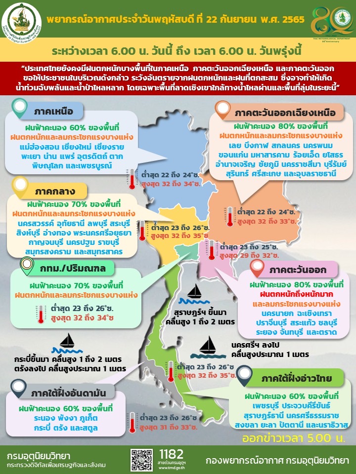 ลักษณะอากาศทั่วไป พยากรณ์อากาศ 24 ชั่วโมงข้างหน้า บริเวณความกดอากาศสูงหรือมวลอากาศเย็นอีกระลอกหนึ่งจากประเทศจีน แผ่ลงมาปกคลุมประเทศลาวตอนบน และประเทศเวียดนามตอนบน ส่งผลทำให้ร่องมรสุมพาดผ่านภาคเหนือตอนล่าง ภาคกลางตอนบน เข้าสู่หย่อมความกดอากาศต่ำบริเวณภาคตะวันออกเฉียงเหนือตอนล่าง ประกอบกับมรสุมตะวันตกเฉียงใต้ ที่พัดปกคลุมทะเลอันดามัน ภาคใต้ และอ่าวไทยมีกำลังปานกลาง ลักษณะเช่นนี้ทำให้ประเทศไทยมีฝนตกหนักถึงหนักมาก กับมีลมกระโชกแรงบางแห่งในภาคเหนือ ภาคตะวันออกเฉียงเหนือ ภาคกลาง รวมทั้งกรุงเทพมหานครและปริมณฑล รวมทั้งภาคตะวันออก ขอให้ประชาชนในบริเวณดังกล่าว ระวังอันตรายจากฝนตกหนักและฝนที่ตกสะสม ซึ่งอาจทำให้เกิดน้ำท่วมฉับพลันและน้ำป่าไหลหลาก โดยเฉพาะพื้นที่ลาดเชิงเขาใกล้ทางน้ำไหลผ่าน และพื้นที่ลุ่มในระยะนี้ไว้ด้วย