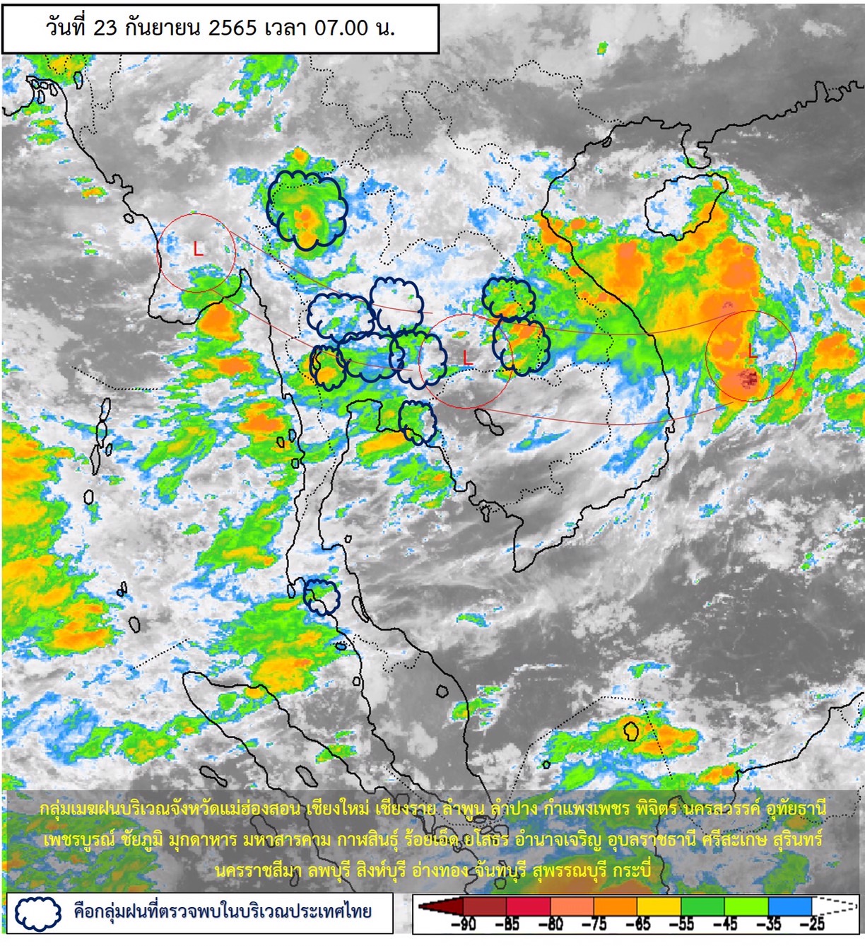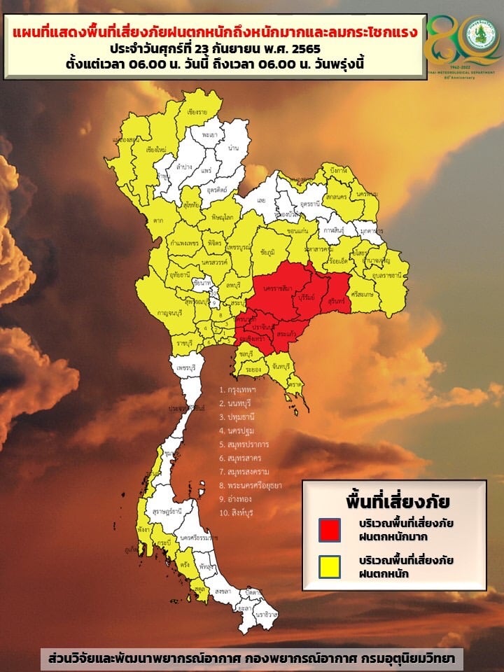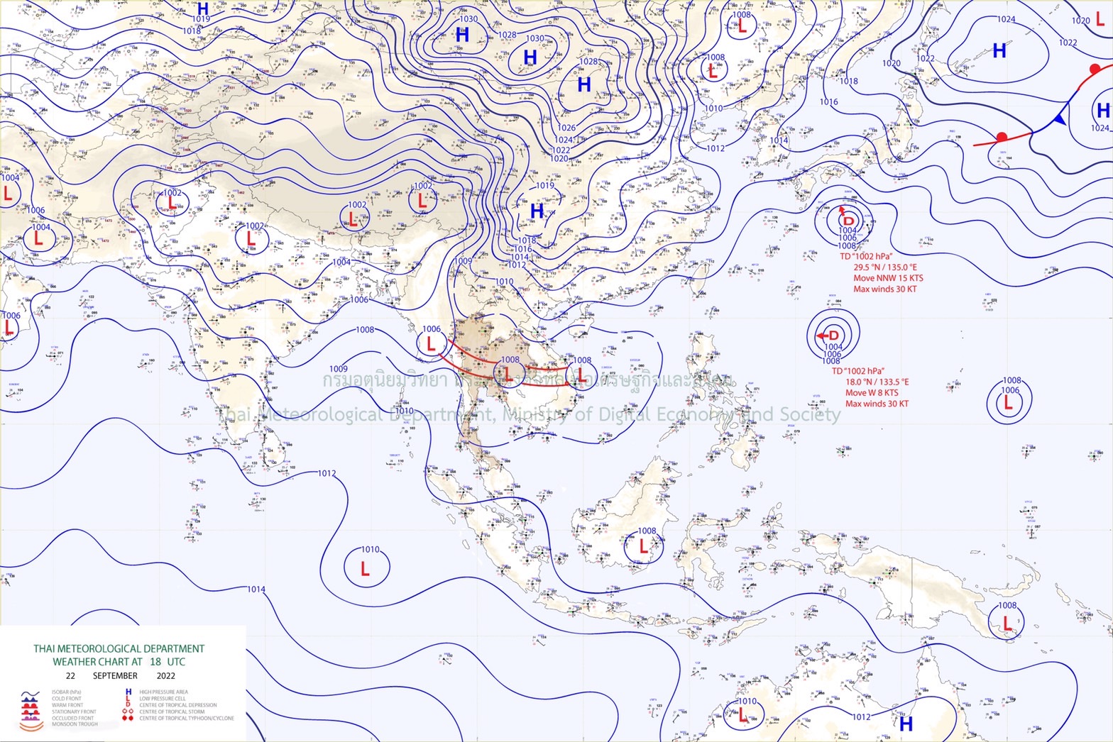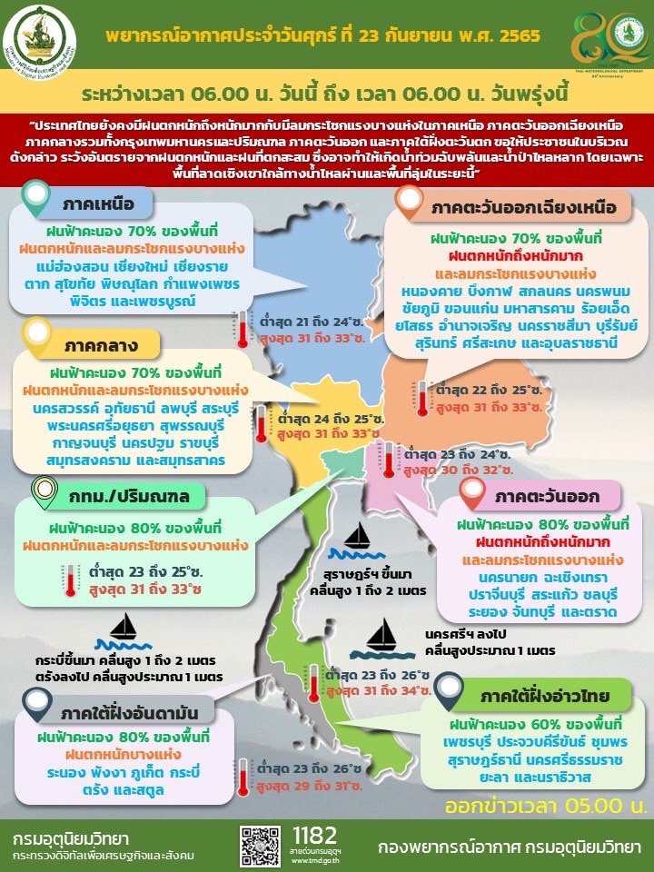 ลักษณะอากาศทั่วไป พยากรณ์อากาศ 24 ชั่วโมงข้างหน้า ร่องมรสุมพาดผ่านภาคเหนือตอนล่าง ภาคกลาง และภาคตะวันออก เข้าสู่หย่อมความกดอากาศต่ำที่ปกคลุมบริเวณภาคตะวันออกเฉียงเหนือตอนล่าง ประกอบกับมรสุมตะวันตกเฉียงใต้ที่พัดปกคลุมทะเลอันดามัน ภาคใต้ และอ่าวไทยมีกำลังปานกลาง ลักษณะเช่นนี้ทำให้ประเทศไทยมีฝนตกหนักถึงหนักมากกับมีลมกระโชกแรงบางแห่งในภาคเหนือ ภาคตะวันออกเฉียงเหนือ ภาคกลางรวมทั้งกรุงเทพมหานครและปริมณฑล ภาคตะวันออก และภาคใต้ฝั่งตะวันตก ขอให้ประชาชนในบริเวณดังกล่าวระวังอันตรายจากฝนตกหนักและฝนที่ตกสะสม ซึ่งอาจทำให้เกิดน้ำท่วมฉับพลันและน้ำป่าไหลหลาก โดยเฉพาะพื้นที่ลาดเชิงเขาใกล้ทางน้ำไหลผ่านและพื้นที่ลุ่มในระยะนี้ไว้ด้วย
